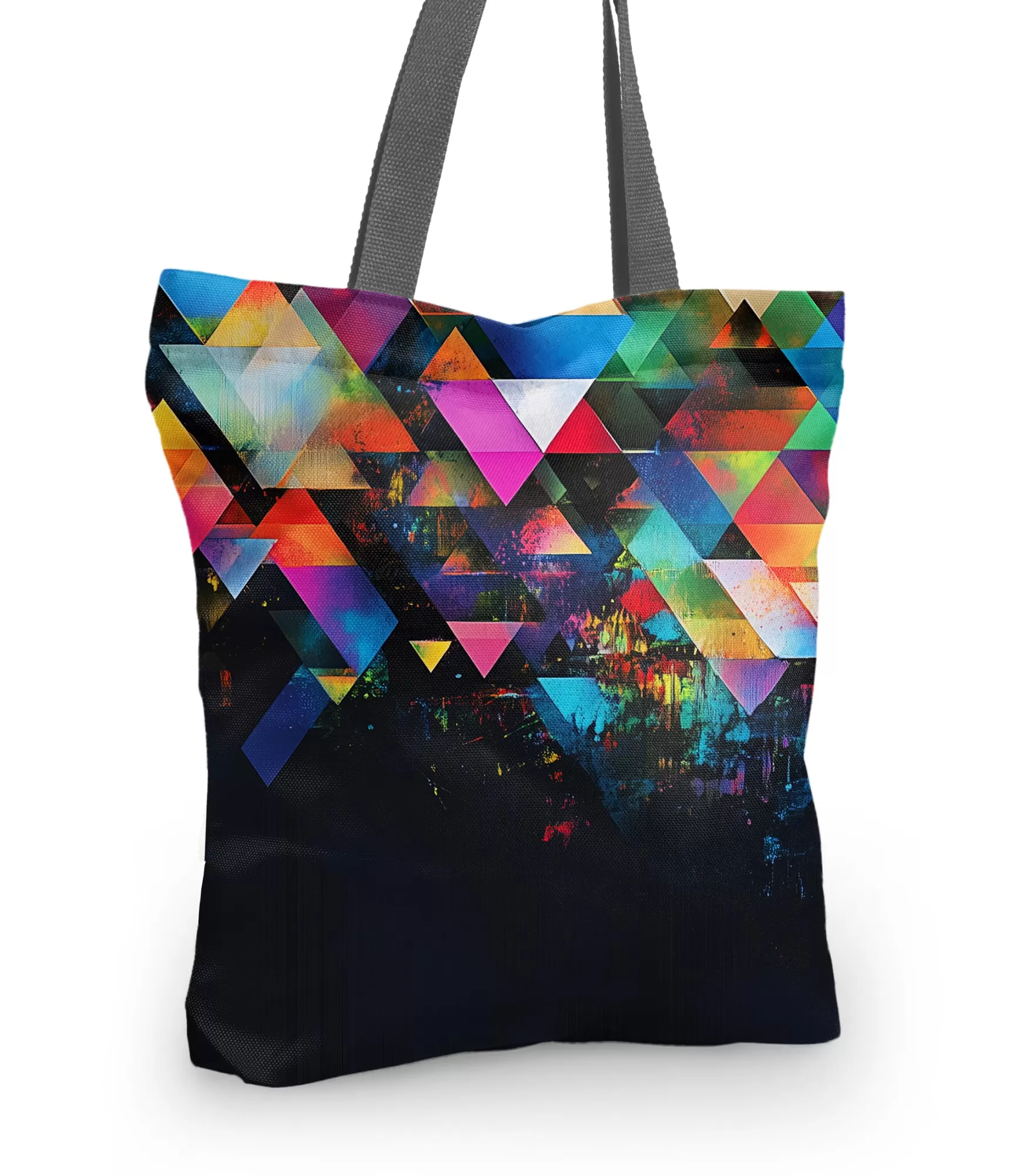 Ši rokassomiņa – tas ir krāsu sprādziens, kas atdzīvojas ik uz soļa. Spilgti trīsstūri – rozā, zilā, dzeltenā, zaļā un purpursarkanā krāsā – kā digitālās pasaules kristāli šgaisma lauž iš pārvēršas un saplūst urbānā abstrakcijā. Tumšais fons uzsver to nokalšanu, un slīpās formas rada sajūtu, it kā krāsas nepārtraukti kustētos. Tas ir pilsētas nakts atspoguļojums – vieta, kur neoni satiekas skaņas un enerģija piepilda katru ģeometrisko līniju.
