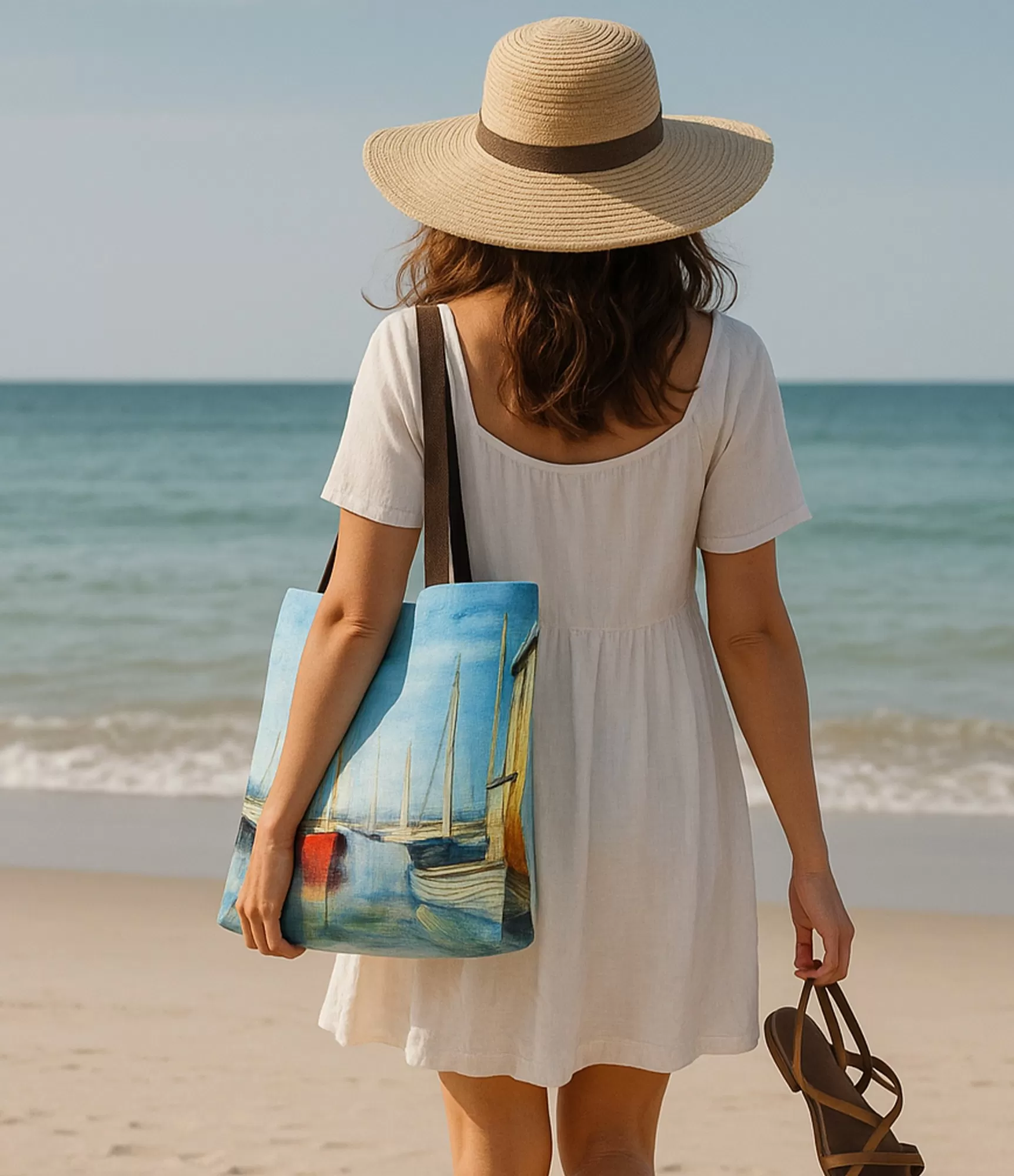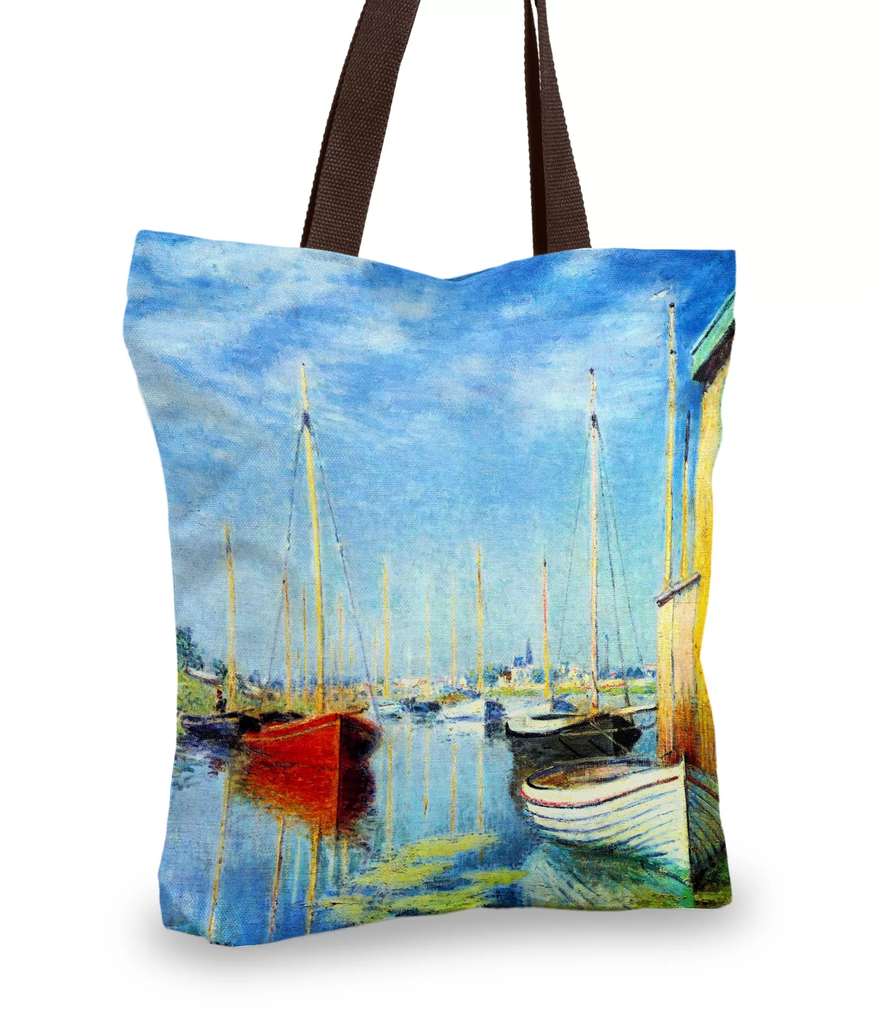 Laivas kuģo Kloda Monē audeklā, taču ššodien tās kuģo kopā ar jums – uz unikālas rokassomas. Šspilgta, skaidra, tikko mākoņaina diena caurstrāvo audumu kā smarža vasaras gaisā. Ūdenī ieplūst zilas debesis, krastā kā akcents klusi stāv sarkana jahta, kamēr citas buru laivas mierā šūpojas. Monē krāsotas švietes – un tagad tā kļūst par jūsu ikdienas sastāvdaļu. Jūras un debesu atspulgi rada bezgalīgu dziļuma sajūtu, un nospiedums tiek atveidots tik reālistiski, ka šķiet, ka jūs plecā nēsājat nelielu muzeju. Otrā pusē – švari, balta, stipra kokvilna. Tas ir paredzēts lietu noturēšanai, bet tajā pašā laikā klusi atgādina: vienkāršība iet kopā ar skaistumu.