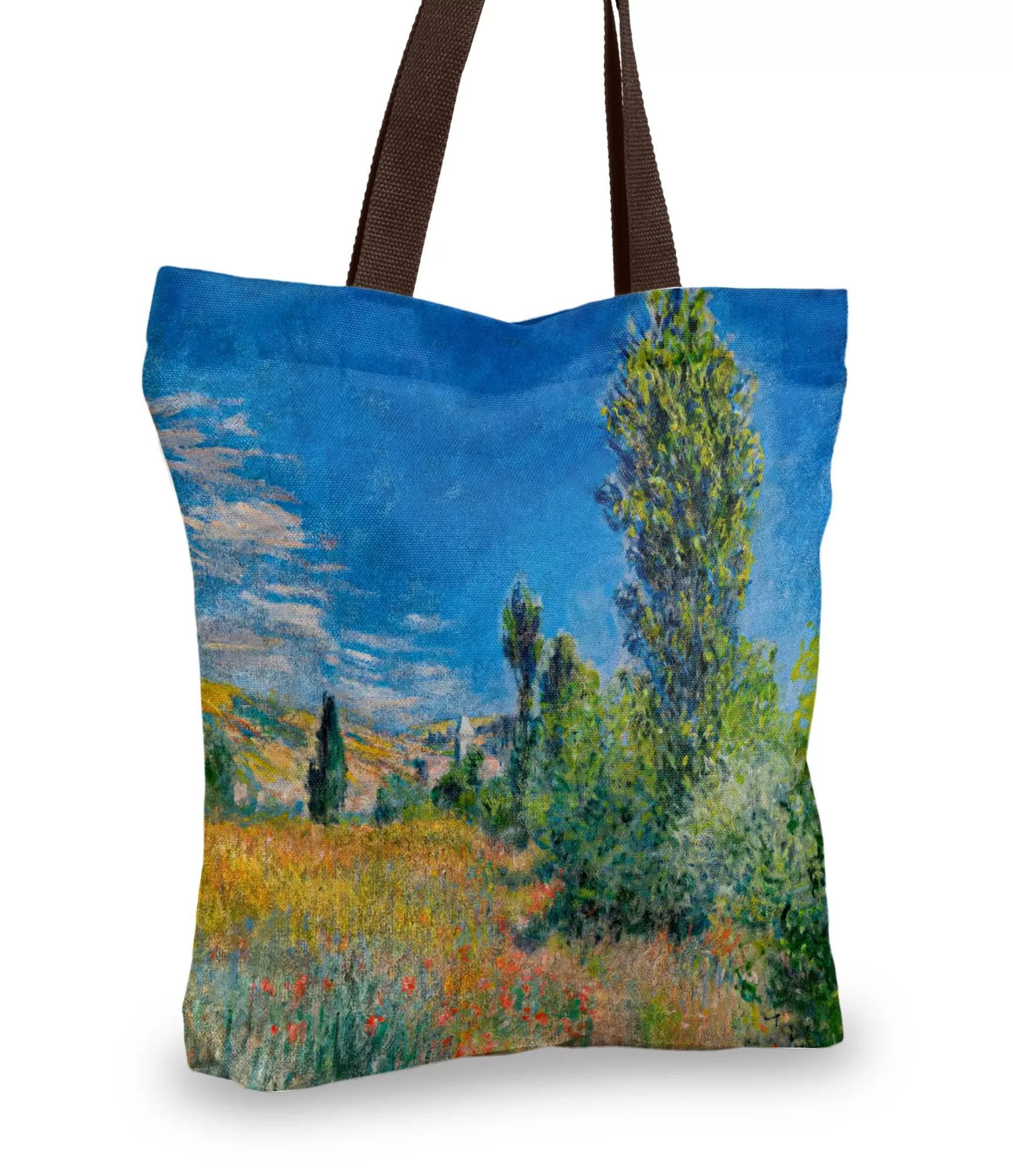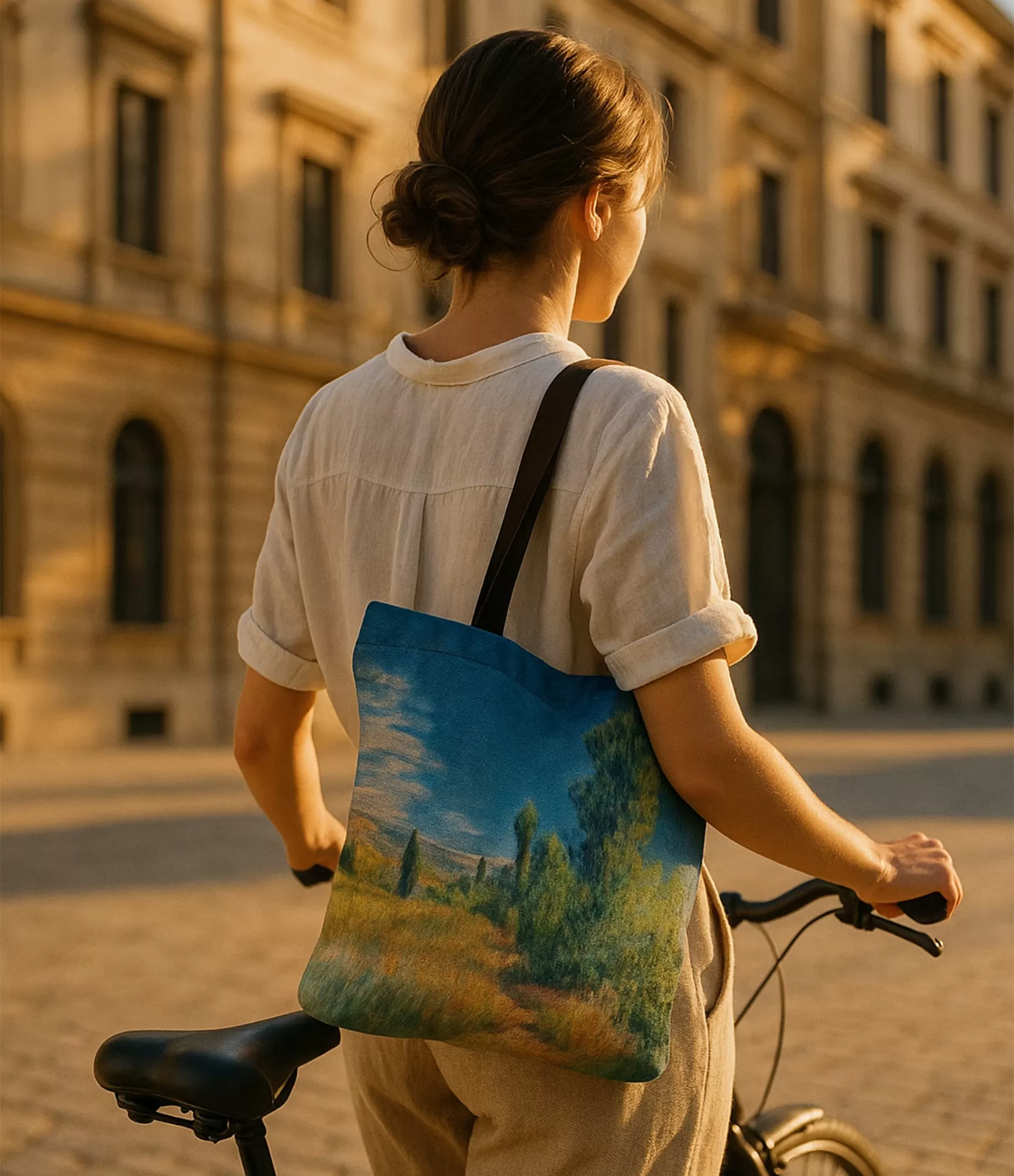 Sieviešu rokassomiņa – kā vasaras elpa. Klods Monē "Ainava uz "Icirc;le Saint-Martin"“ motīvs šeit kļūst nevis par fonu, bet par dzīvu ainavu, kas izstaro kustību, vieglumu un vieglumu. Priekšpusē garas zāles, izkaisītas savvaļas magones, bāli kalnu augi un, protams, koki, kas stipri sniedzas pret debesīm – tas viss ir sacerēts kā himna viesim. Zilas debesis virš galvas ne tikai fonā – tā kļūst par emocijām. Tā nav mierīga daba – tā ir dzīvības pilna vasara.