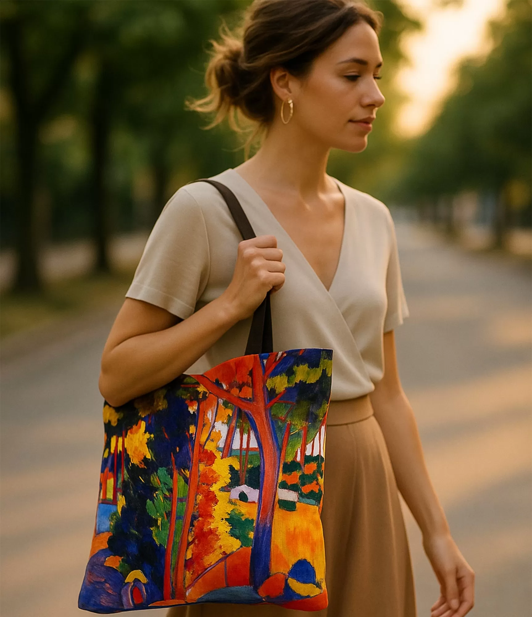 Šis ir kreps, kas apvieno praktiskumu ar estētiku. Nesauksim to tikai par rokassomu – tā ir mākslas galerija, kuru varat nēsāt uz pleca. Un ikviens, kurš paskatīsies, redzēs to pašu, ko André Derain: šspilgta šacs starp kokiem, vēja elpa starp krāsām, pasaule, kas ir dzīva pat tad, kad viss apkārt sastingst.