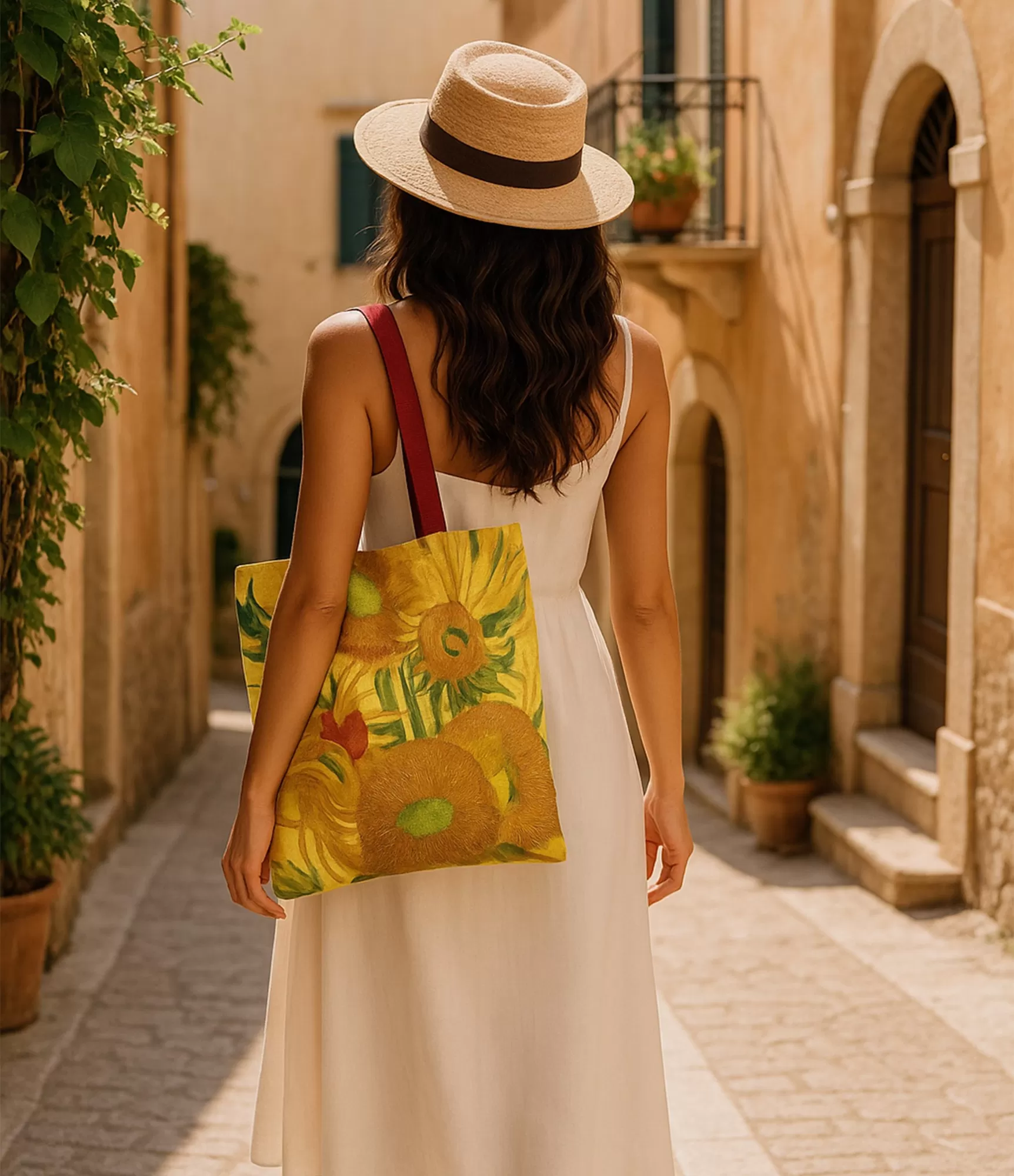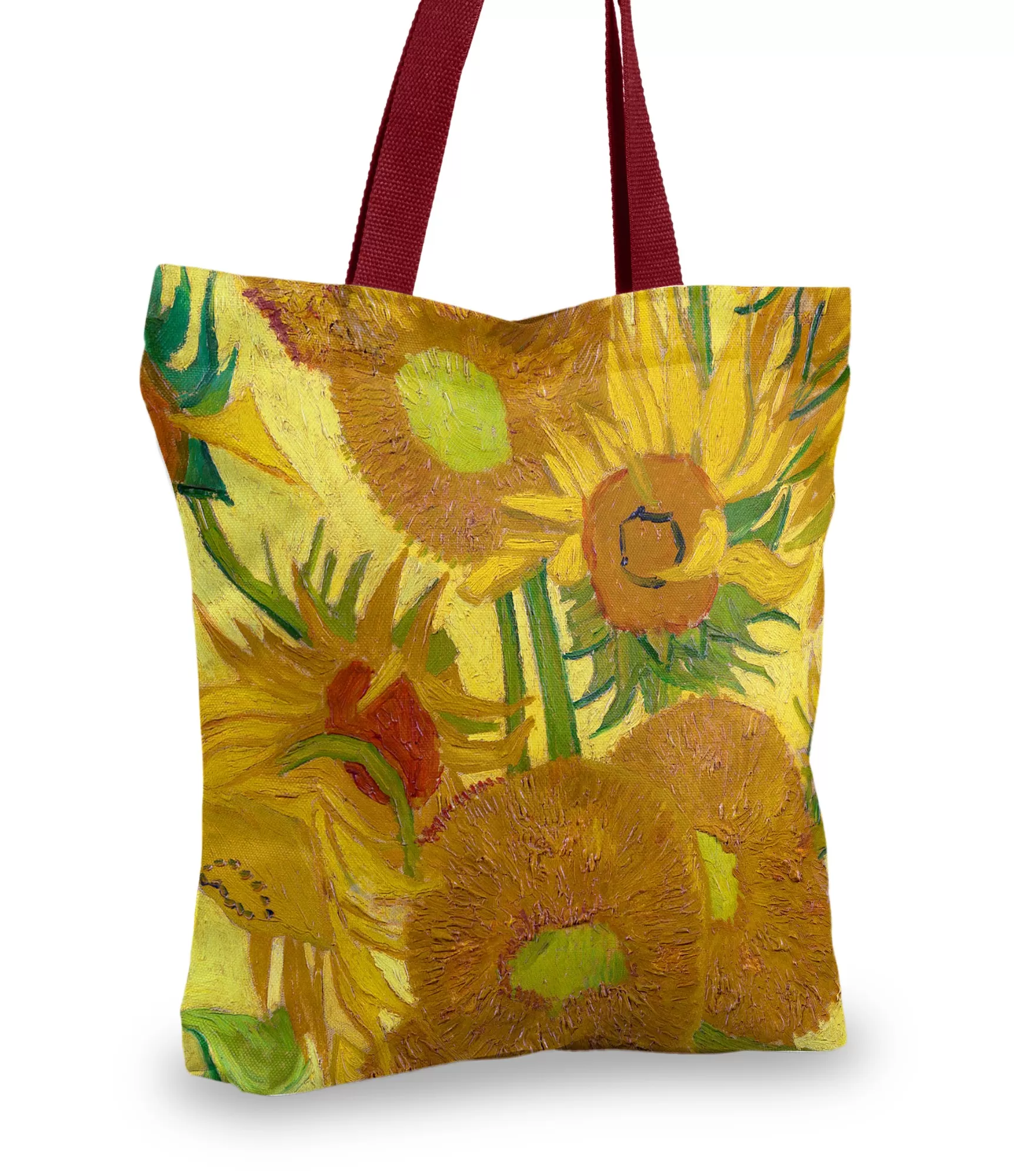 Van Goga leģendārā glezna "Saulespuķes"; ššajā dizainā atdzīvojas jaunā veidā – teksturēti gredzeni, bagātīgi toņi un dinamiska mācība rada siltu, zināmā mērā nostalģisku, bet tajā pašā laikā ļoti pozitīvu iespaidu. Izdruka tiek reproducēta attiecībā pret oriģinālu – katrs gredzens šeit kļūst par krāsainu akcentu, un dabiskās dzelteno un brūno toņu kombinācijas ir iemiesotas praktiskā, bet mākslinieciskā aksesuārā. Tā nav tikai rokassomiņa – tas ir neticams attēls.