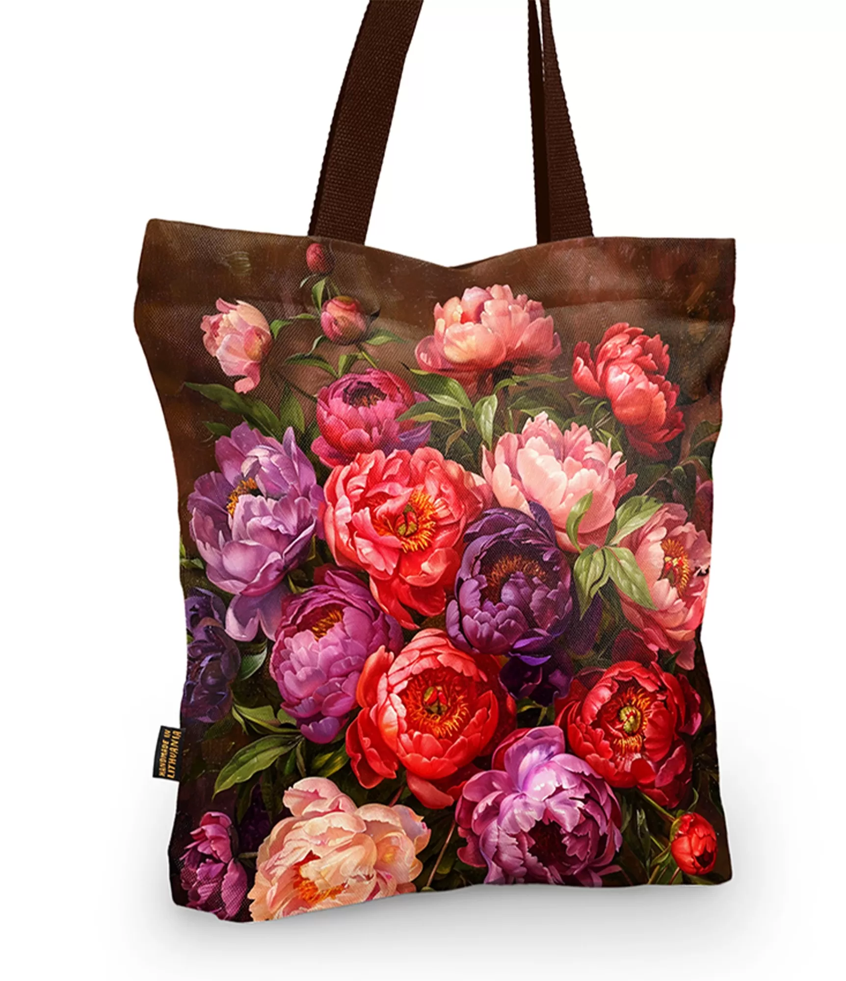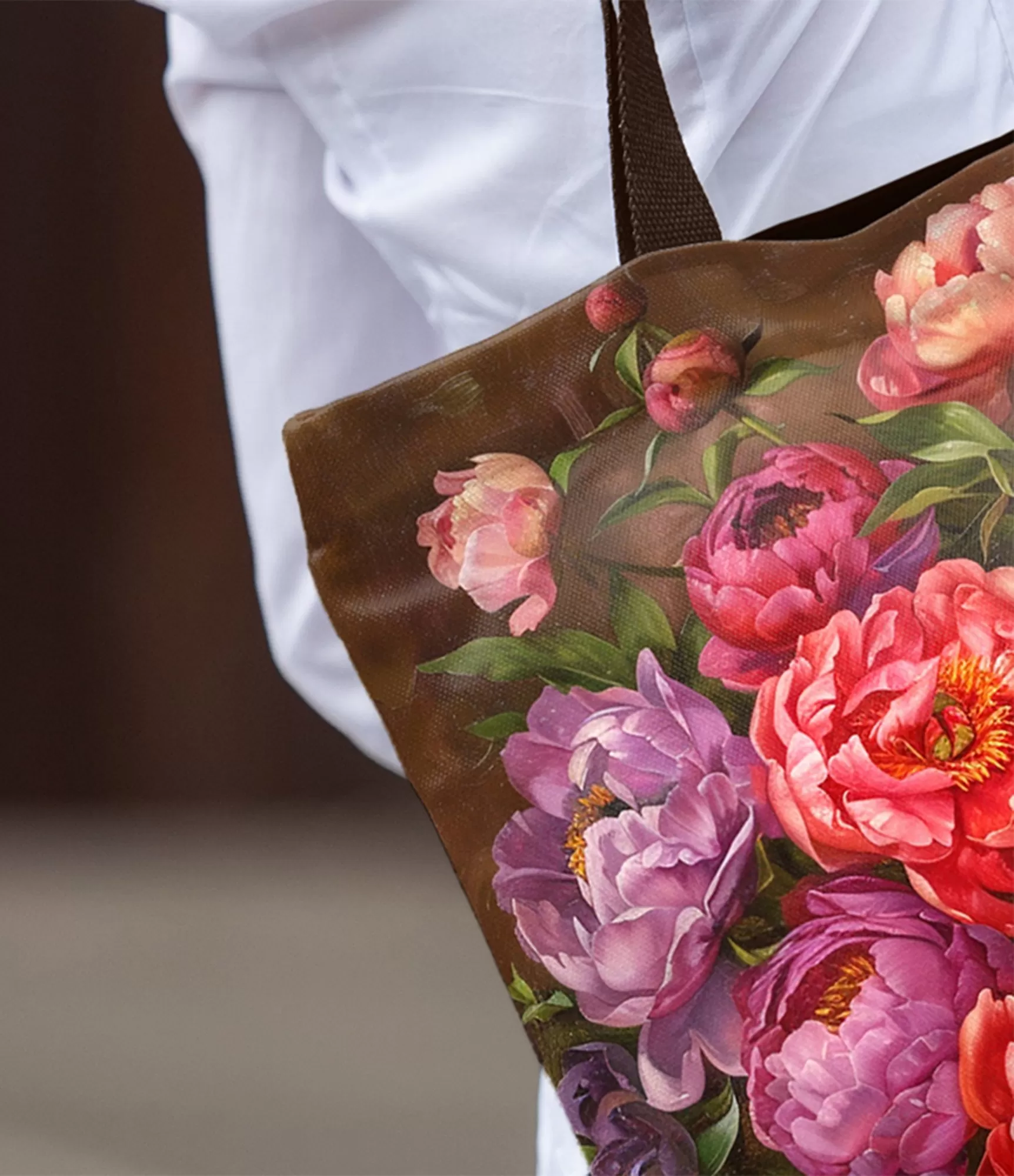 Kad vasaras rīts sākas saules apspīdētā dārzā un gaiss ir piepildīts ar peoniju aromātu, jūs vēlaties saglabāt šo mirkli uz visiem laikiem. Šo sajūtu iemieso sievietes rokassomiņa, kuras dizains pulsē ar ziediem un bagātīgām krāsām. Somai ir bagātīgs peoniju pušķis – no šgaiši persiku līdz piesātināti purpursarkanai, no dziļi bordo līdz izcili sarkanai – it kā sprāgstot no emocijām, aicinot uz ziedu pušķi. Fons ir atlasīts maigi brūnā krāsā – tas pastiprina ziedu intensitāti un rada siltuma sajūtu. Tas ir ne tikai aksesuārs, bet arī mākslas darbs, kas stāsta par spēcīgu sievieti, viņas iekšējo skaistumu un spēju uzplaukt jebkuros apstākļos.