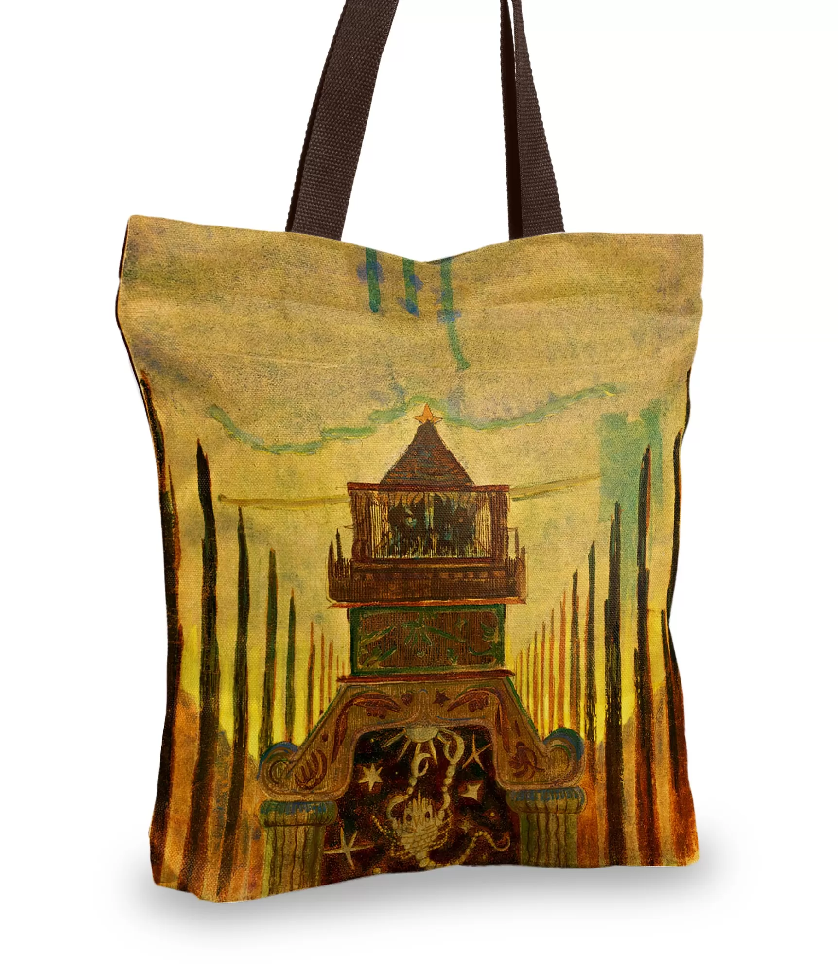 M. K. Čiurlioņa zodiaka cikla iedvesmotās rokassomas atšķiras ne tikai ar savu funkcionalitāti, bet arī ar garīgo dziļumu. „Saule atrodas Skorpiona zīmē“ kompozīcija tiek atveidota uz auduma, nezaudējot ne kripatiņu autentiskuma: brūni zeltaini toņi mirdz kā sveces liesma, un centrālā arhitektūras figūra aicina gremdēties kontemplācijā. š rokassomiņā iemūžinātajai bildei nav dziļas simbolikas – tāpat kā pats Skorpions, tas runā par pārvērtībām, noslēpumiem un iš klusums.