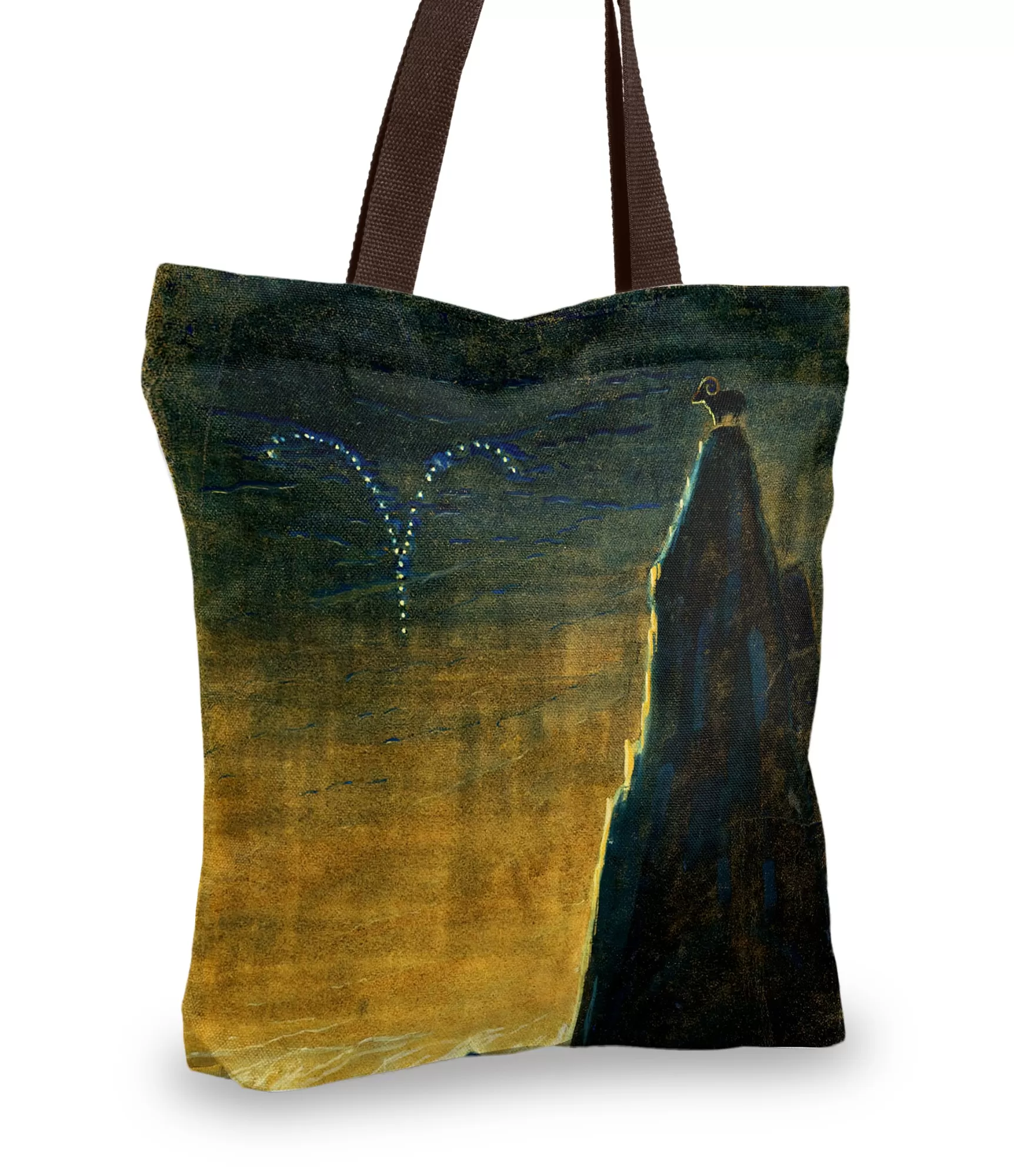 Kad pirmo reizi aplūkojat šia rokassomu, jūsu acis ienirt tumšajā naktī, kas pārvēršas zelta takā. Tajā – M. K. Čiurlioņa glezna „Zodiaks. Saule atrodas Auna zīmē” – iekodēts ne tikai Auna simbols, bet arī spēks, spars, iekšējais kosmoss. šes sievieteška rokassomiņa – ne tikai praktisks ikdienas pavadonis, bet arī maza visuma kapsula, kuru nevar nest uz pleca. Tāda rokassomiņa iš atšķir tā īpašnieku iš pūļi – viņa runā par sievieti, kura nebaidās būt drosmīga, atšķirīga un dusmīga. Šis – mākslas darbs, kas elpo cauri audumam un kļūst par dzīvu stāstījumu par cilvēku.