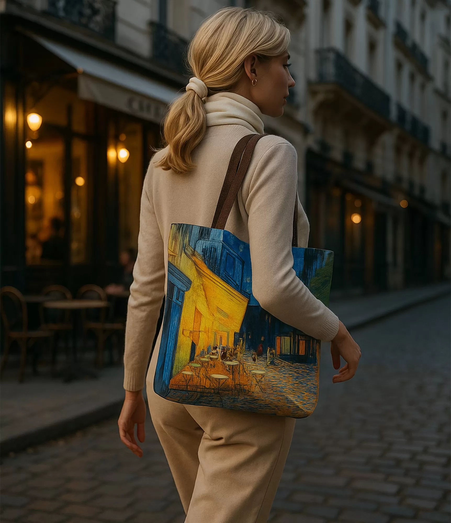 Sieviešu rokassomiņa – kā aicinājums apsēsties zem zvaigznēm, kur škafejnīcas gaisma šnāk ar nakts mieru. Vincenta Van Goga slavenā glezna "Kafejnīcas terase naktī" tika nodota nevis kā tēls, bet gan kā noskaņa. Dzeltenās gaismas izstaro mājīgumu, dziļi zilās debesis mirdz ar mierīgām gaismām, un bruģētā iela ved uz klusu vakaru, pilnu noslēpumaina miera un sarunu atbalsis. Terase naktī“ atmosfēra: kafejnīcas spilgti dzeltenā ēka it kā piepilda visu kompozīciju, un nakts tumšākie toņi līdzsvaro krāsu emociju. Vecpilsētas šaurā ieliņa ieved skatienu dziļāk, aicinot apstāties. Brūnie rokturi šeit ievieš dabisku, šnedaudz zemniecisku toni – viss kopā rada skaistu, māksliniecisku, autentisku iespaidu.