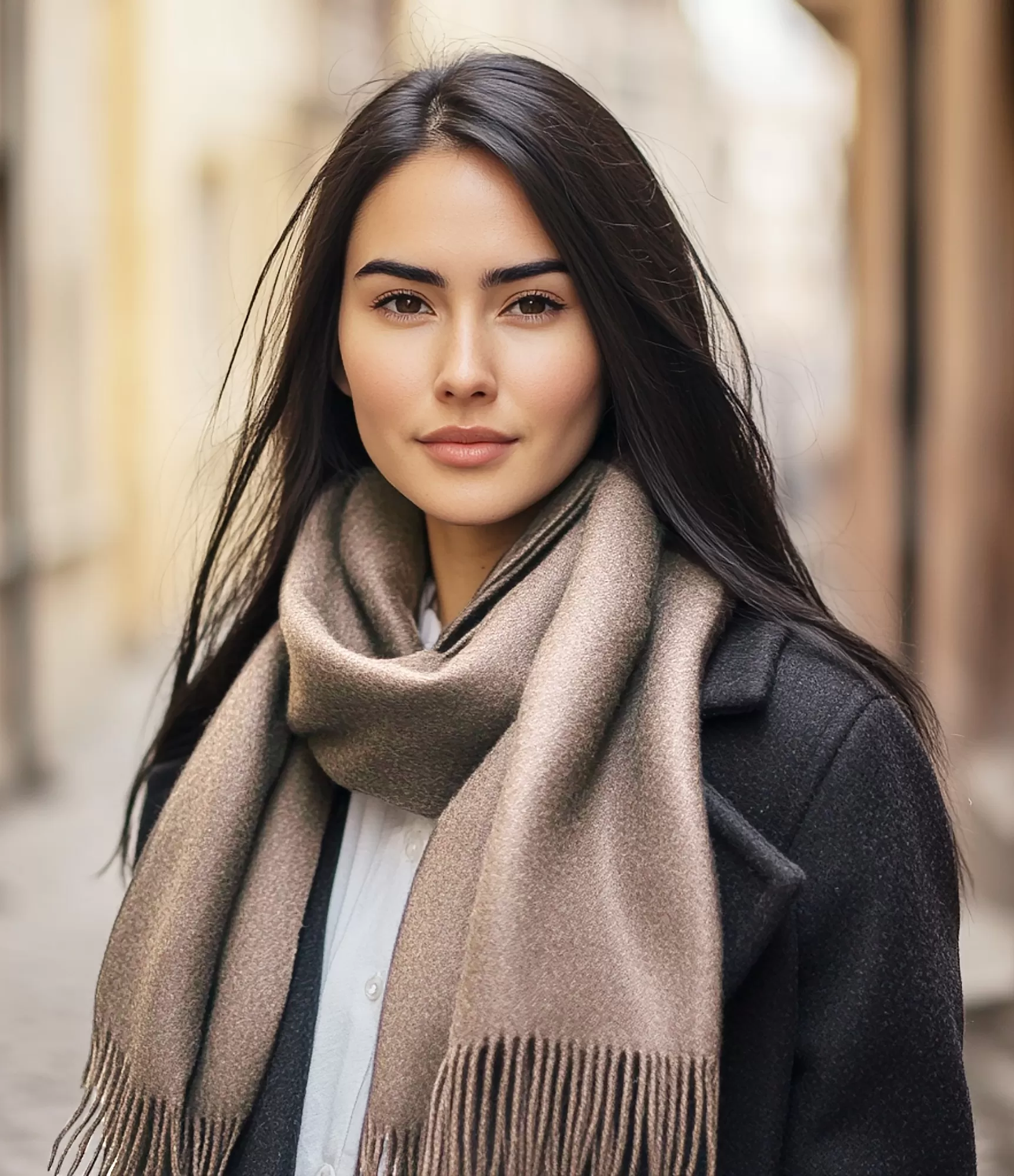 Gaiši brūnas krāsas šalle ir viens no universālākajiem un vieglāk saskaņojamiem aksesuāriem sievietes garderobē. Tā ir smalka, dabisku siltumu radoša krāsa, kas sader gan ar tumšiem, gan gaišiem virsdrēbju toņiem. Šis tonis lieliski piemērots rudenim un ziemai, kad apģērbam gribas piešķirt siltākus, zemīgus un mierīgus akcentus. Šalle skaisti izskatās kombinācijā ar vilnas mēteli, ādas jaku vai ikdienas džemperi – tas ir aksesuārs, kas uzreiz piešķir tērpam vairāk pilnīguma un harmonijas.