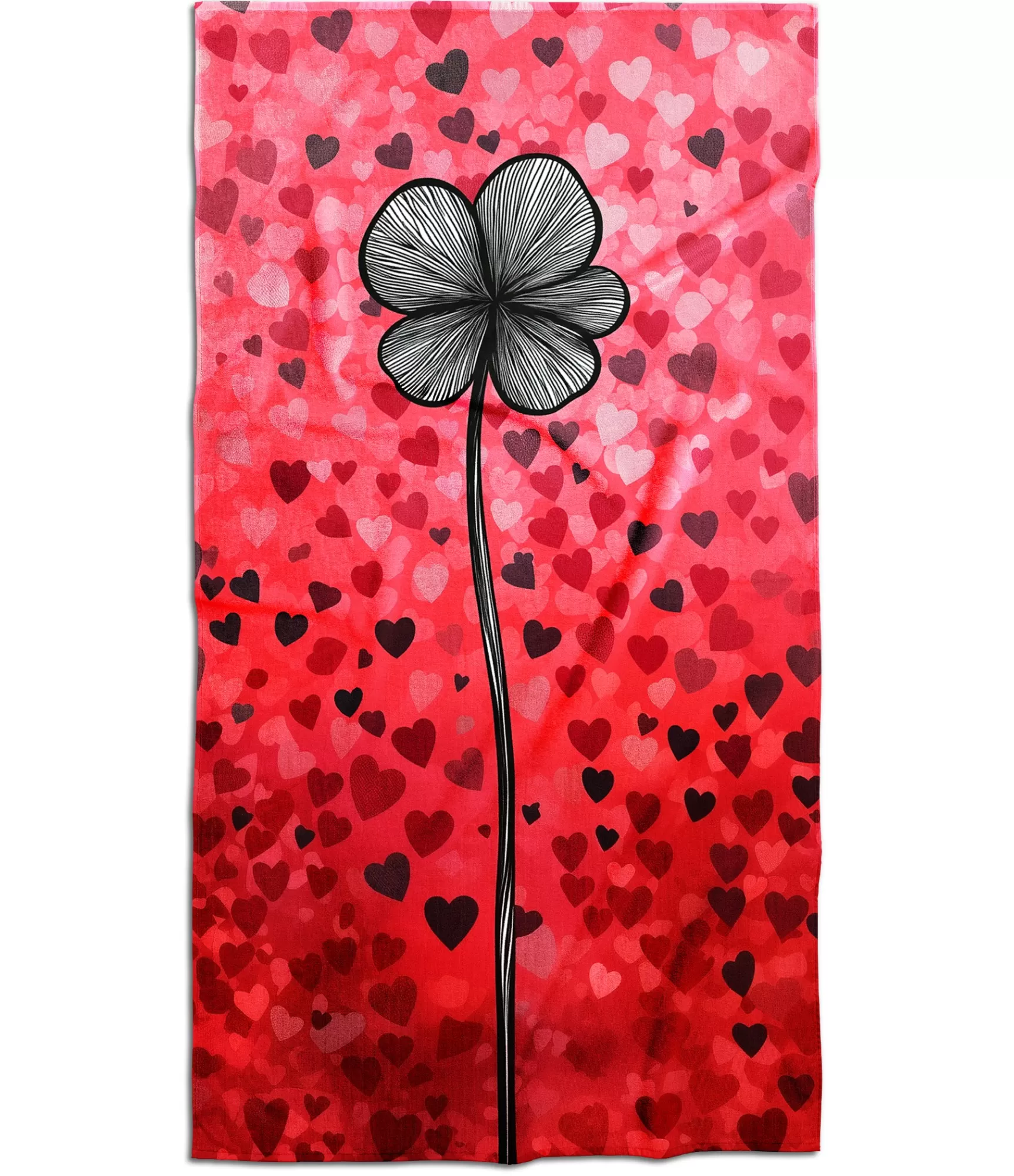Sarkans vannas dvielis ar š sirsniņas un pieclapu āboliņš.