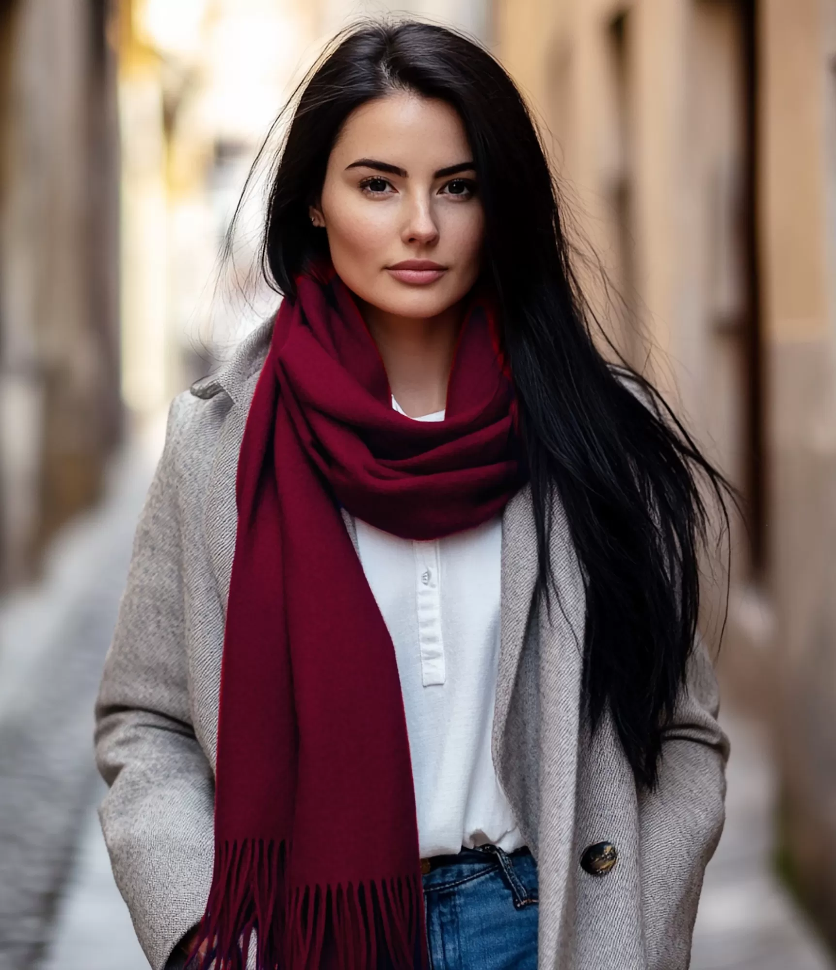 Šalle ir izgatavota no 100 % baby alpaka vilnas, kas tiek augstu vērtēta par īpašu maigumu un komfortu. Tas ir dabīgs šķiedras materiāls, kas patīkami pieguļ ādai, neapgrūtina un nodrošina siltumu bez lieka biezuma. Baby alpaka saglabā kārtīgu izskatu ilgu laiku — nesaveļas, nezaudē formu un saglabā gludumu pat tad, kad šalle tiek nēsāta bieži. Bordo krāsa vēl vairāk izceļ materiāla grezno kritumu un tīro, vienmērīgo tekstūru, tāpēc aksesuārs izskatās īpaši estētiski gan tuvplānā, gan kopējā tēlā.