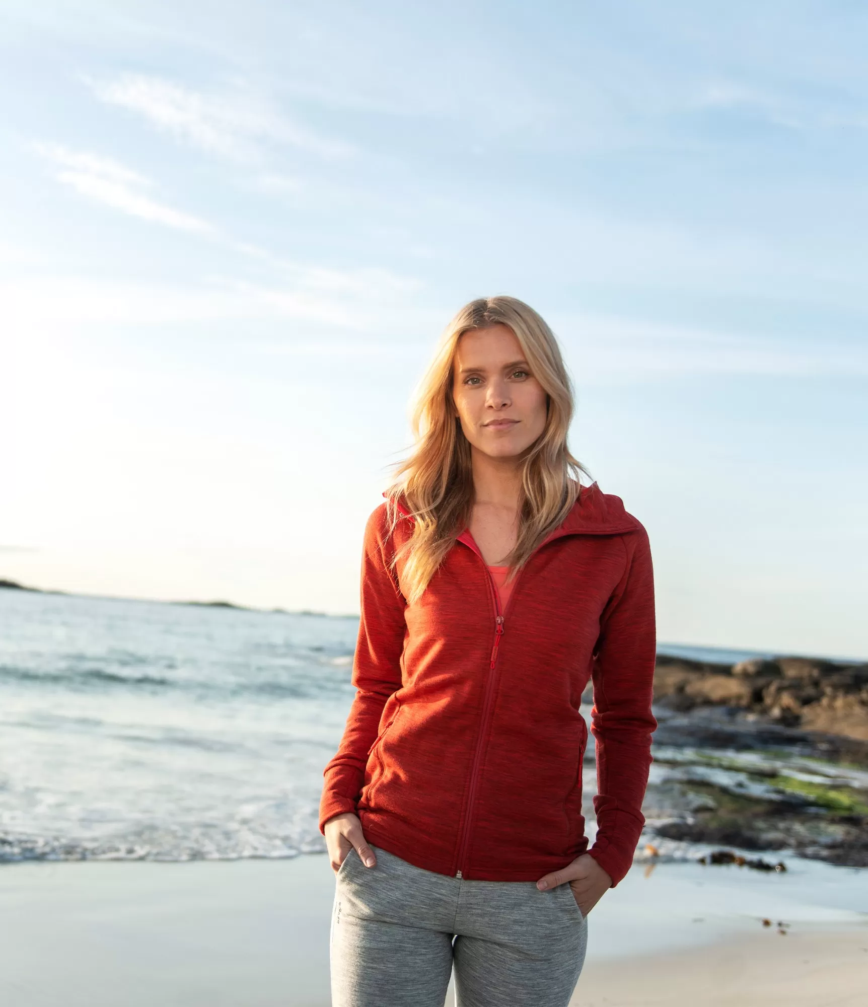 Bagātīgais Beauty sarkanais tonis ir īsts akcents. Tas izskatās eleganti, sportiski un sievišķīgi, tādēļ džemperi ir viegli kombinēt gan ar melnām vai tumši zilām biksēm, gan ar džinsiem vai atpūtas apģērbu. Kontrastējošās, tumšākās aproces piešķir dizainam izsmalcinātību, bet praktiskā kapuce nodrošina aizsardzību pret vēju un aukstumu. Pilna garuma rāvējslēdzējs ļauj pielāgot siltuma daudzumu: džemperi var valkāt kā vieglu virsējo kārtu vai kā siltu vidējo kārtu zem jakas.