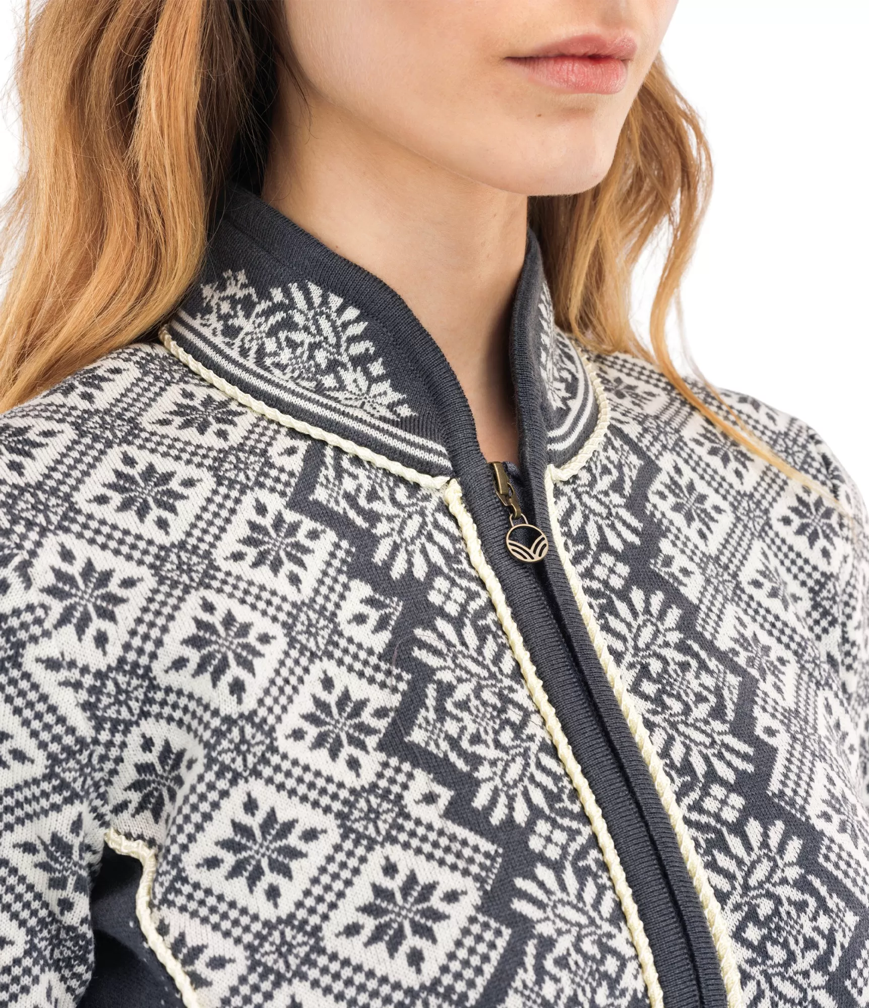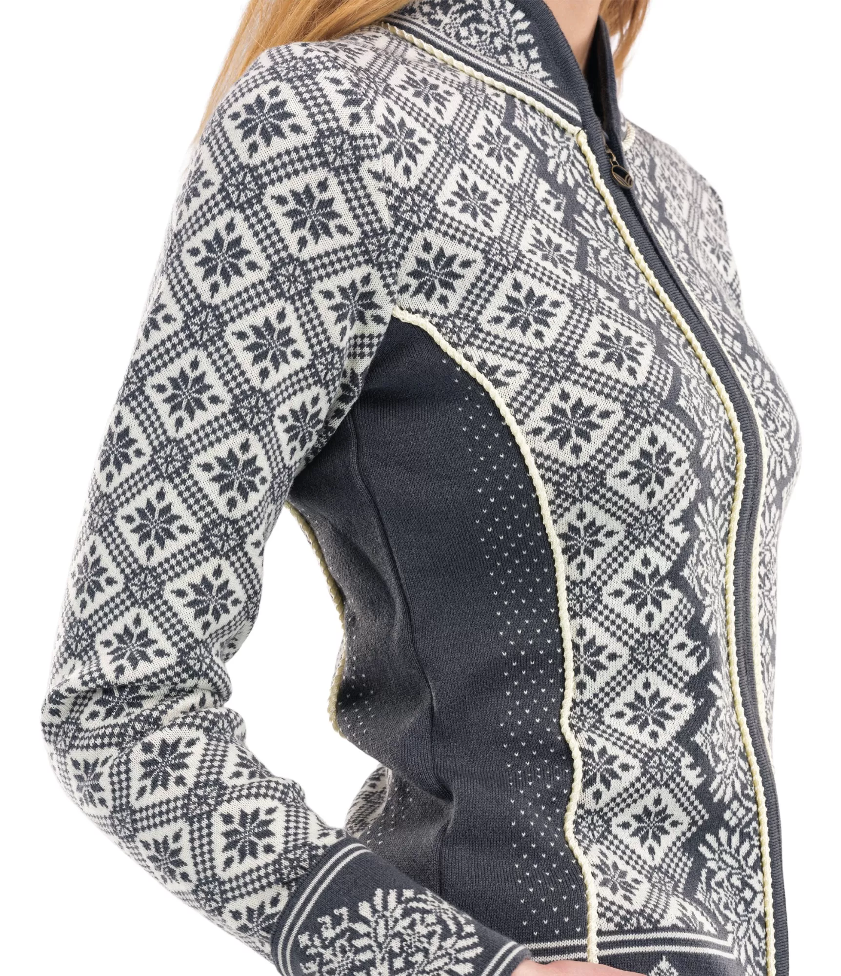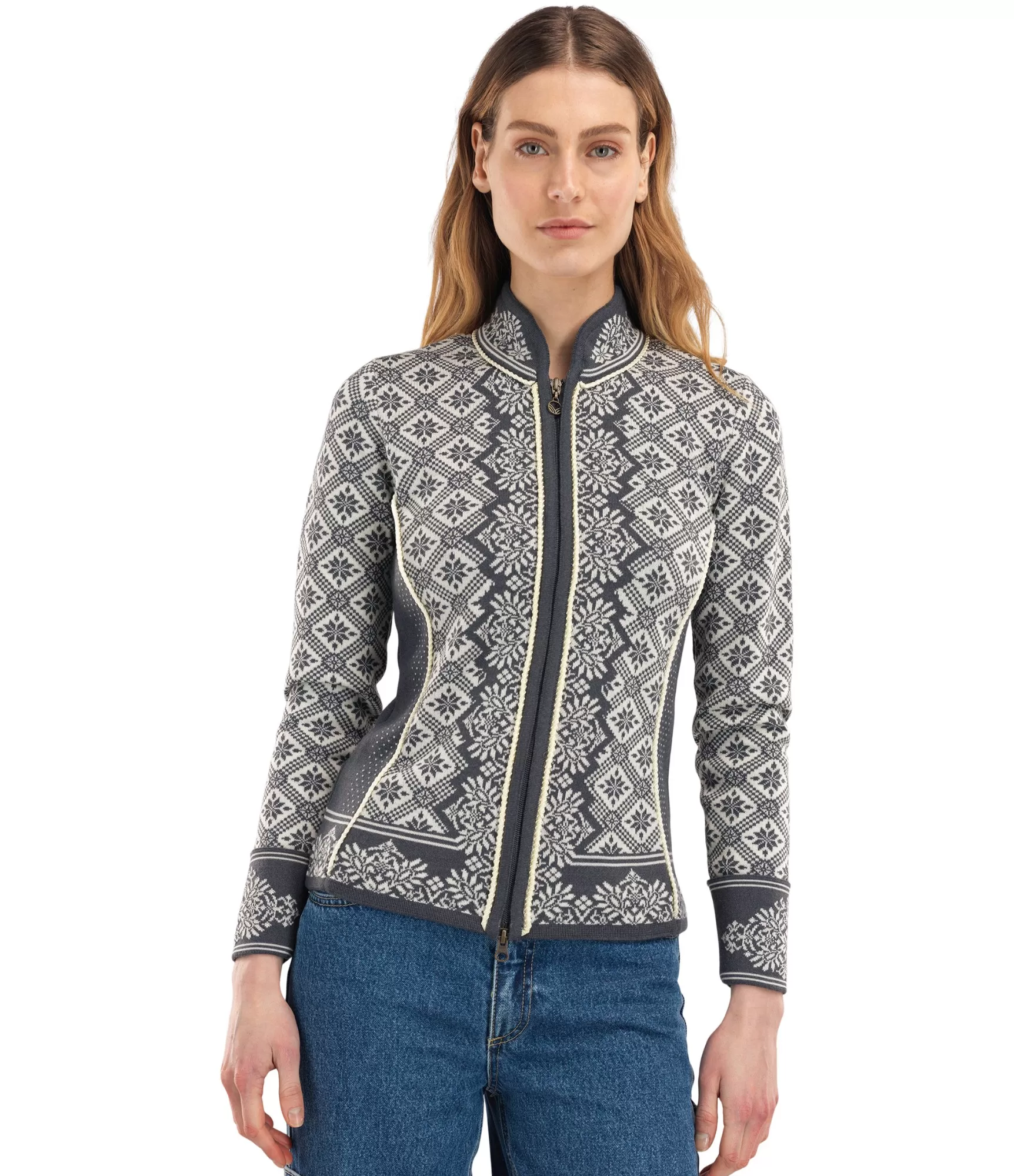 Sieviešu džemperi ar rāvējslēdzēju Christiania 81951 E. Grezna merino vilna no Dale of Norway kolekcijas.