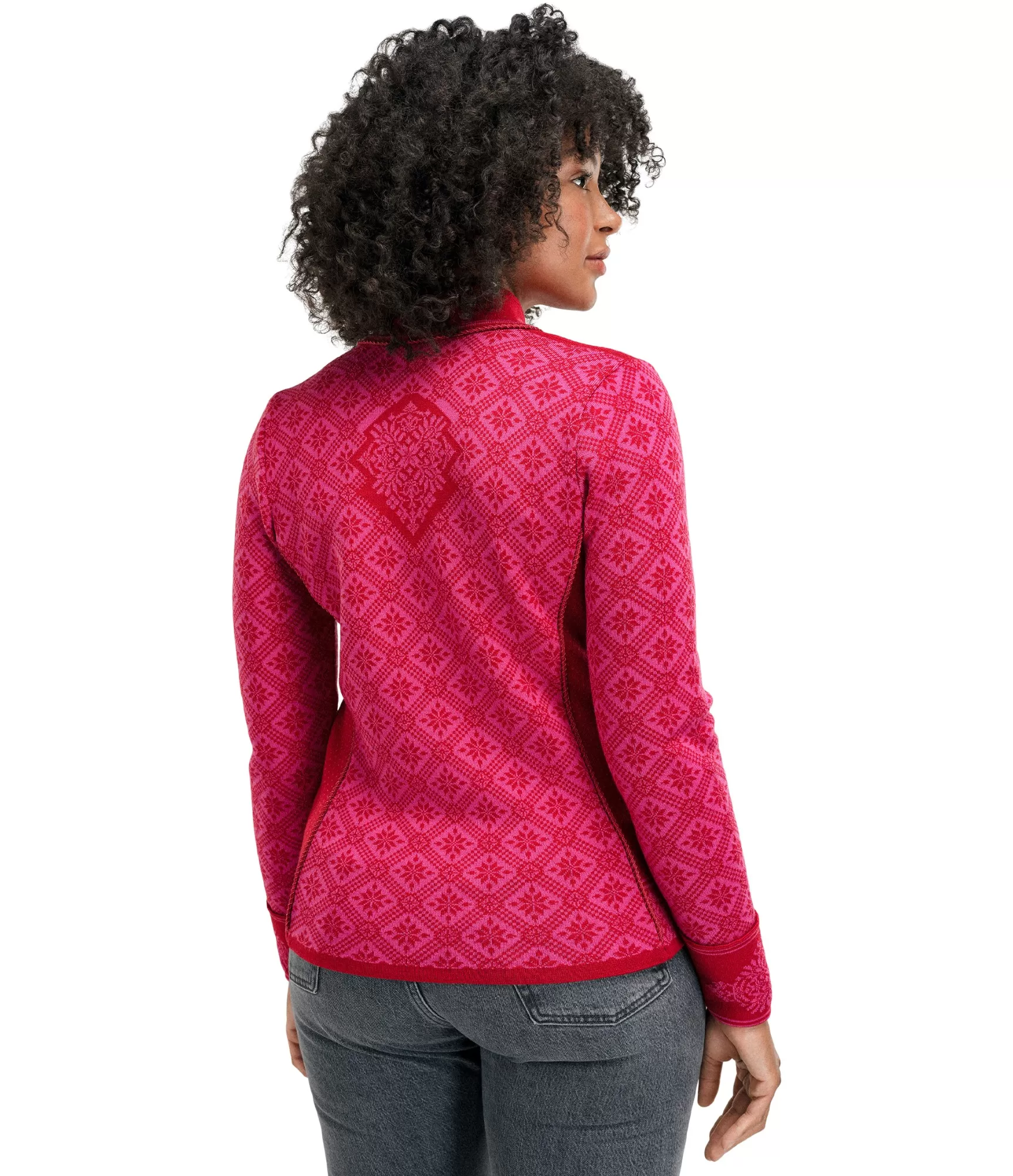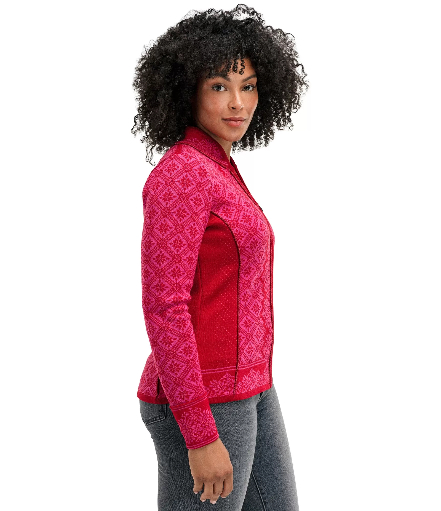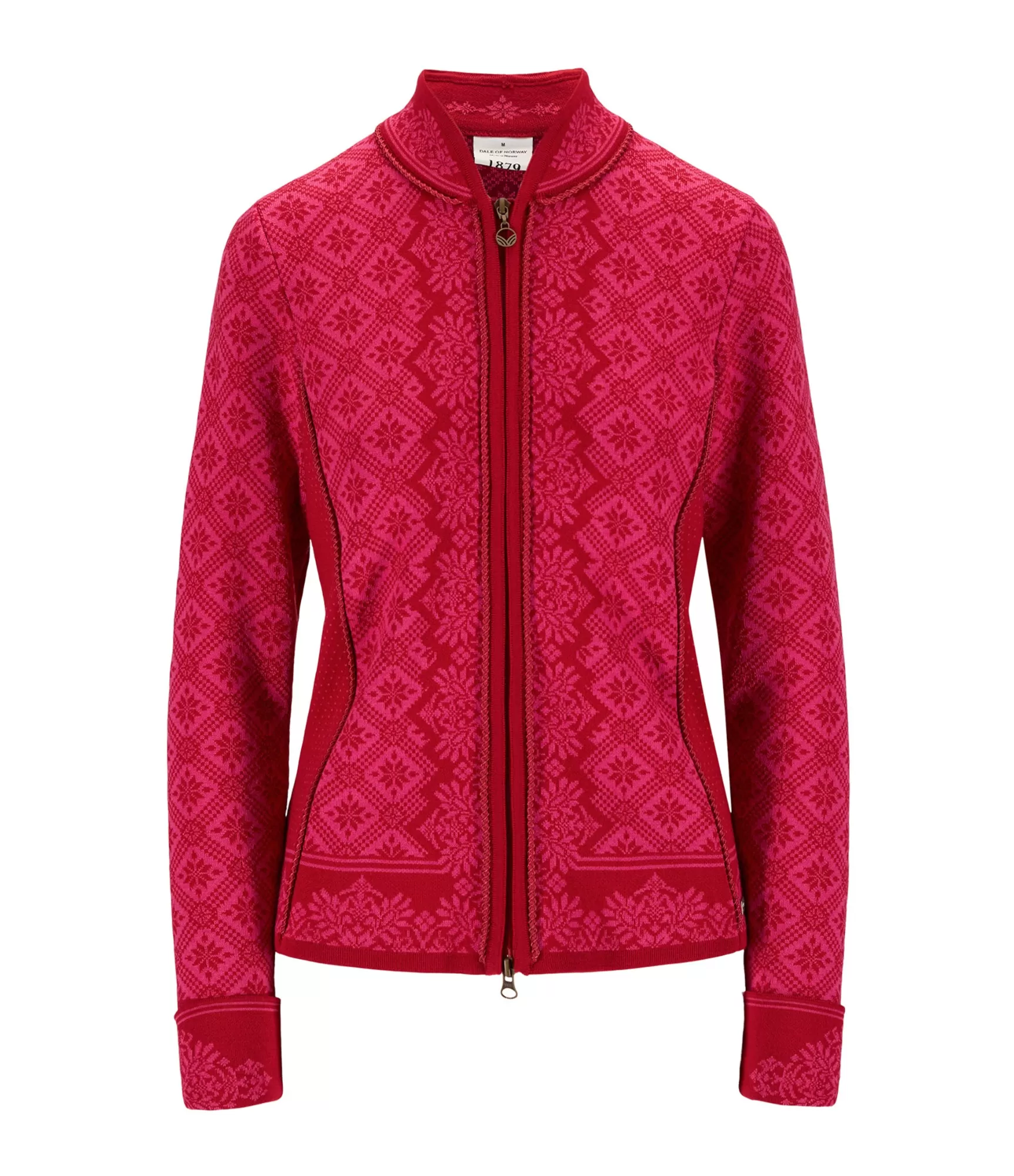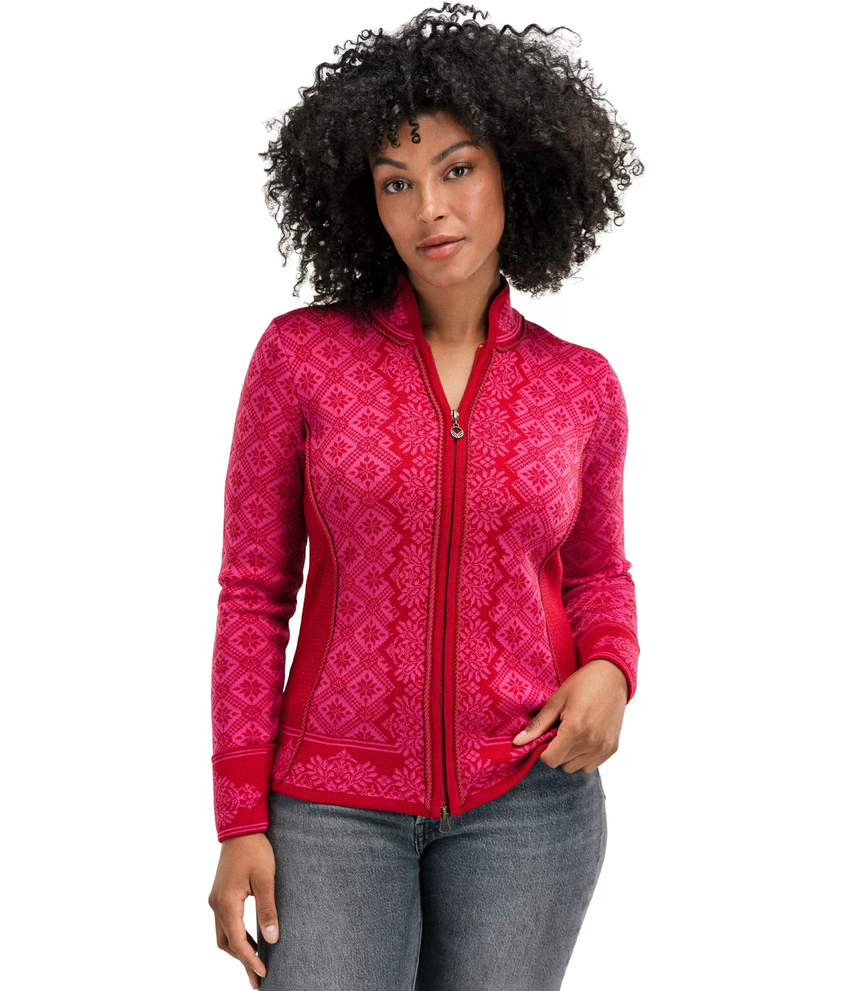 Christiania Fem jakas modelim ir pieguļošs piegriezums ar rāvējslēdzēju, kas atveras abās pusēs. Tas ir ne tikai praktisks, bet arī ļoti skaists apģērbs, kas uzsver sievišķīgās formas. Maigā aveņkrāsas Raspberry Allium krāsa piešķir jakai smalku romantiku, bet tradicionālie norvēģu raksti - laika gaitā pārbaudītu eleganci. Šis džemperis ir piemērots gan ikdienai, gan svētku reizēm - tas labi saderēs ar džinsiem, svārkiem vai klasisku mēteli.