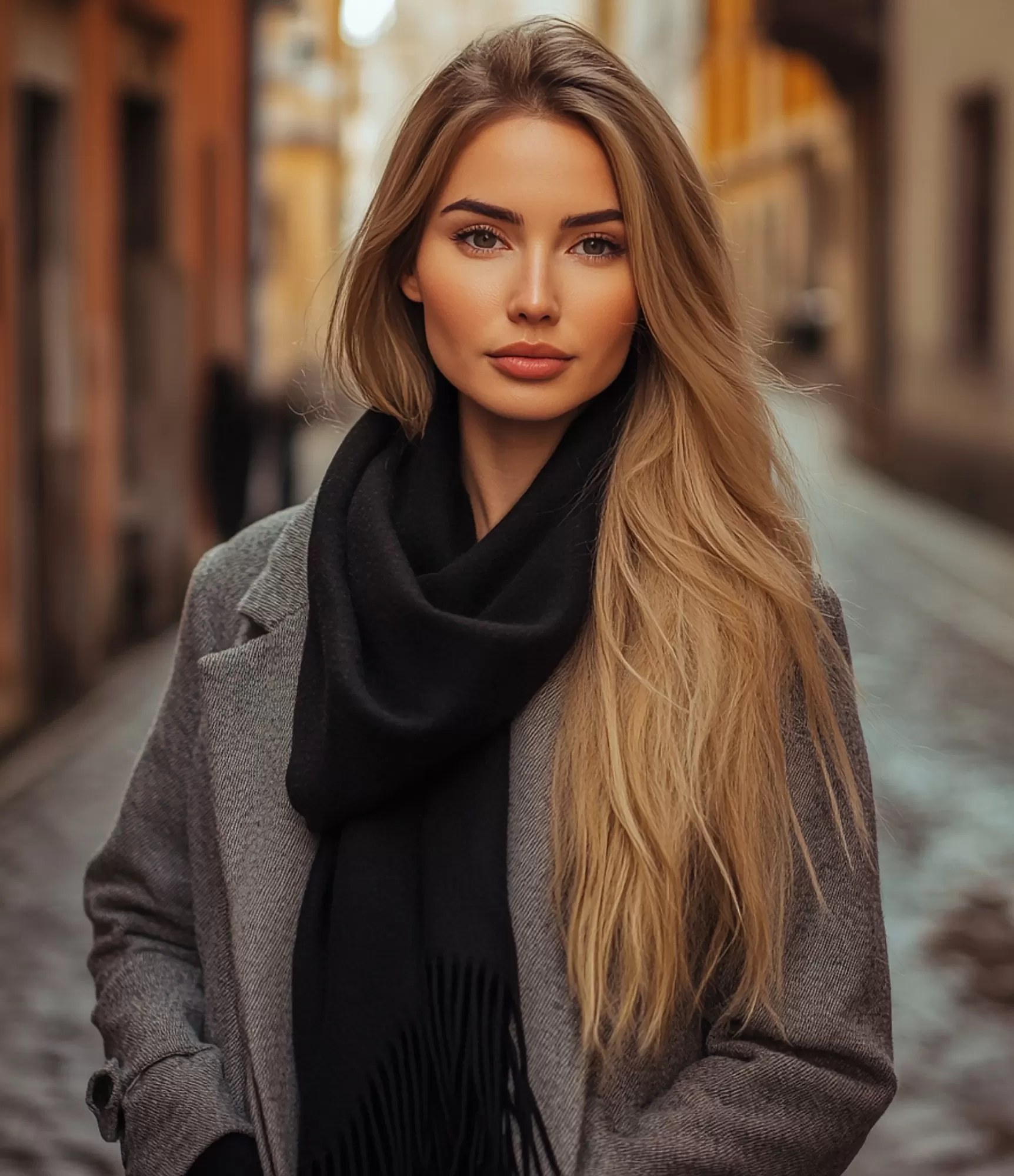 Melna šalle ir viens no universālākajiem un solīdākajiem aksesuāriem, ko sievietes izvēlas tā nepārlaicīgā tēla dēļ. Šis tonis viegli iekļaujas jebkurā garderobē un izskatās nevainojami gan ar gaišākiem, gan ar tumšākiem virsdrēbju toņiem. Melna krāsa piešķir tērpam struktūru, eleganci un skaidrību, tāpēc šāda šalle kļūst par drošu, bet ļoti stilīgu izvēli gan ikdienai, gan īpašiem notikumiem. Tā sader ar pelēkiem, smilšu, brūnganiem, krēmkrāsas, baltiem un ziliem toņiem, bet, izvēlēta kā vienīgais akcents, rada modernu un kārtīgu koptēlu.