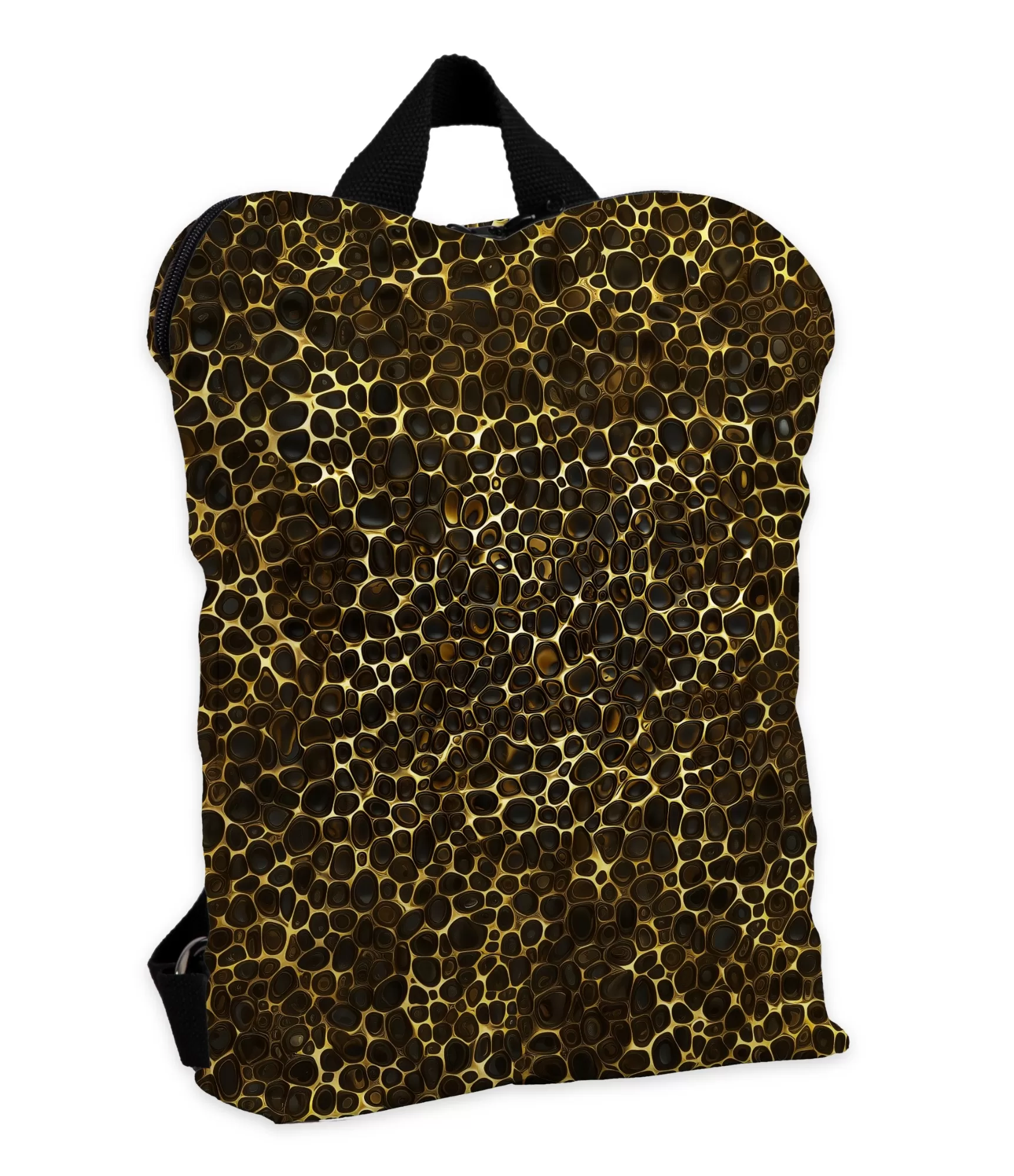 Sieviešu mugursoma piesaista uzmanību ne tikai oriģinālās formas, bet arī unikālā dizaina dēļ, kas atgādina greznu rotaslietu riteni. Tumšās šokolādes un zelta kombinācija rada elegantu, gandrīz hipnotisku efektu, kas mainās atkarībā no gaismas leņķa. Preses motīvs – kā organisks šūnu tīkls, kurā katra veido – kā miniatūrs mākslas darbs. Tas nemaz nav ritenis – tā ir dzīva, pulsējoša virsma, kas absorbē skatienu un aicina skatīties ilgāk.