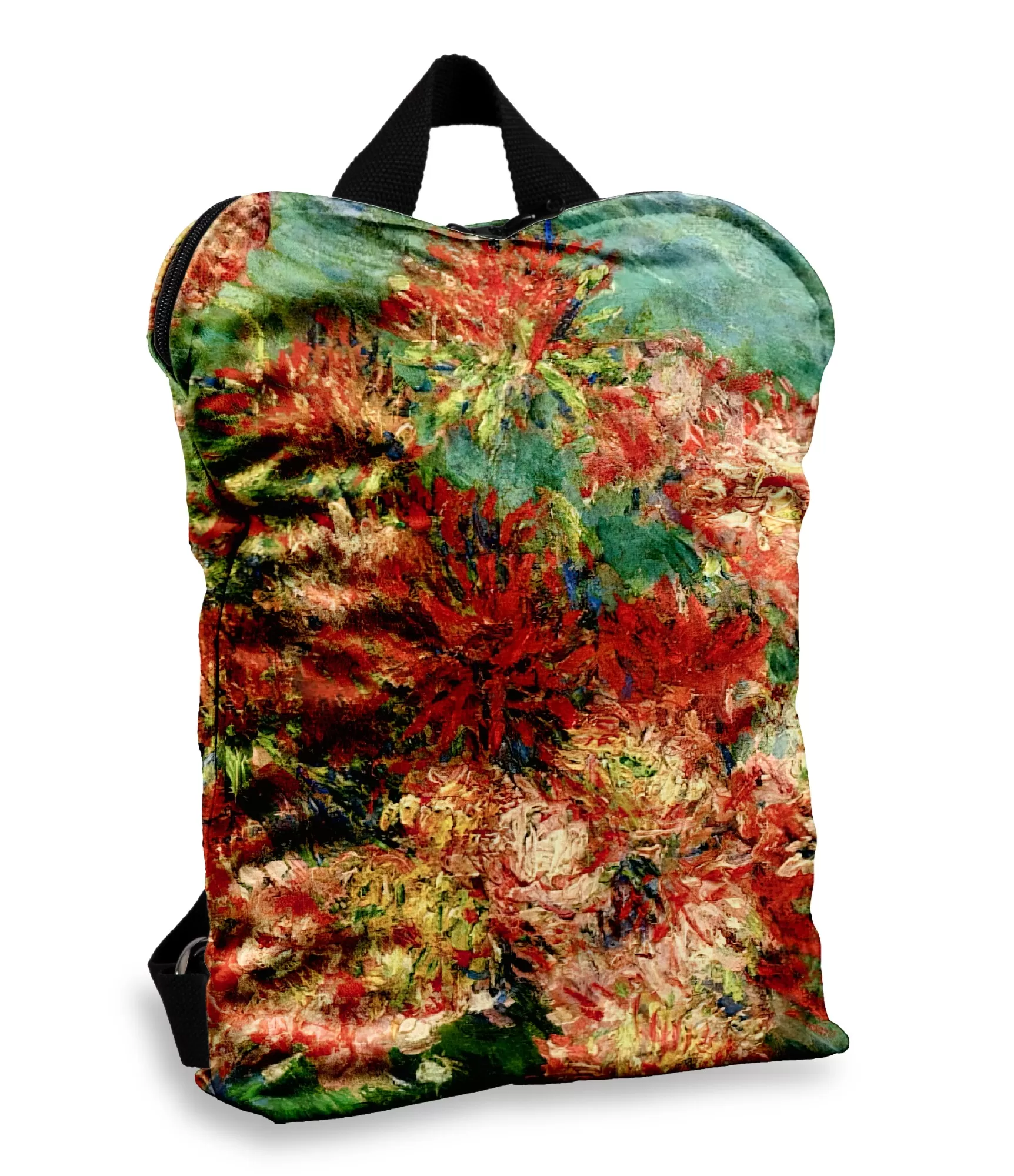 Klods Monē – impresionisma meistars, kura glezniecībā ne tikai attēlota daba, bet arī nodota noskaņa. „Vāze ar krizantēmām“ – tā nav vienkārši ziedu klusā daba, bet gan mierīgs, krāsains klusums. Ššajā darbā ziedi mirdz dažādās krāsās – no balta līdz ceriņam – radot emocionālu fonu, kas, pārnests uz mugursomu, kļūst par pastāvīgu mākslas darbu.