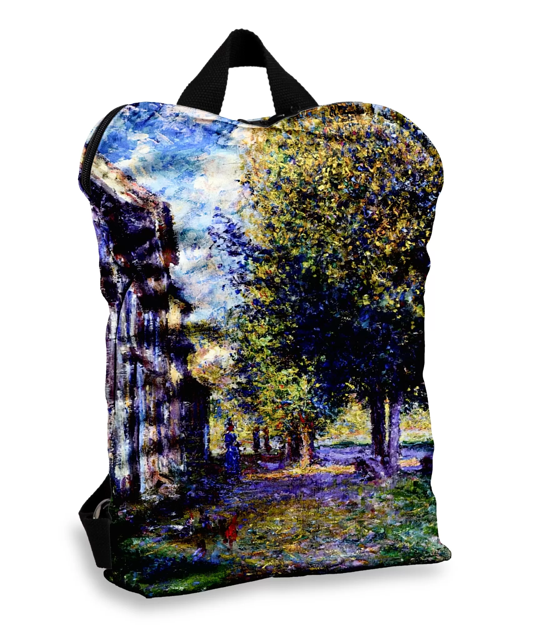 Sēnas upes krasts Lavakurtā, ko gleznojis Klods Monē – tā ir ārkārtīgi smalka dabas ainava, kur krāsas, ūdens atspulgi un gaismas spēles pārvēršas meditācijā. Attēls uz mugursomas virsmas atveidots ar apbrīnojamu precizitāti: brūngani zeltaini krasti, bāli zilgani toņi, mākoņainās debesīs rietošas saules atspulgi. Tas viss pārvēršas par dzīvu attēlu, ar kuru jūs nedalāties ar sevi – katru dienu, katrā pilsētā.