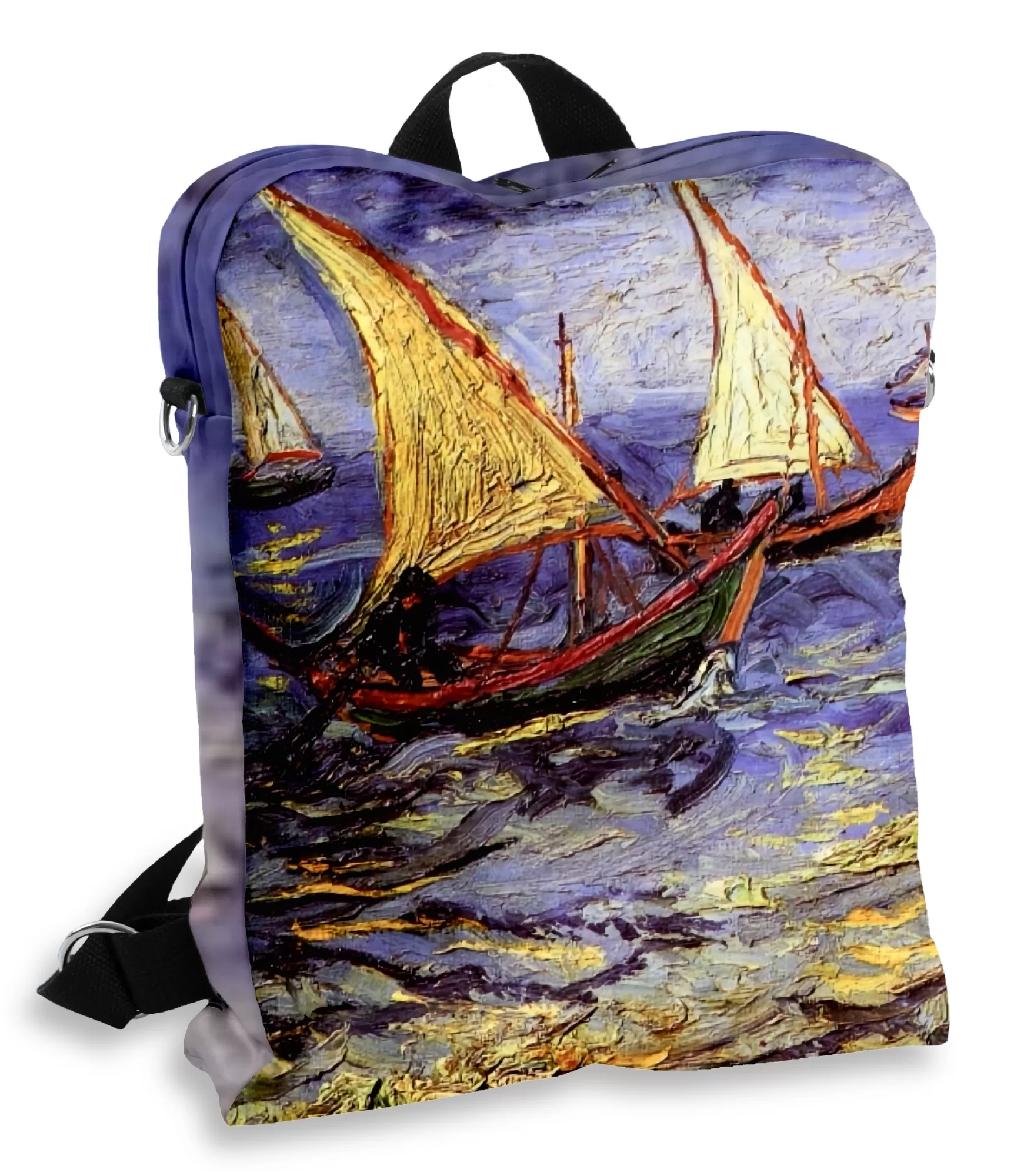 Kad paskatās uz šsieviešuš mugursomu, pirmais iespaids – it kā tu būtu pārvests uz 19.gs. beigās Francijas dienvidos. Vincenta van Goga glezna "Zvejas laivas jūrā" (jeb „Seascape at Saintes-Maries”) šeit pārvēršas ne tikai par izrādi, bet arī par neaizmirstamu mākslas pieredzi. Iedomājieties: laivas, kas šūpojas vējā, viļņu šalkoņa, debesu zilums un siltums, kas šķiet kā acs audumā. tas viss ir iemūžināts uz mugursomas, ko varat ņemt līdzi ceļojumā vai ikdienā. Šķiet, ka šāds aksesuārs aicina jūs piebremzēt, izbaudīt krāsas un atcerēties, ka pat steigā jūs joprojām varat saglabāt mieru un radošumu.