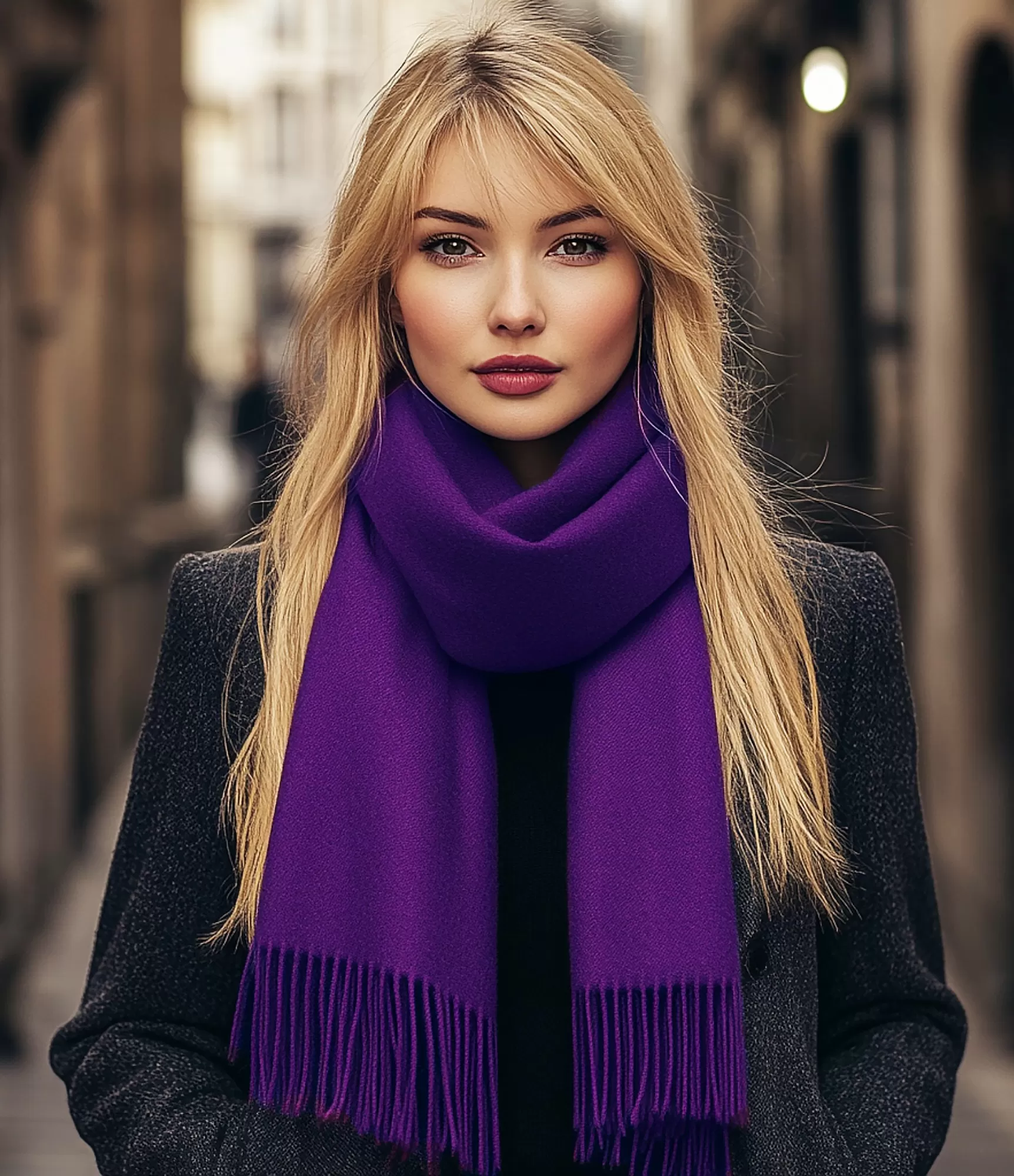 Violetais “Dark Purple” tonis piemīt īpaša spēja piešķirt tērpam noslēpumainību, dziļumu un izsmalcinātu eleganci. Tas ir tonis, kas izskatās dārgi un rafinēti, taču joprojām ir viegli pieskaņojams ikdienas garderobei. Violets īpaši skaisti sader ar melnu, pelēku, smilšu, tumši zilu un baltu, tāpēc šāda šalle kļūst par drošu, bet vienlaikus izteiksmīgu izvēli, kad vēlas tērpam piešķirt piesātinātāku akcentu. Valkāta ar klasisku mēteli, tā veido modernu, nedaudz dramatisku tēlu, bet kombinācijā ar brīvāka stila apģērbu piešķir smalku, sievišķīgu eleganci.