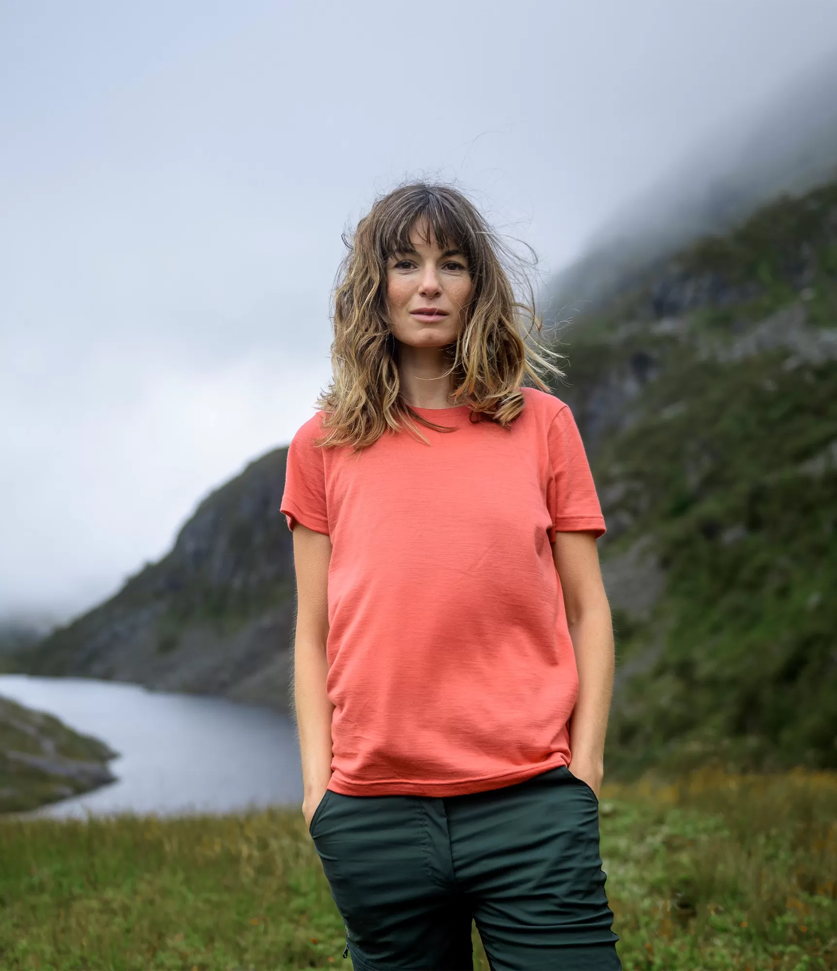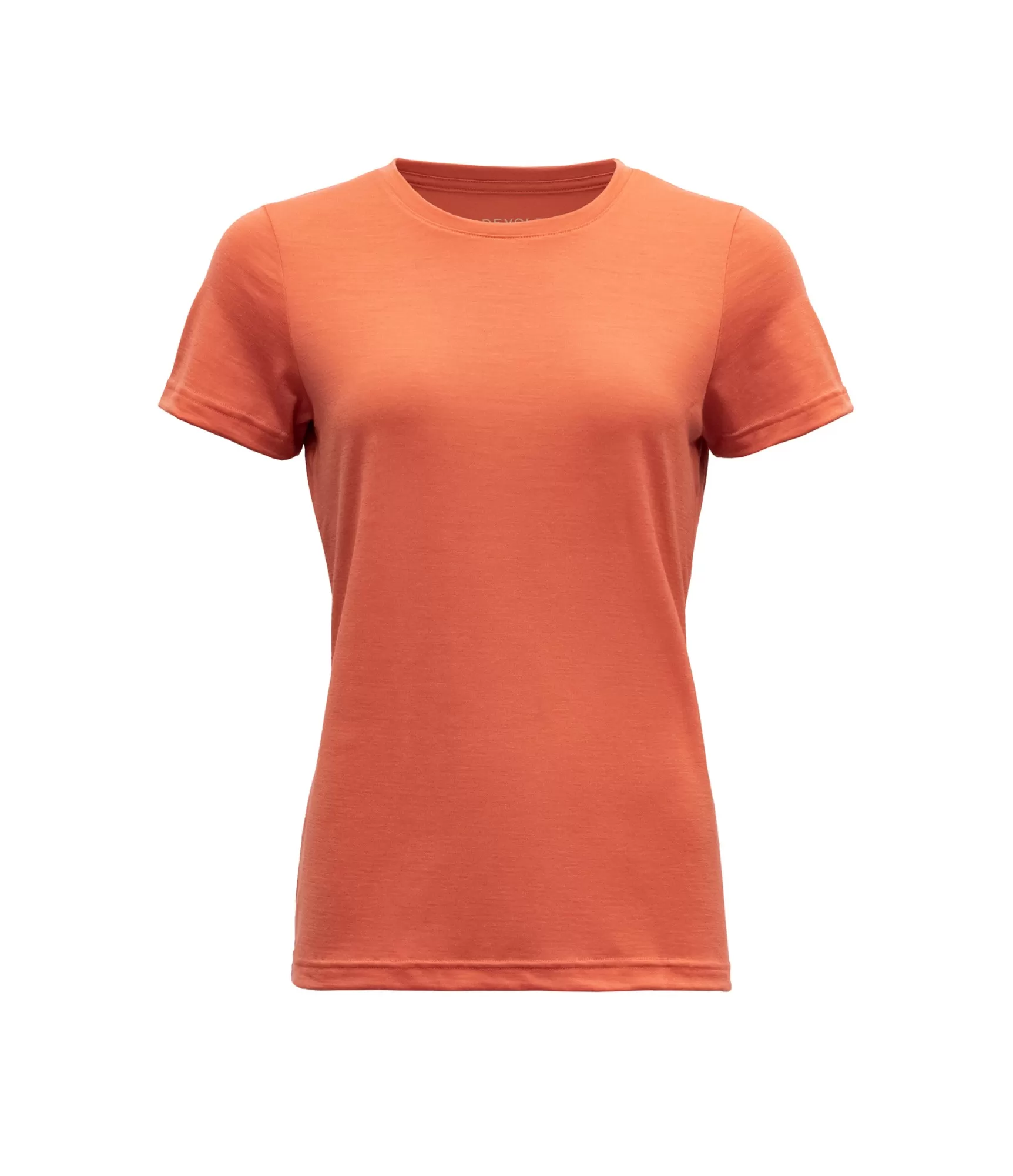 Stilīgs koraļļu krāsas Devold merino T-krekls sievietēm. Viegls, mīksts un elpojošs. Lieliska izvēle atpūtai vai ceļojumiem.