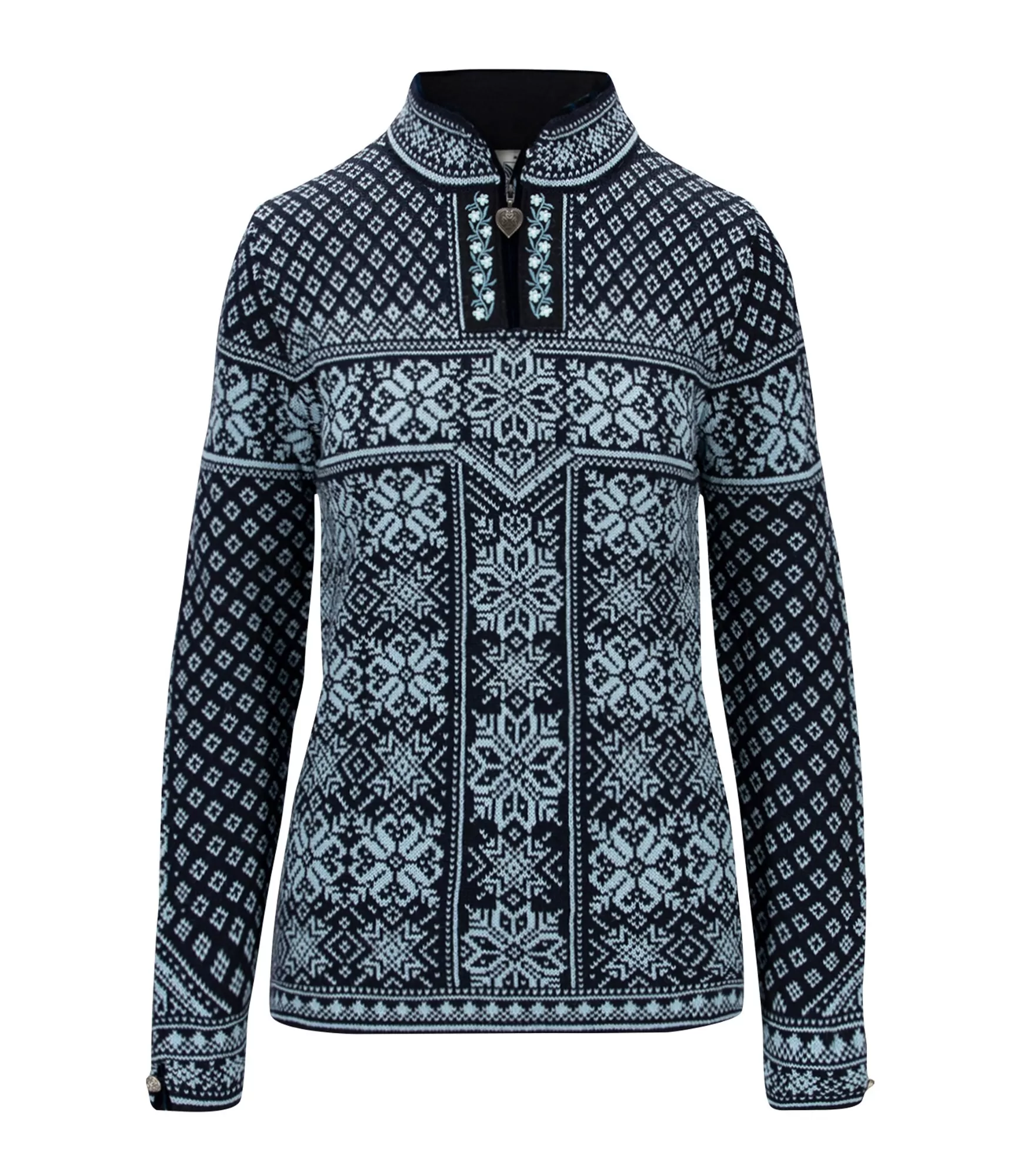 Krāsu kombinācija Navy / Iceblue atspoguļo patieso Norvēģijas ziemas garu: dziļi zilā krāsa atgādina kalnu ēnas, bet gaiši zilā – salnu uz sniega. Klasiskais skandināvu raksts piešķir džemperim raksturu un autentiskumu, tāpēc tas saglabā modi neatkarīgi no gadalaika. Šo džemperi ir viegli kombinēt ar džinsiem, vilnas biksēm vai svārkiem, bet aukstākā laikā – ar termo apakškārtu vai ziemas jaku.