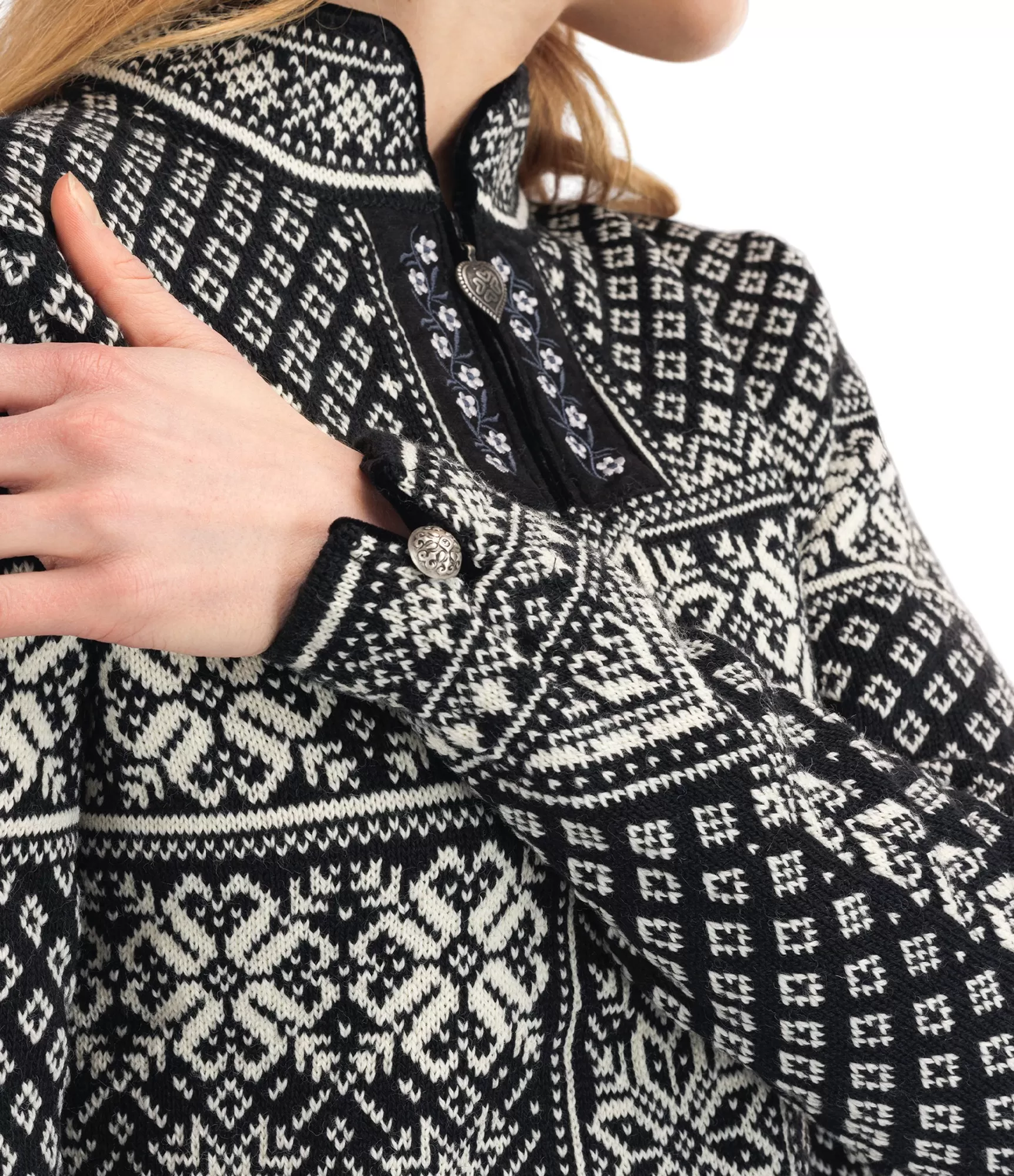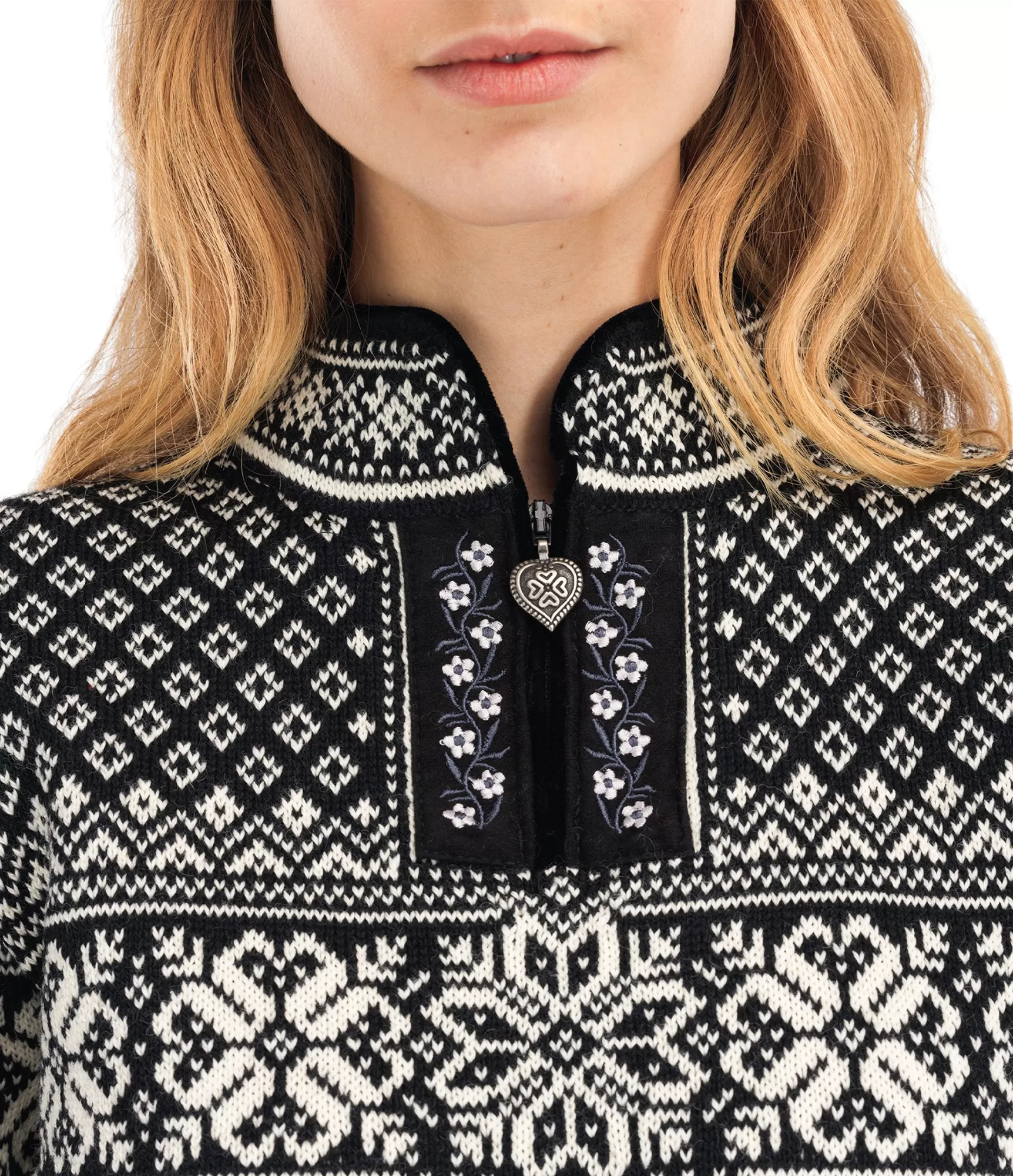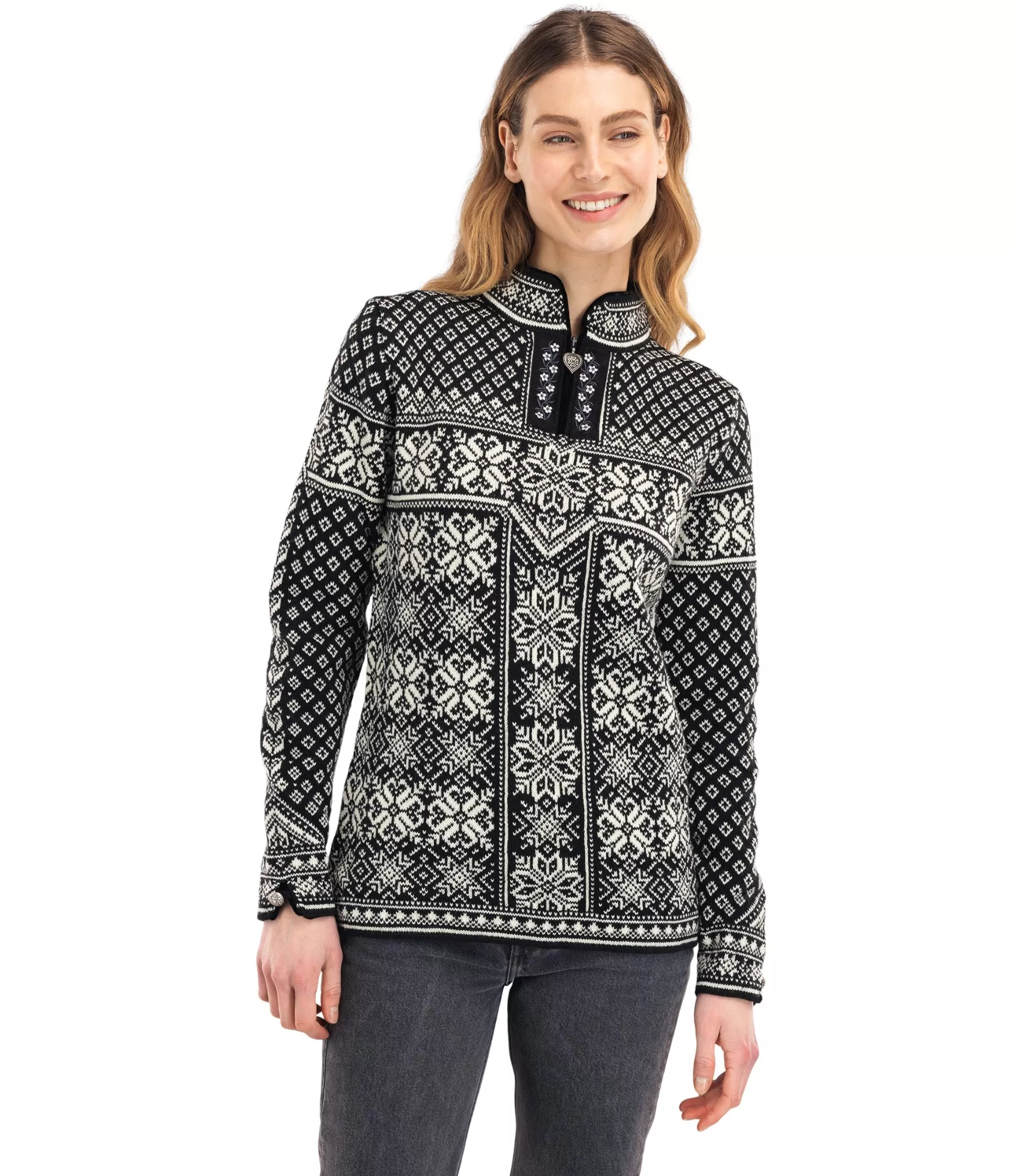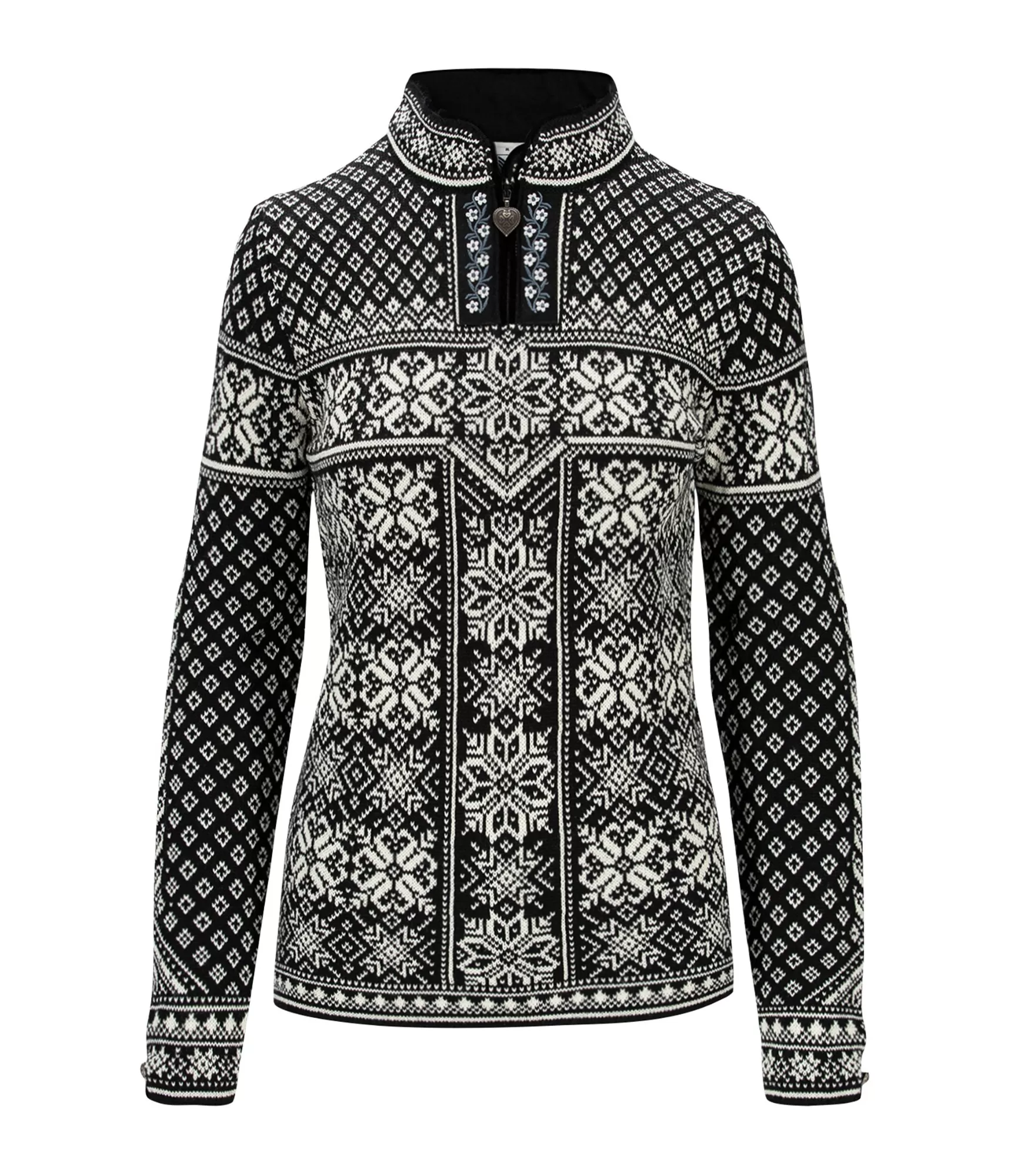 Krāsu kombinācija Black / Offwhite ir spēcīga kontrasta spēle starp melno un balto. Klasiskais norvēģu raksts, kas izraibināts ar sniegpārslām un ģeometriskiem motīviem, simbolizē līdzsvaru starp dabas spēku un mieru. Baltas detaļas spilgti mirdz uz tumša fona, radot ārkārtīgi skaistu vizuālo efektu. Smalkais ornaments pie kakla un alvas krāsas sirds formas rāvējslēdzējs piešķir šim modelim īpašu šarmu un autentiskumu.