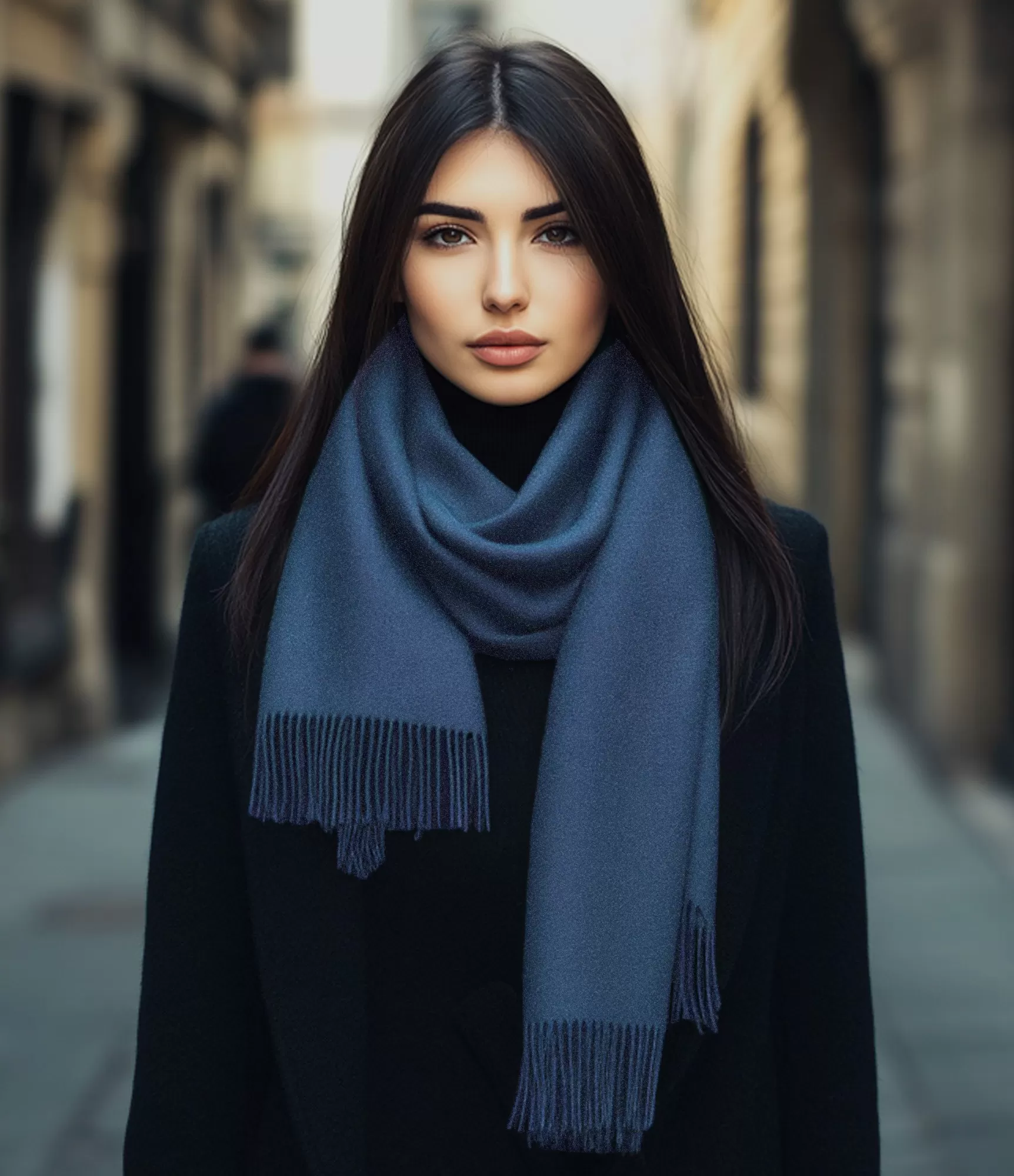 Tumši zilais “Deep Ocean Blue” tonis ir viens no universālākajiem atspalvjiem, ko sievietes izvēlas tā praktiskuma un elegantā mierīguma dēļ. Tā ir dziļa, tumša zilā krāsa, kas izskatās kārtīgi, moderna un lieliski sader ar dažāda stila apģērbu. Šis tonis viegli iekļaujas ikdienas salikumos, tāpēc ir lieliska izvēle gan darba dienai, gan nedēļas nogalei. Tas harmoniski sader ar melnu, pelēku, baltu, smilšu un tumši zilu paleti, tādēļ šāda šalle kļūst par viegli pielāgojamu akcentu neatkarīgi no tā, vai tiek valkāts mētelis, jaka vai džemperis.