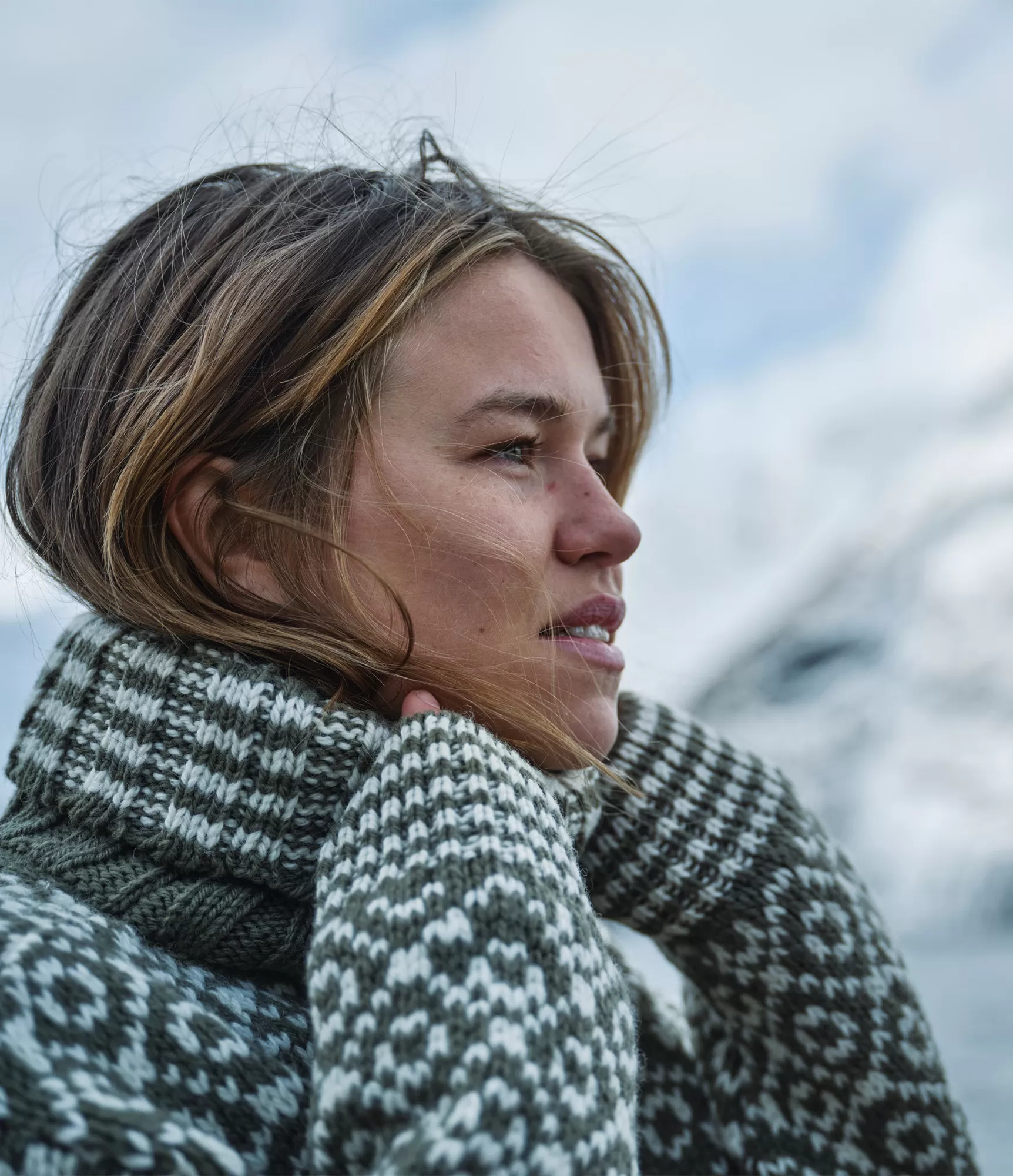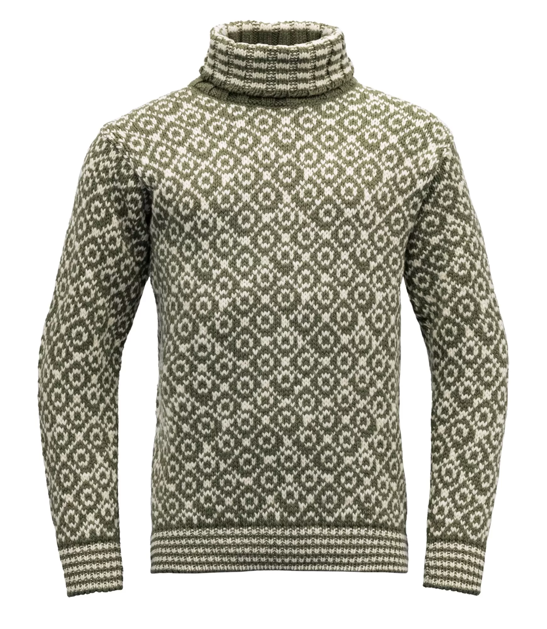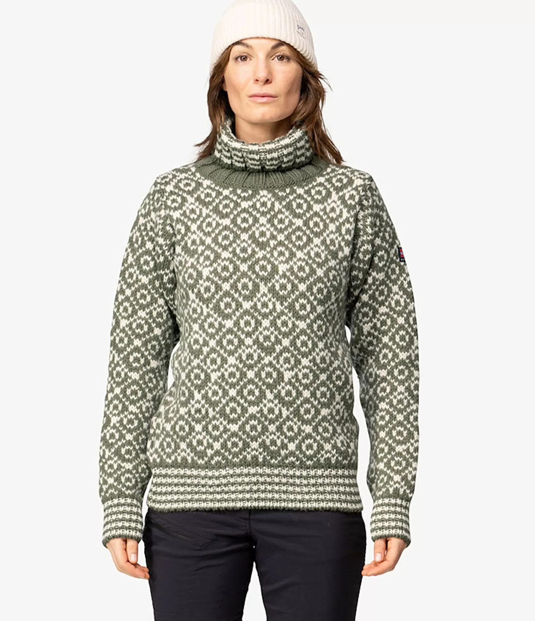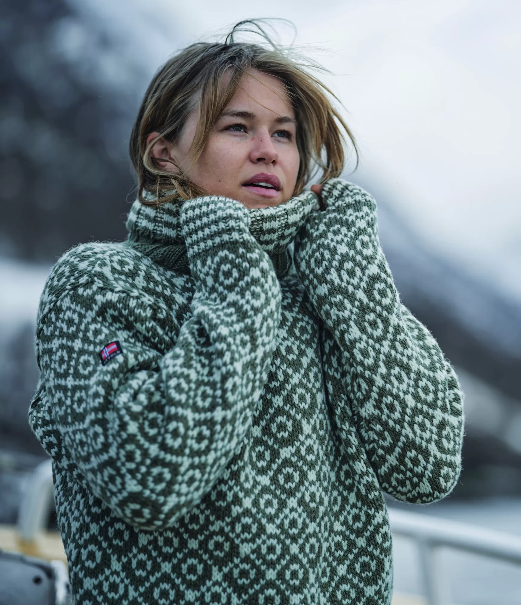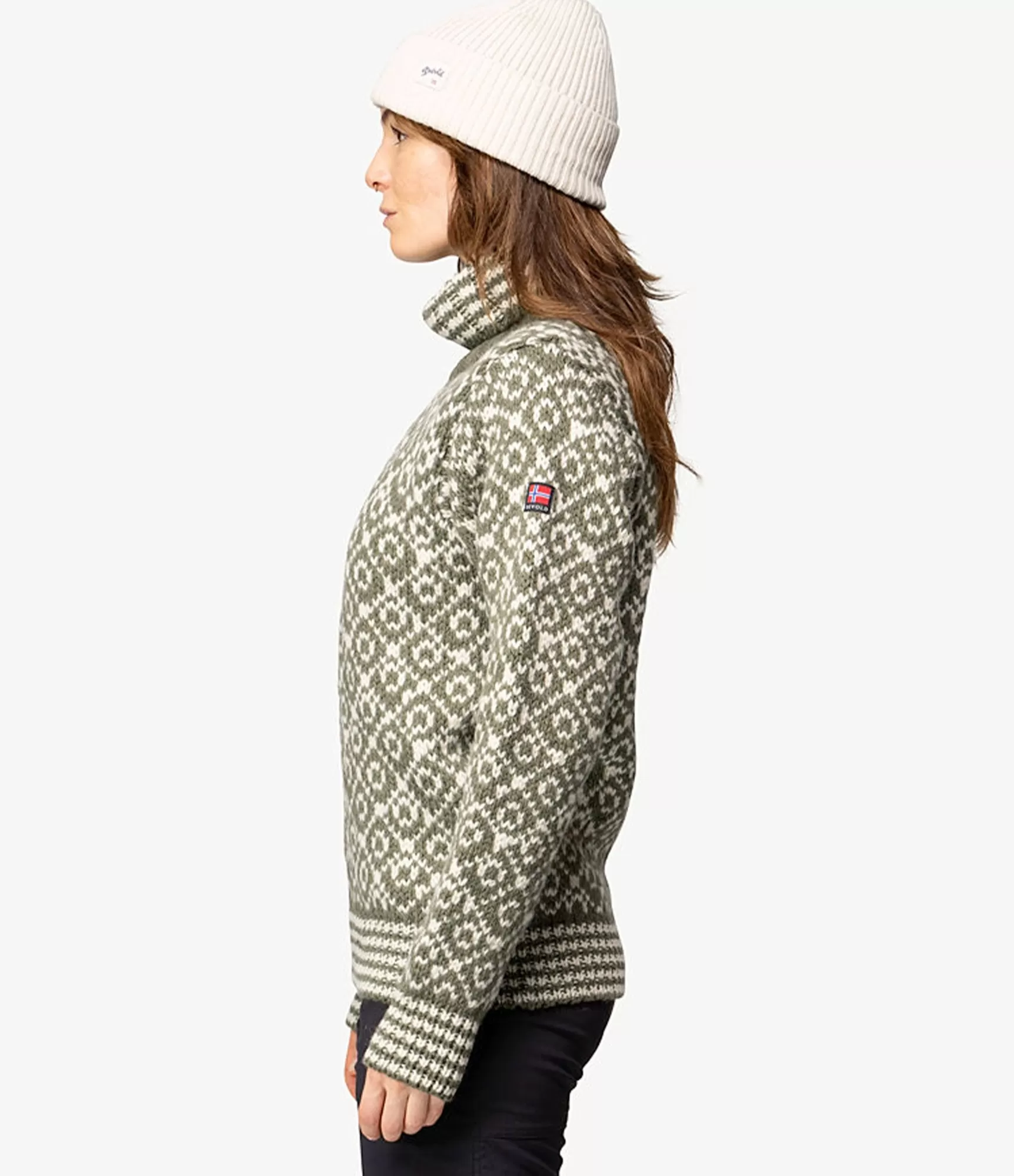 Olīvzaļās ("Olive") un baltās ("Offwhite") krāsu kombinācija piešķir džemperim dabisku, zemes nokrāsu, kas piestāv jebkuram stilam. Klasiskais skandināvu raksts uzsver tradīcijas, un augstā apkakle pasargā no vēja, tāpēc nav nepieciešama papildu šalle.