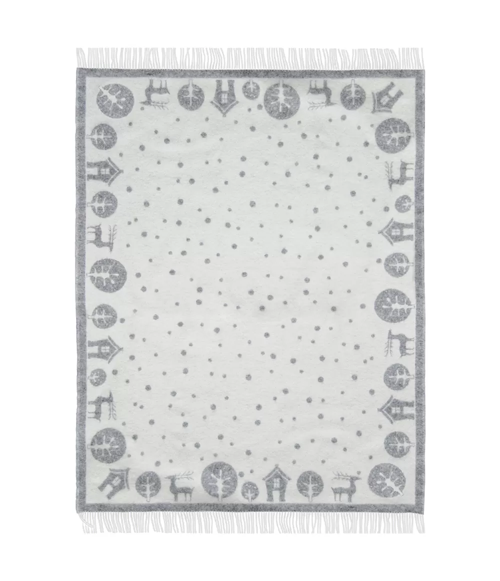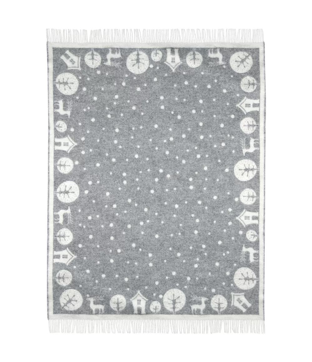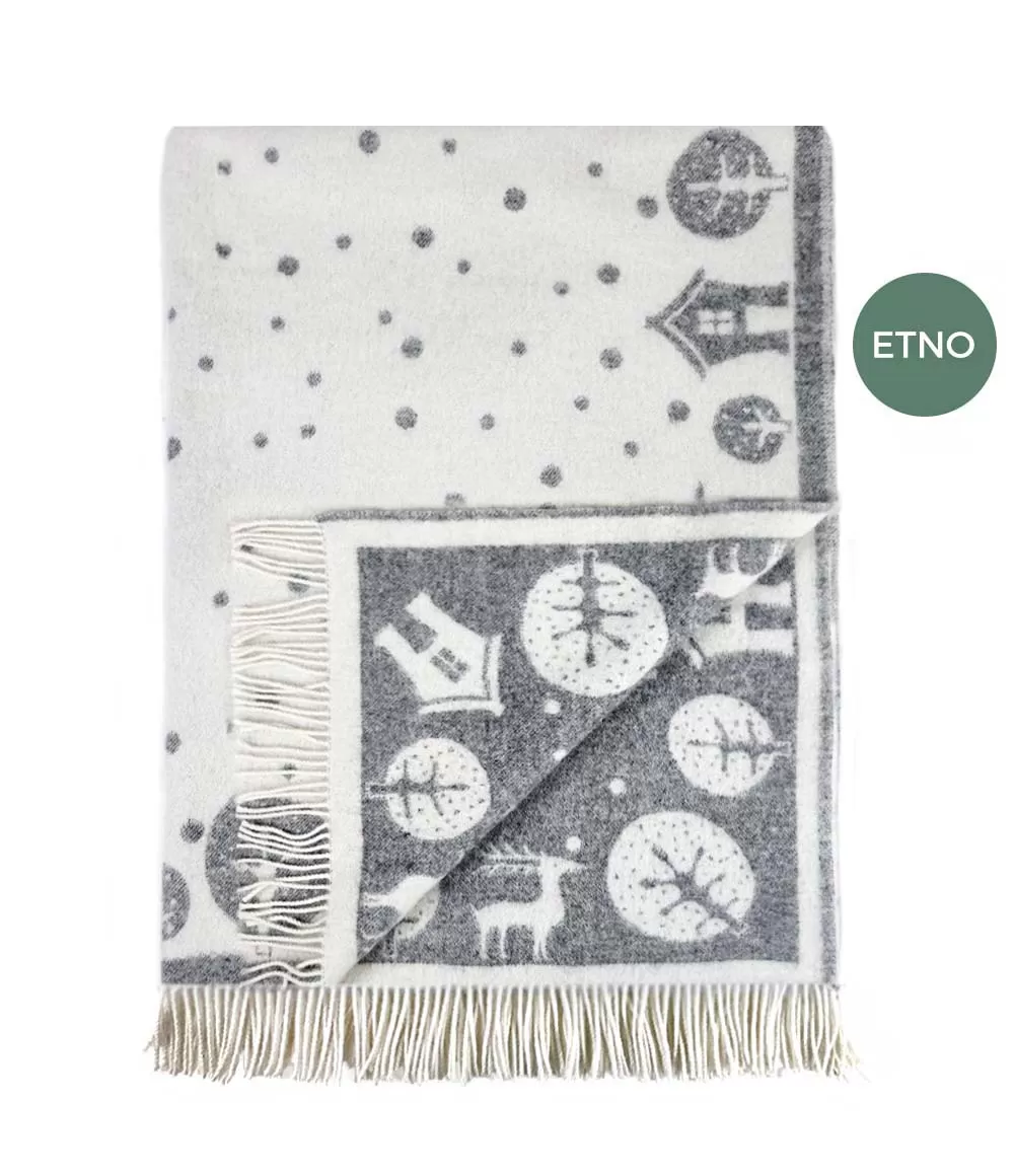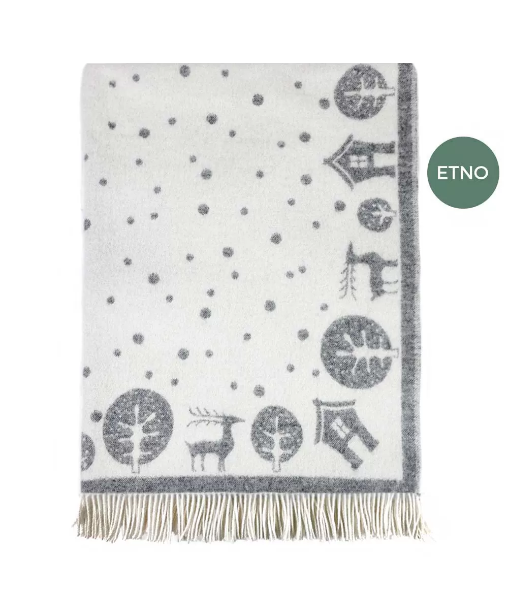 Šis žakarda pleds ar pasaku motīviem ir radīts tiem, kuri novērtē mierīgu dizainu, smalkas detaļas un dabisku vilnas siltumu. Pelēkās un baltās krāsas salikums veido maigu kontrastu, bet ilustrācijas – mājiņas, koki, brieži un smalki punktiņi – atgādina klusu ziemas vakaru, kad aiz loga krīt sniegs. Tāpat kā visiem žakarda plediem, arī šim ir abpusējs raksts: vienā pusē dominē gaišs fons ar tumšākiem motīviem, otrā – pretēji, tādēļ pledu var izmantot atkarībā no noskaņas vai interjera krāsām.