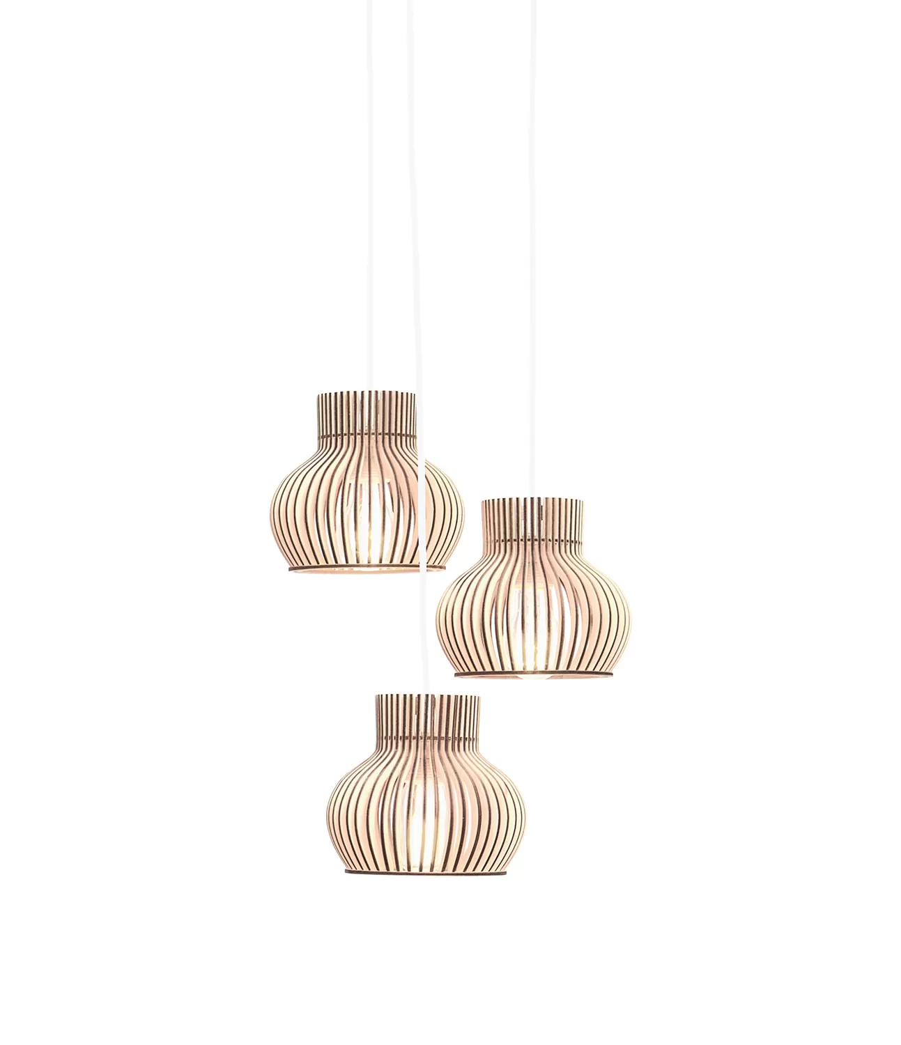 Gaisma ērti krīt caur koka sloksņu spraugām, tāpēc trīs piekarināmu koka svečturu komplekts izskatās stilīgi piekārts virs kamīna. pusdienu galds virtuvē, omulīgi izskatās guļamistabā, kabinetā. Šgaismas var piekārt dažādos augstumos, tādējādi piešķirot kompozīcijai išatšķirību.