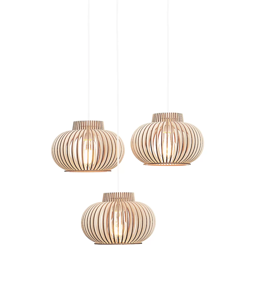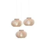 Gaisma ērti krīt caur koka sloksņu spraugām, tāpēc trīs piekarināmu koka svečturu komplekts izskatās stilīgi piekārts virs kamīna. pusdienu galds virtuvē, omulīgi izskatās guļamistabā, kabinetā. Šgaismas var piekārt dažādos augstumos, tādējādi piešķirot kompozīcijai išatšķirību.