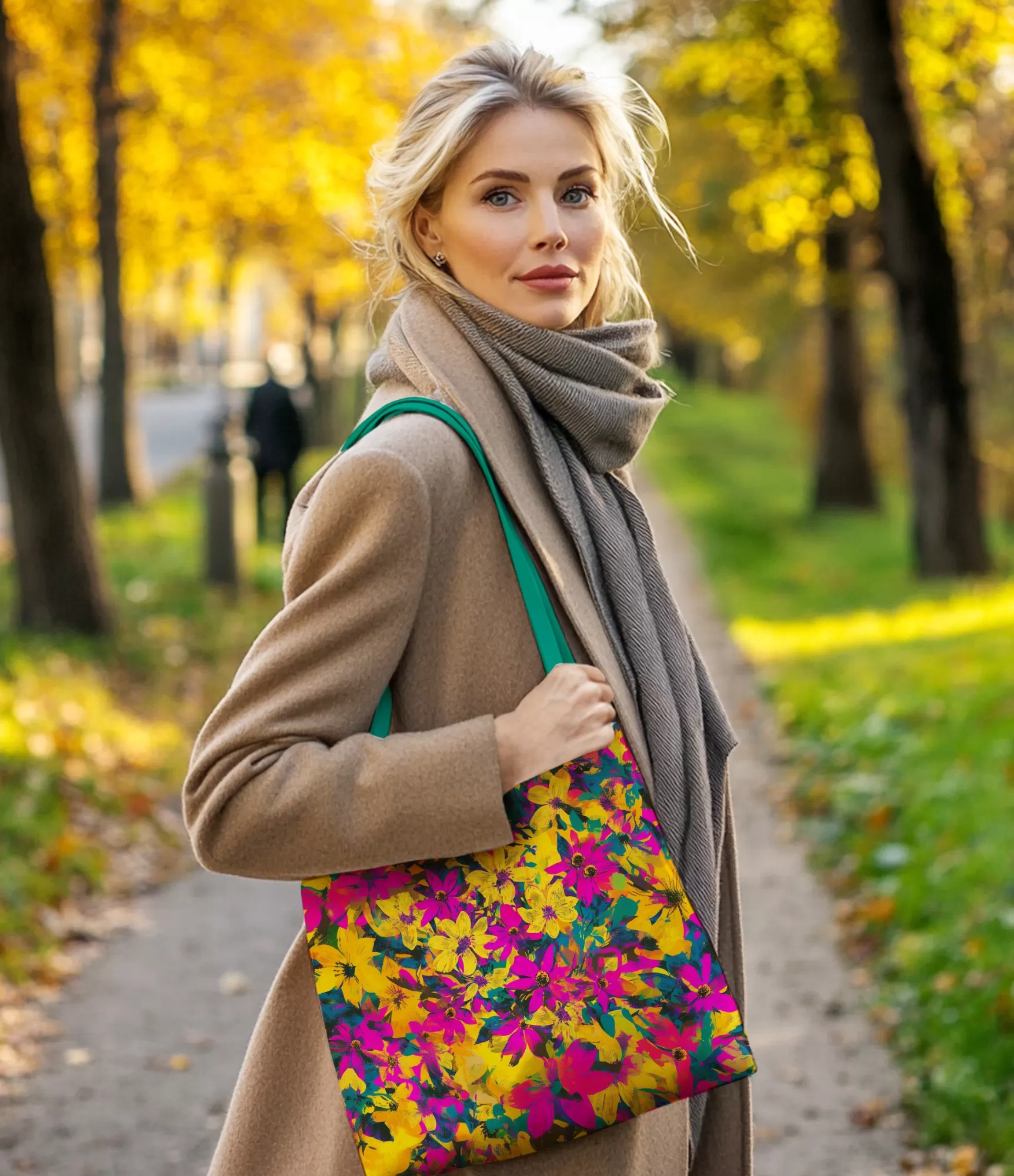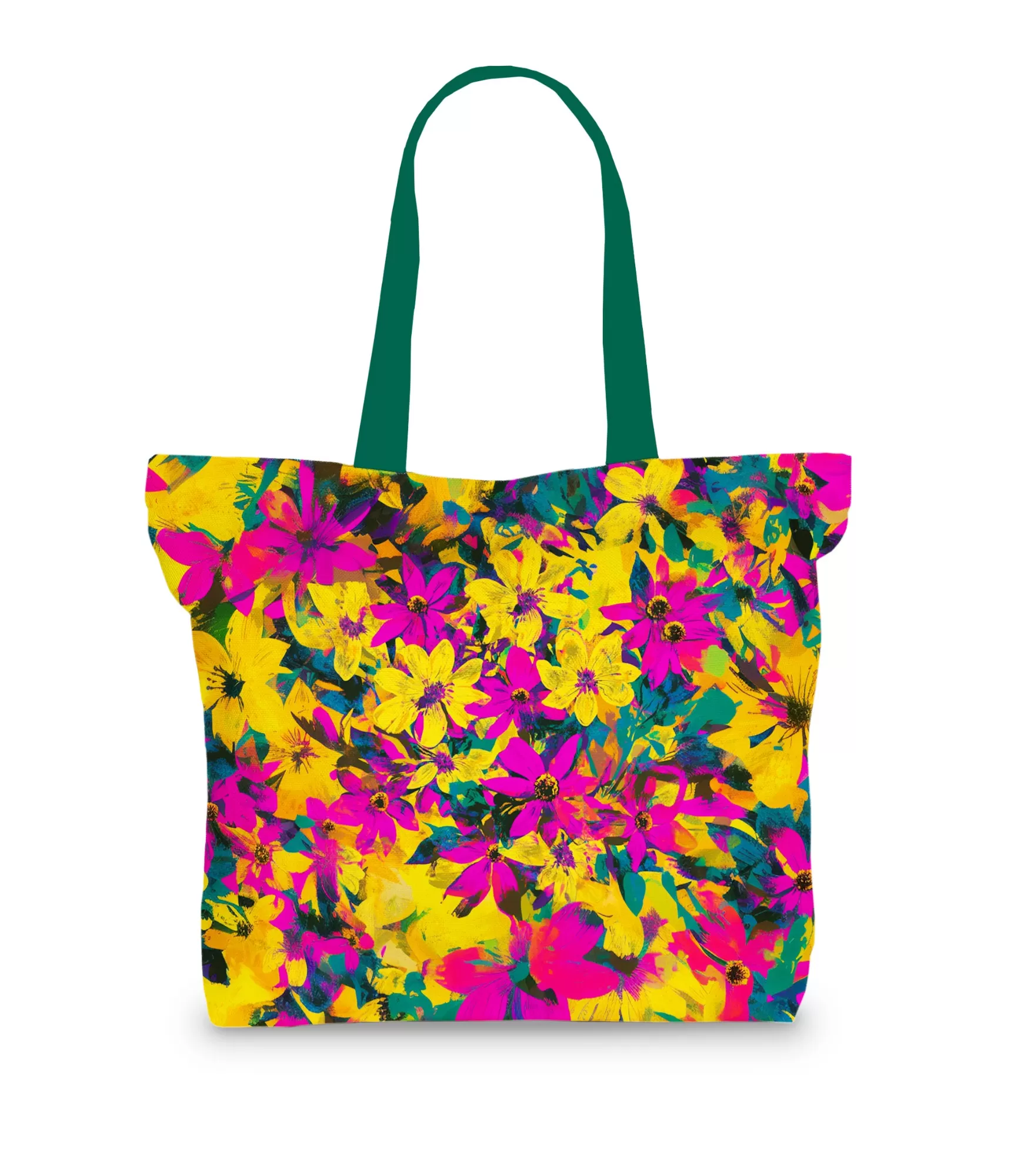 Šī unikālā iepirkumu soma ir rotāta ar krāsainu ziedu rakstu, kurā dominē spilgti dzelteni toņi, ko papildina intensīvas rozā, zaļas, violetas un zilas krāsas detaļas. Ziedi, attēloti nedaudz abstraktā stilā, izskatās it kā nejauši izkārtoti uz auduma, piešķirot somai dzīvīgu un uzmanību piesaistošu dizainu.