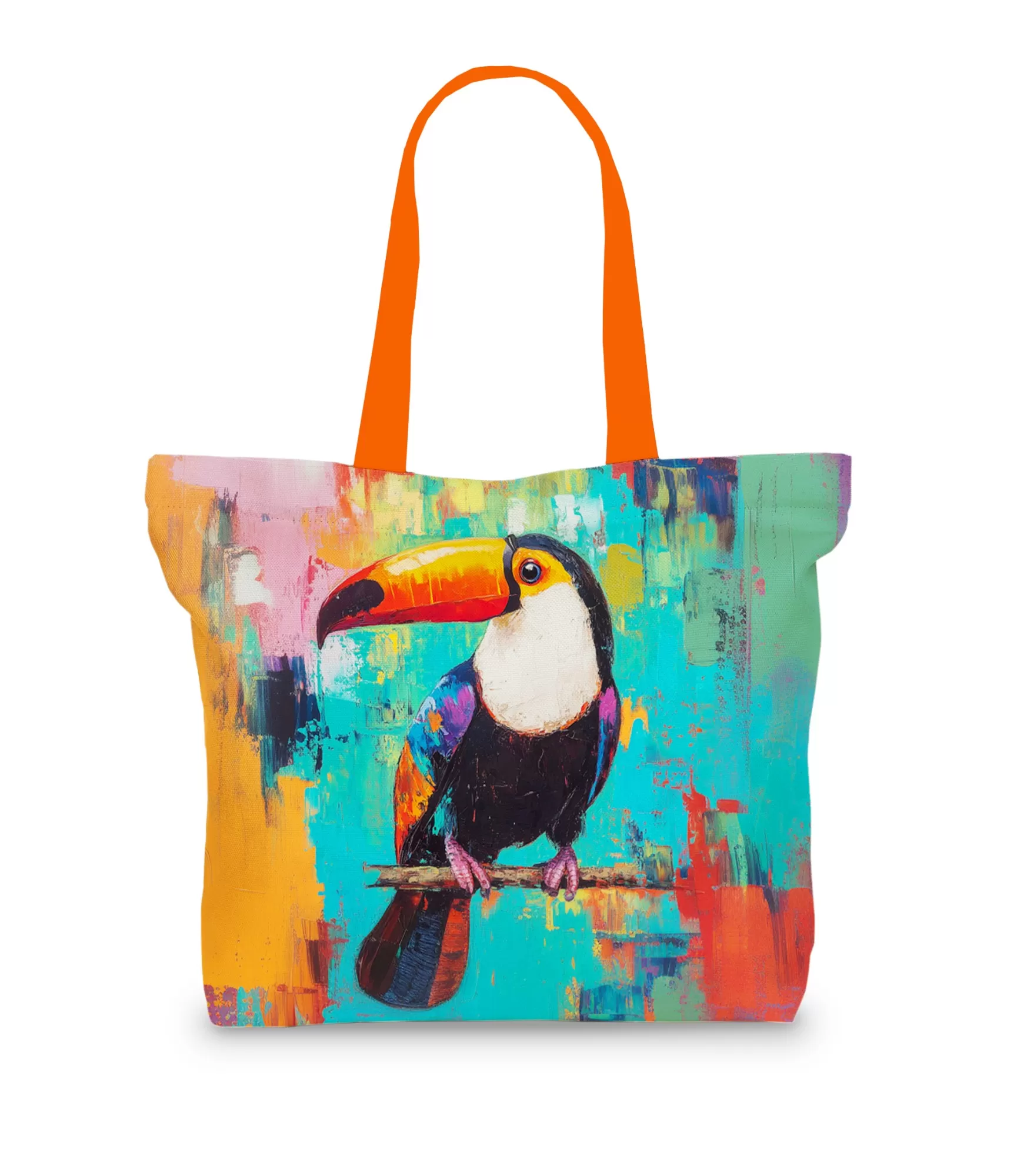 Šī košā iepirkumu soma ir īsts tropu enerģijas un mākslas darbs! Dizaina galvenais akcents ir reālistiski attēlots tukanis, eleganti sēžot uz zara. Viņa izteiksmīgais, lielais knābis mirdz oranžā, dzeltenā un zaļā toņos, kontrastējot ar melno ķermeni un balto kaklu. Spalvu detaļas smalki izceļ putna skaistumu, radot dabiskuma iespaidu.