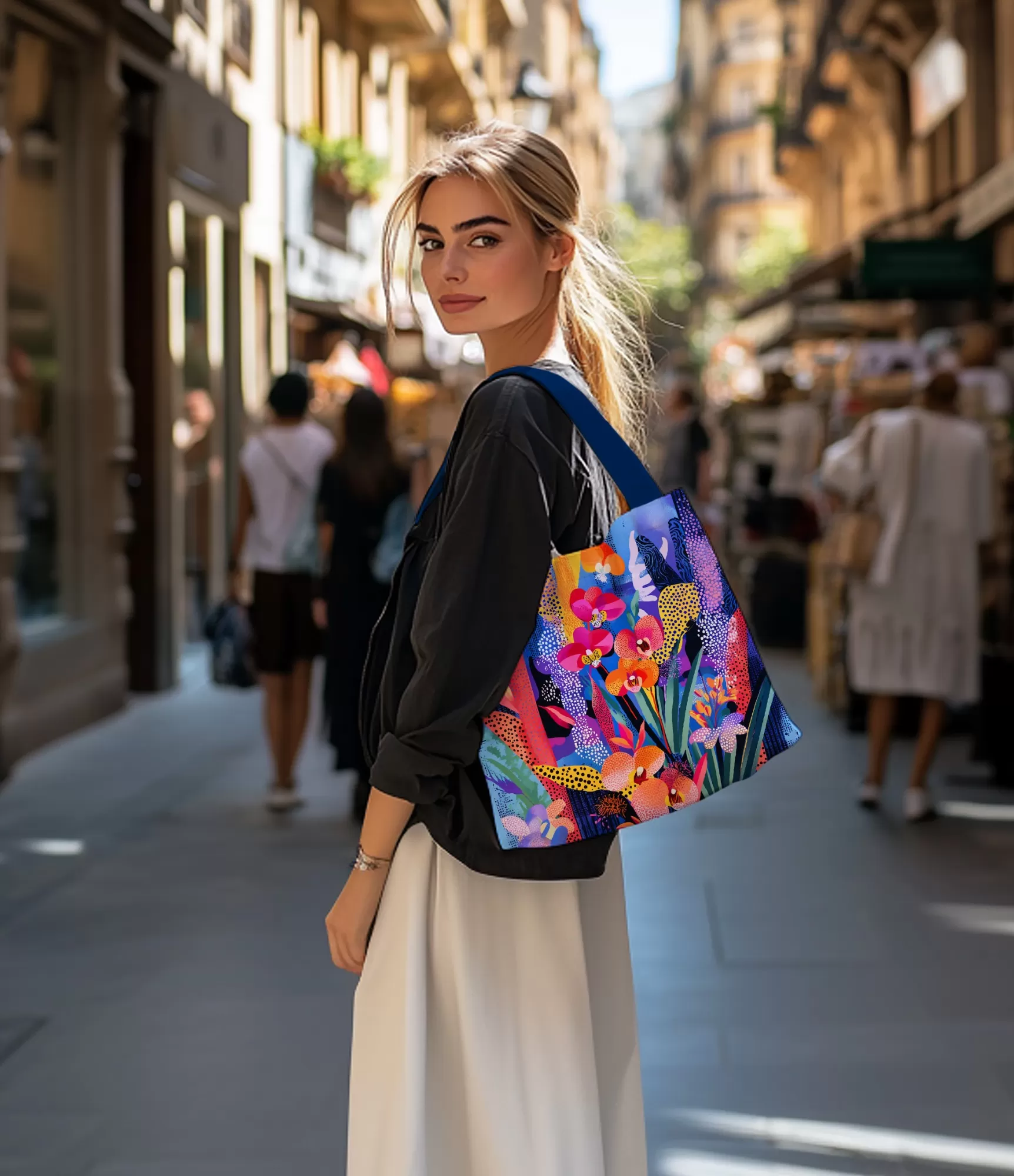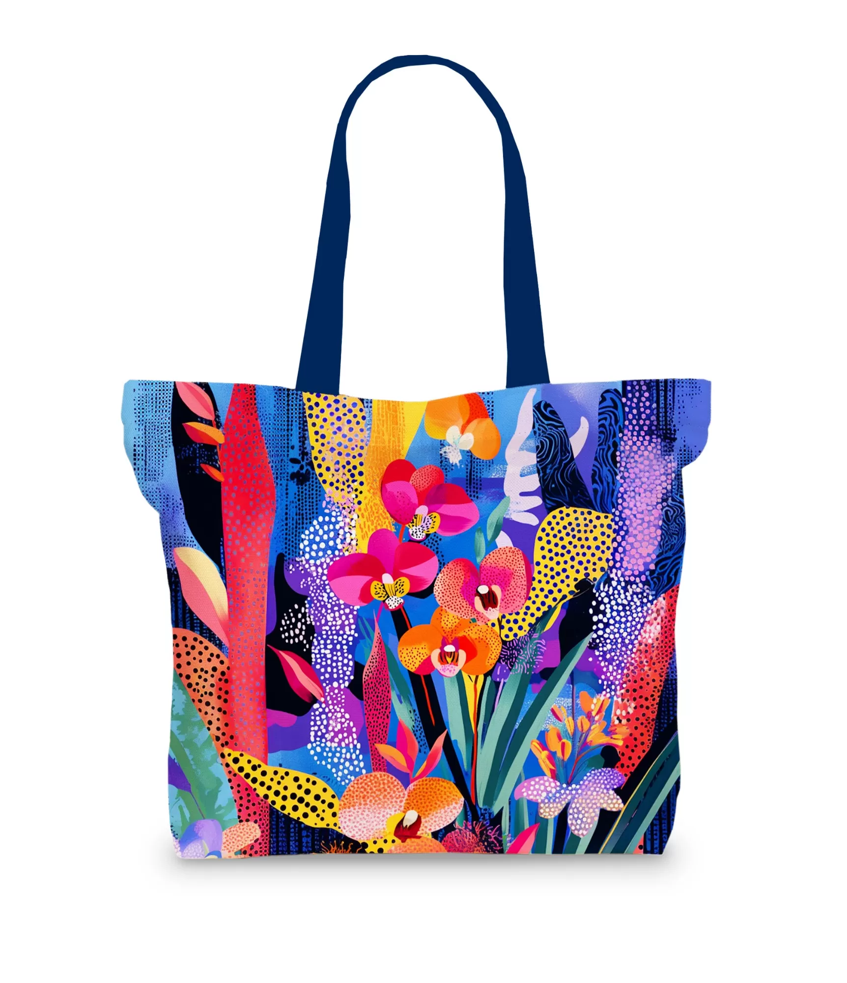 Šī krāsainā iepirkumu soma ir lieliska izvēle dāvanai sievietei, kura vēlas pievienot rotaļīgumu un eksotiku savam ikdienas stilam! Galvenais akcents ir spilgts, stilizēts ziedu raksts, kas nav tieši dabas atveidojums, bet sniedz rotaļīgu un gandrīz abstraktu tropu attēlu. Galvenie raksta elementi ir orhidejas, attēlotas spilgtās rozā, oranžās un dzeltenās krāsās, kopā ar dažādiem tropu lapām un augiem.