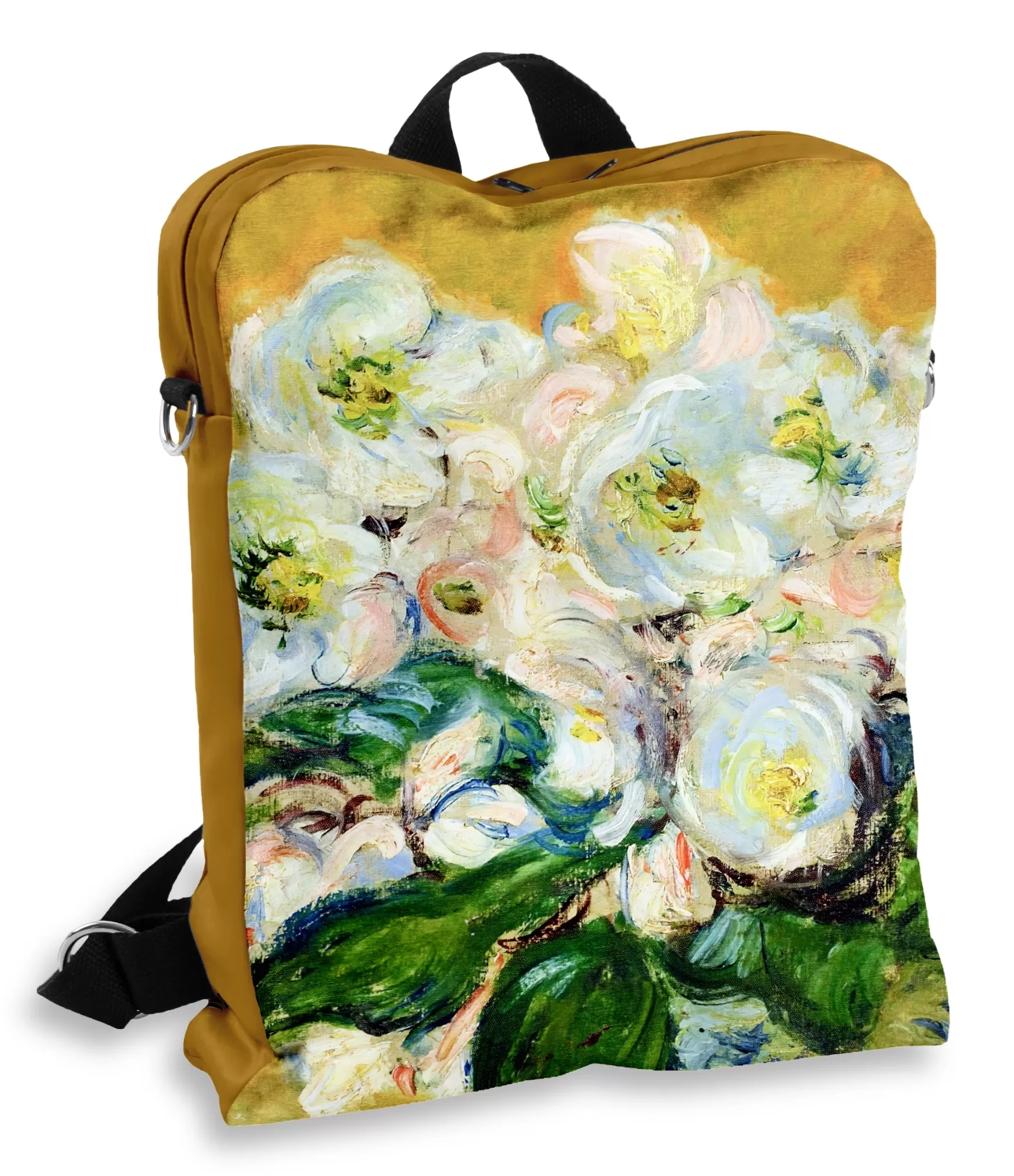 Kloda Monē glezna "Ziemassvētku rozes" kļuva par unikālas sieviešu mugursomas radošo pamatu. Tas nav tikai aksesuārs – tā ir spilgtuma, smalkuma un mākslinieciska klusuma izpausme, no kuras var izvairīties katru dienu. Monē baltās rozes šeit izvēršas kā ziemaškas šbuzz – Atvērti, pasteļtoņi, alksnis tik tikko skarts un rīta miera ieskauts. Viss mugursomas sastāvs ir piepildīts ar komfortu un estētisku harmoniju. Tas ir paredzēts sievietei, kura vēlas vairāk nekā modi – kas izvēlas to, kas runā ar jūtām.