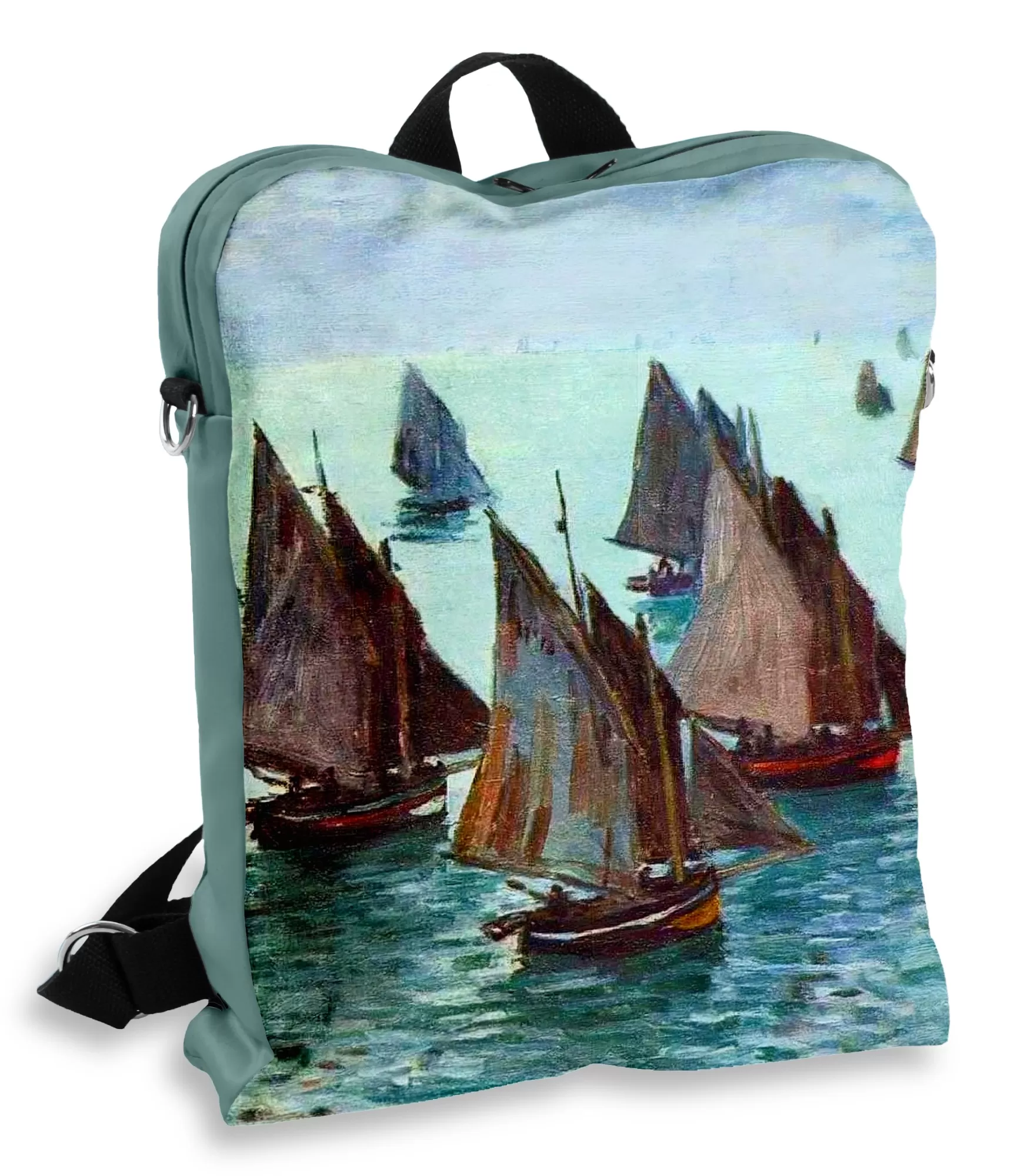 Kloda Monē glezna "Zvejas laivas, mierīga jūra" Motīviem rotāta sievietes mugursoma iemieso klusu skaistumu, mieru un iekšējo ceļojumu. Šir aksesuārs – tā ir ne tikai stila detaļa, bet arī mākslinieciska noskaņa, ko var paņemt līdzi. Monē miera un atmosfēras sajūta tiek nodota smalkos vilcienos: velnišķīgi zilā jūra, mierīgi peldoši kuģi un miera bagātinātā telpa aicina apstāties, elpot un dzīvot lēnāk. Mugursoma kļūst par emocionālu oāzi pilsētas ritmā.