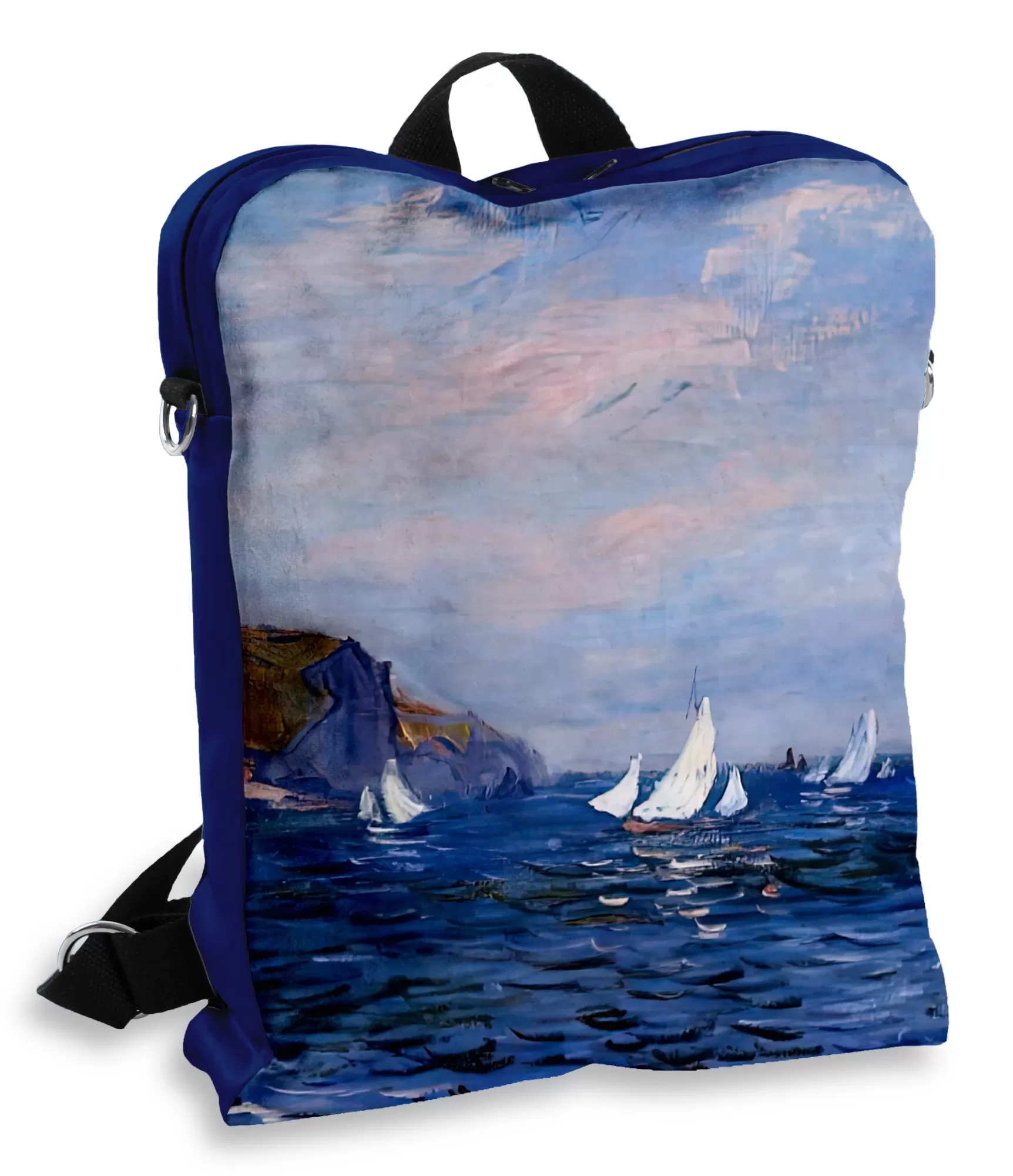 Tāpat kā jūras klusums, arī mugursomas dizains pēc Kloda Monē gleznas iedvesmo vieglumu. Tiklīdz uz viņu paskaties, tavas acis iegrimst zilo debesu plašumos, un baltās buras lēnām šūpojas pa okeāna viļņiem. Tālumā paceļas mierīgās Purvilas klintis, kas krāsotas ar velnišķīgiem triepieniem, kas rada dzīvu, elpojošu telpu.
