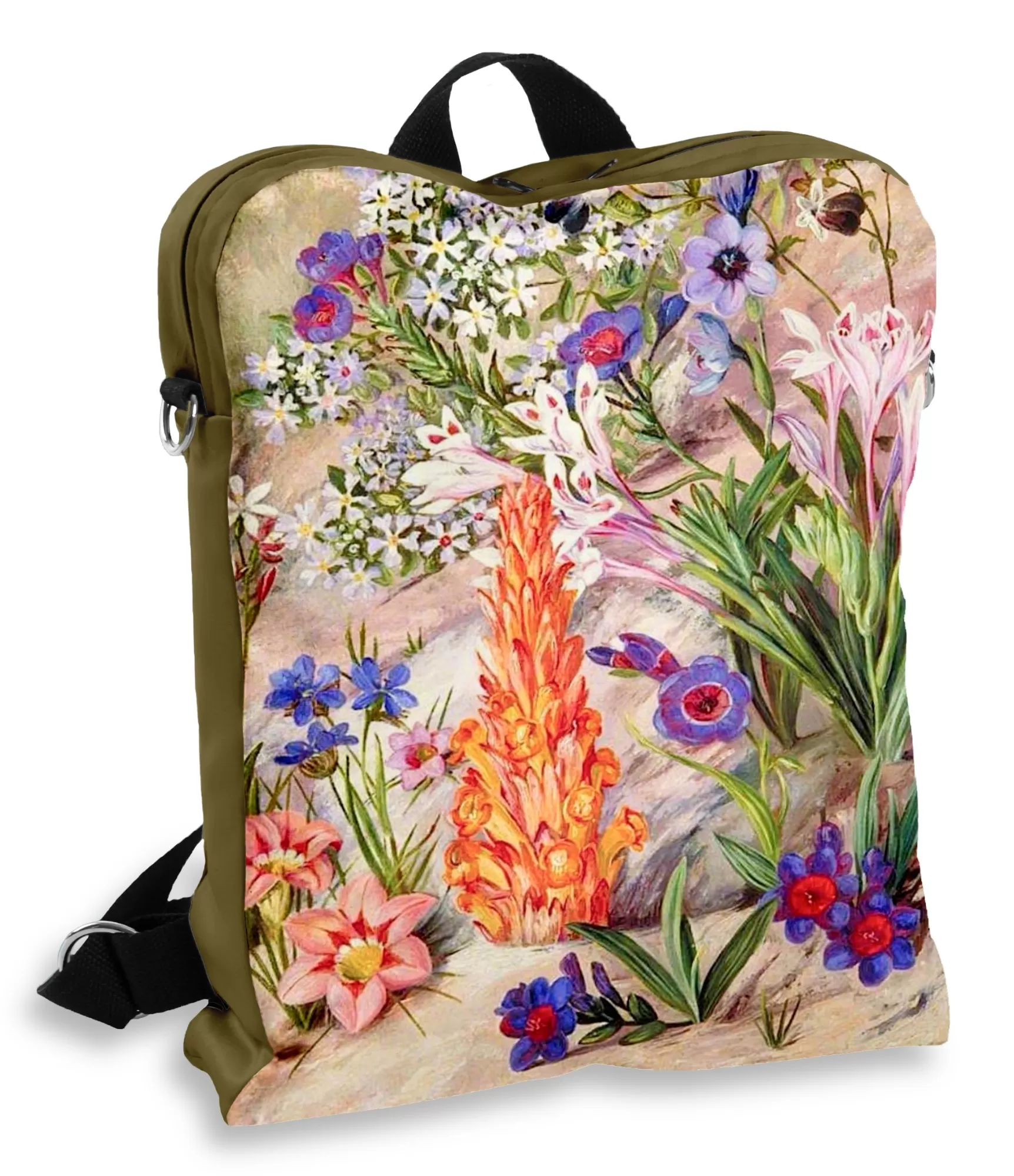 Dažreiz jūs vēlaties vairāk nekā tikai praktisku priekšmetu – jūs vēlaties paņemt līdzi pasaules skaistumu. Nevis kā fotogrāfija vai atmiņa, bet kā dzīvs, krāsains, elpojošs motīvs, kas caurvij ikdienu. Scaron sieviešu mugursoma, kas balstīta uz britu ceļotāja un gleznotāja Marianna North glezna Medley no Groot Post, Dienvidāfrikā, ir tieši tāda. Viņa – kā dabas ekspozīcija, pārnesta uz mugursomas audumu: švīstošs, svaigs, stiprs un kopā – ārkārtēja sievieteška.