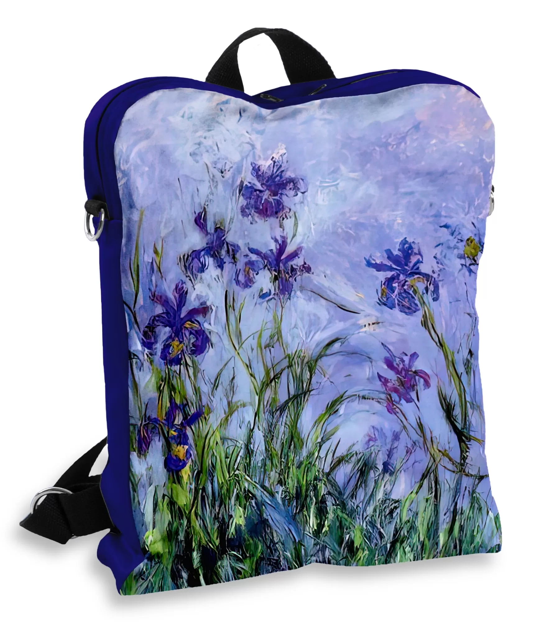 Katra mugursoma var būt praktiska. Bet tikai viens, piemēram, ši – ar Kloda Monē darbu „Ceriņu īrisi“ motīvs – kļūst par īstu ikdienas mākslas darbu. Tajā ir krāsu dzeja, pavasara spilgtums un eleganta brīvība. Tas nav tikai aksesuārs – tā ir klusa acs uz krāsām, kas rotā jūsu stilu bez jebkādiem kompromisiem.