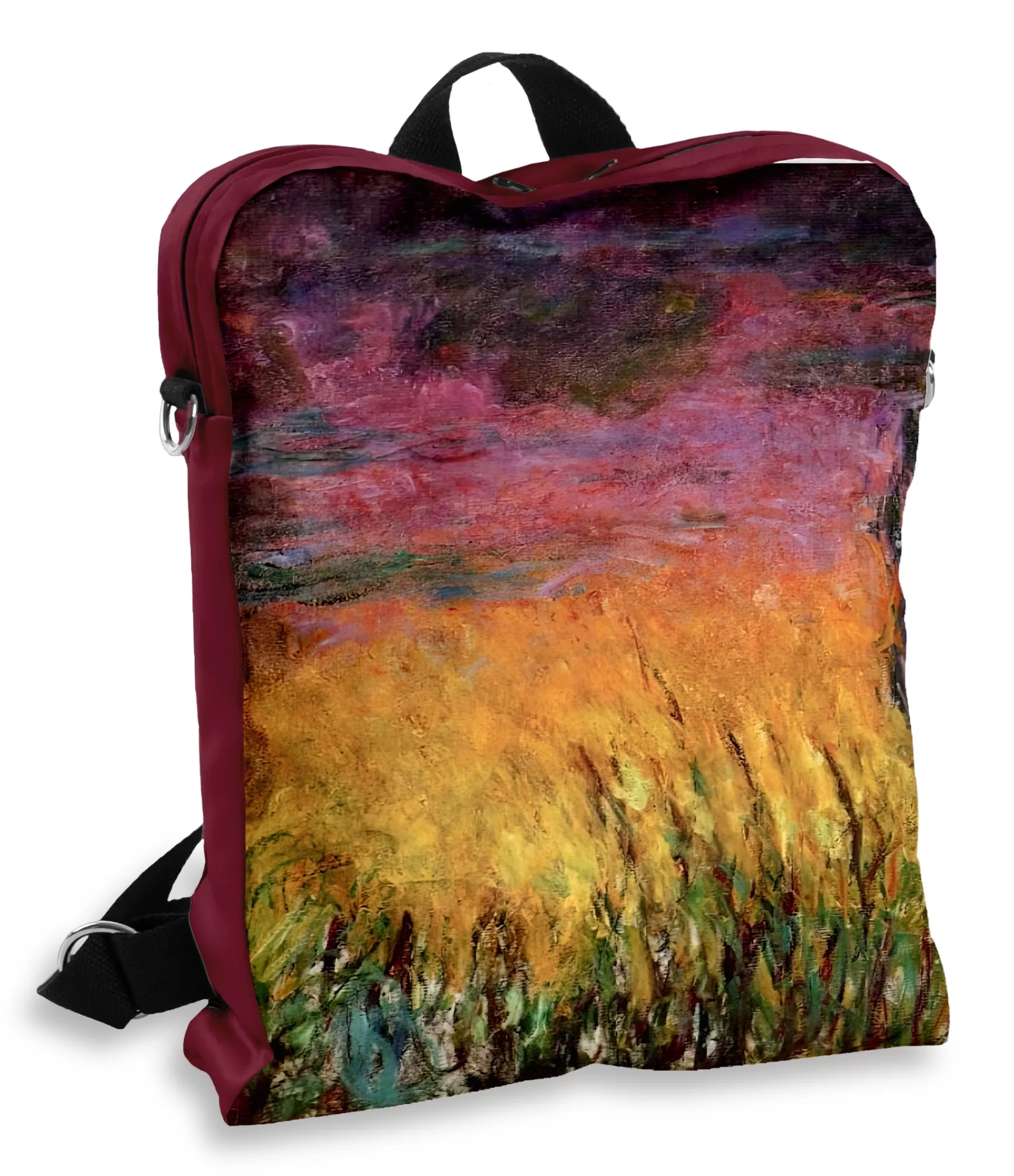 Kloda Monē glezna "Saulriets (kreisā puse)"“ fragments – tās ir emocijas, kas vajadzīgas bez vārdiem. Š mugursomas dizains uzliek šo sajūtu tieši uz jūsu pleciem – viņa ne tik daudz ilustrē, cik runā krāsaini. Ugunīgi dzeltena, purpursarkana migla, zaļi triepieni – tas viss saplūst dramatiskā, bet velnišķīgā ainavā, kas iestrādāta skaidrā taisnstūrī.