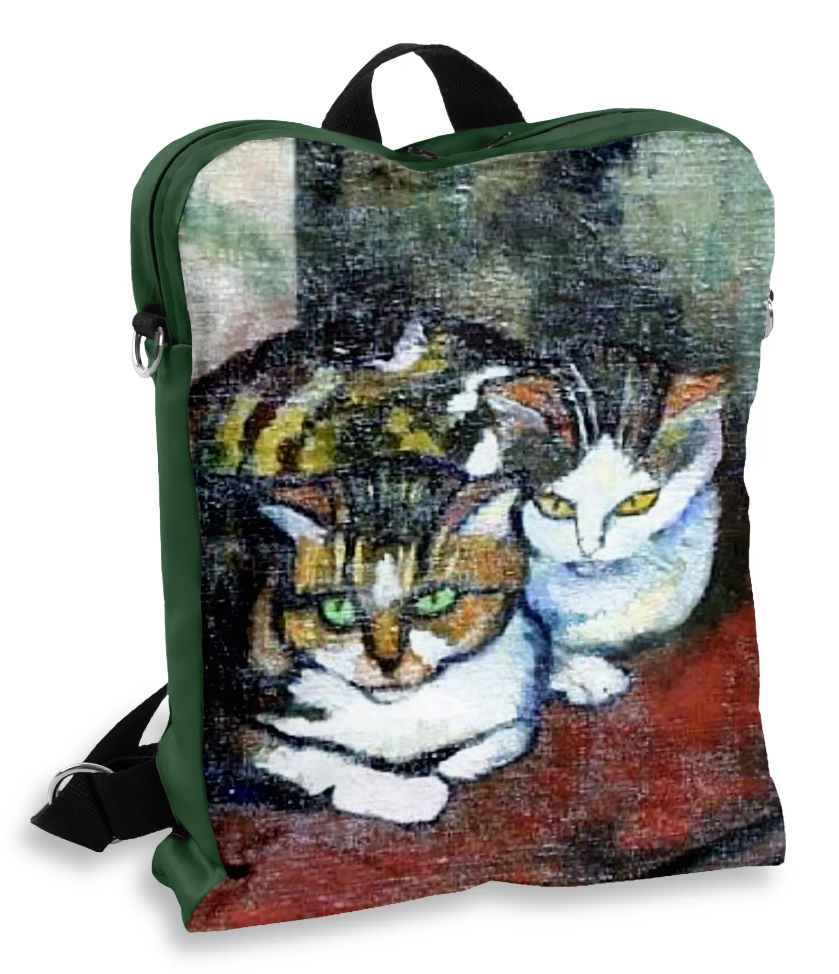 Valadon „Divi kaķi“ attēlā redzami divi dažādi kaķi – viens šķiet ar savu skatienu seko pasaulei, otrs ir iegrimis sevī. Viņu acis – pilns dzīvības, zinātkāres, pat nedaudz ironijas. Glezna uz mugursomas atveidota ārkārtīgi precīzi: saglabātas ne tikai detaļas, bet arī toņi, triepienu dinamika, emocionālā noskaņa. Fonā redzamās bagātīgās zilās un sarkanās nokrāsas rada dziļu, šnedaudz teatrāluš iespaidu. Tā nav jauka kaķēnu ilustrācija – tā ir nobriedusi, sievišķīga māksla, kurā slēpjas gan rotaļīgums, gan inteliģence.