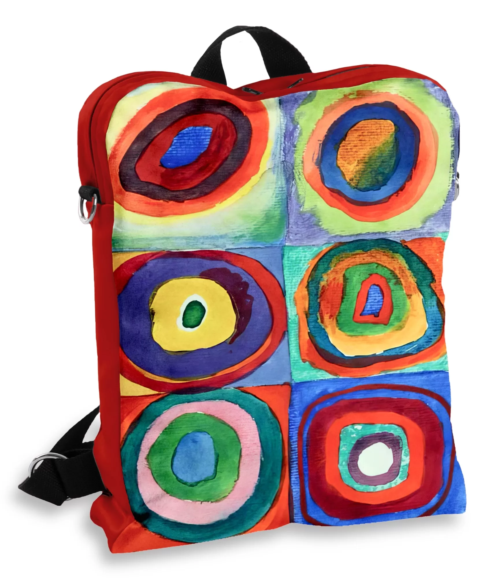 Dažreiz noskaņojuma paaugstināšanai pietiek ar skatīšanos uz piekārtu attēlu. Tāda ir ši sievieteška mugursoma – ar Vasiliju Kandinski šedevre „Kvadrātu un apļu krāsu izpēte”, kurā katrs kvadrāts un aplis kļūst par atsevišķu pasauli. &Scaron dizaina būtība – krāsu ietekme uz dvēseli, dzīvīgums un pulsējošā enerģija, ko izjūt pats autors. Uz mugursomas virsmas spēlē zili, oranži, dzelteni un sarkani toņi, viens š cita starpā – kontrastējoša, bet harmoniska. Tā nav tikai mugursoma – tā ir šmodernāška krāsu terapija, māksla, ko var valkāt ikdienā.