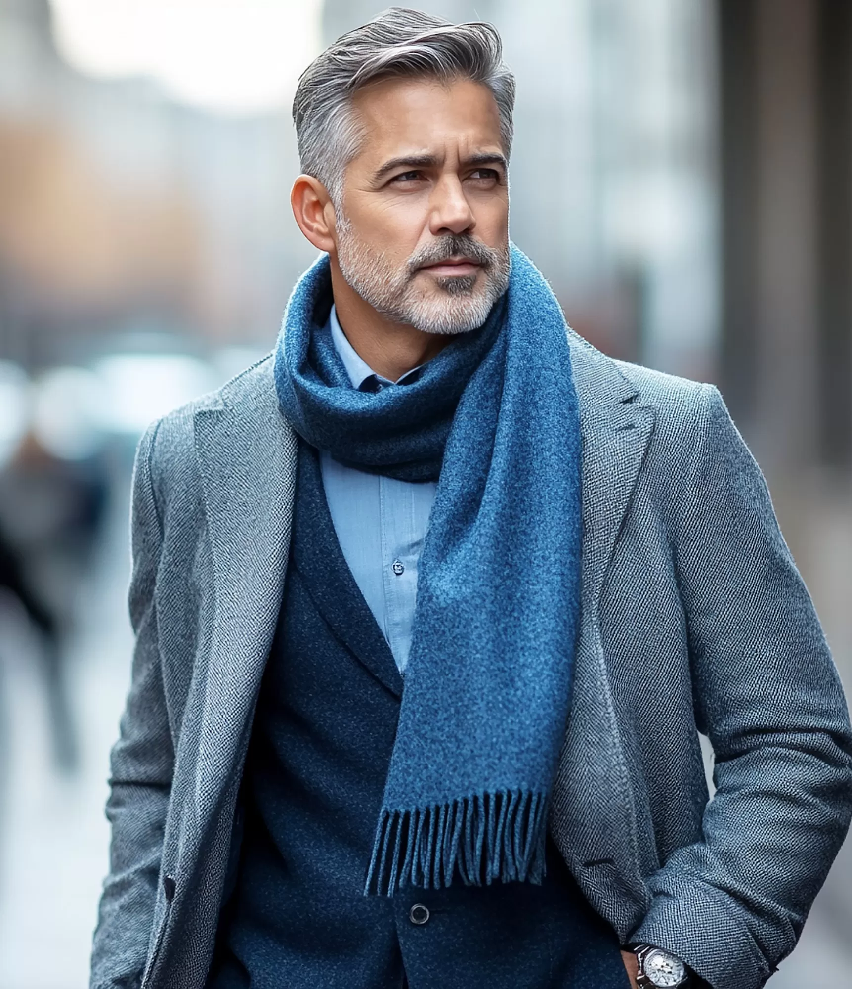 Zilā „Denim Blue“ krāsa ir viena no universālākajām izvēlēm vīriešu garderobē — tā lieliski piestāv jebkuram stilam un piešķir modernu noskaņu gan darbā, gan brīvajā laikā. Tā nav spilgta zila, bet gan niansēts, piesātināts tonis, kas atgādina uzticamo, izturīgo „denim“ sajūtu. Tieši šī nokrāsa padara baby alpaca šalli par izcilu vīrieša stila akcentu: tā piešķir koptēlam izteiktību, raksturu un sakoptību. Zilā šalle lieliski sader ar tumšu vilnas mēteli, pelēkiem vai melniem virsdrēbēm, bet tikpat dabiski iekļaujas arī gaišākos smilšu vai grafīta toņos. Šī krāsa papildina gan klasisku, gan brīvā stila tēlu un palīdz saglabāt harmonisku, solīdu vizuālo līdzsvaru.