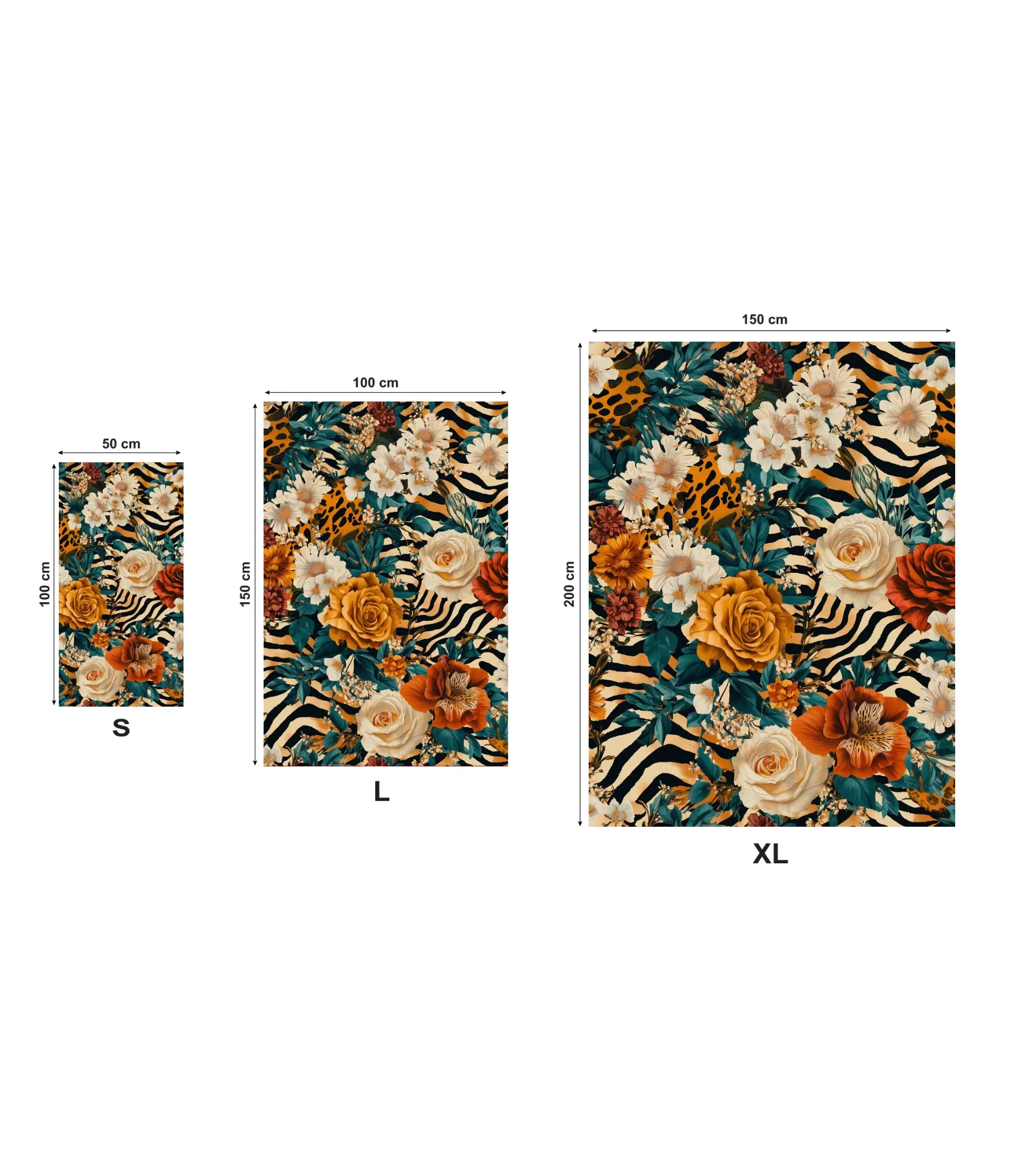 Šti, dubultā slāņašsšsšizceļas ar neparastu dizainu, kurā apvienoti džungļu savvaļas dabas raksti un bagātīgi ziedi, veidojot intensīvu, eksotisku ainavu. Viena rokas puse ir dekorēta ar ziediem un dzīvnieku apļiem – tīģera svītras saplūst ar rožu, margrietiņu un tropu ziedu rotaļām. Krāsas ir drosmīgas un dziļas: bagātīgi oranžas rozes, dedzinātas sarkanās magones, vaniļas baltie ziedi un tumši zaļas lapas izceļas uz dinamiskā fona. Kontrastējošais zebras svītru motīvs vēl vairāk uzlabo iespaidu un piešķir dizainam mežonīgu eleganci. Otra puse – švelnbalta 100% kokvilna, kas paredzēta ērtai škasīšanai. Sakarā ar š slānis, rokaš ne tikai izskatās savādāk, bet ir arī praktisks – uzsūcošs, mīksts un saudzīgs pret ādu. Ideāla izvēle tiem, kas novērtē gan estētiku, gan funkcionalitāti.