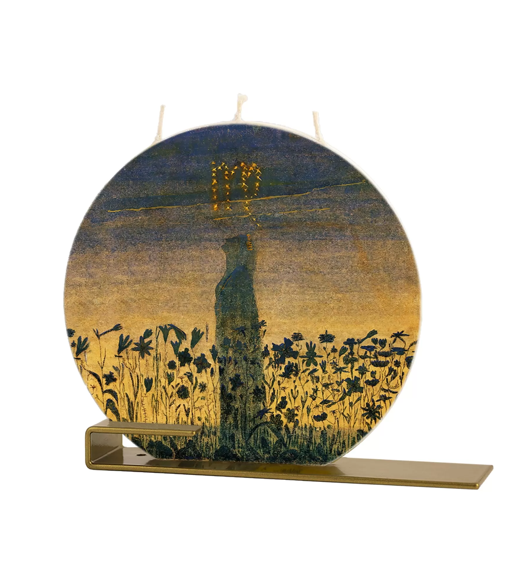 Sakarā ar tās specifiskajiem izmēriem, svece kalpo kā mini mākslas reprodukcija, aizņemot maz vietas, vienlaikus kļūstot par izteiksmīgu dekoru akcentu. Produktam ir trīs kokvilnas knaibles, radot unikālu liesmas kompozīciju. Katrs knaibles nodrošina mierīgu un drošu degšanu līdz 4 stundām. Ražots Lietuvā no nesmaržīgas parafīna, tas ir ideāli piemērots tiem, kas meklē vizuālu baudījumu bez novērsto aromātu. Roku darbs tērauda statīvs pievieno industriālu modernitāti svecei un garantē stabilitāti pret jebkuru interjera fonu.
