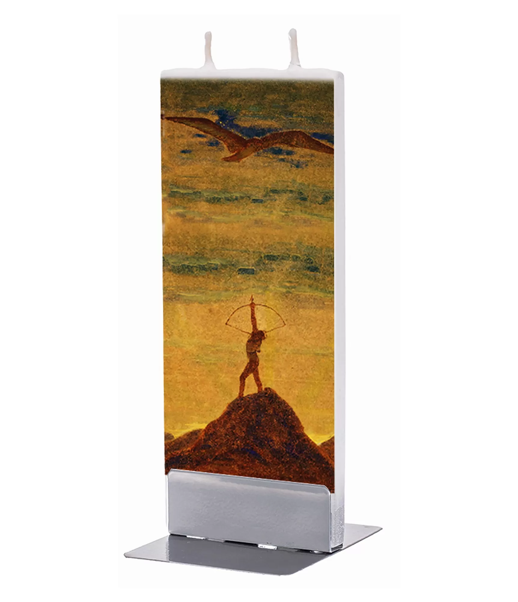 Stilīgā svece "Zodiaks Strēlnieks 09" iemieso nepārtrauktu zināšanu alkas un garīgu tieksmi, apvienojot leģendāro M. K. Čiurlionis talantu ar mūsdienīgu interjera formu. Šis roku darbs, dekorēts ar "Zodiaks" cikla motīviem, piedāvā minimālistisku plakanu siluetu, kas piešķir izsmalcinātu modernitāti jebkurai telpai. Ražots Lietuvā no augstas kvalitātes parafīna, šis oriģinālais interjera elements ir 6 x 1 x 15 cm liels un ietver divus kokvilnas knaģus un elegantu tērauda statīvu, nodrošinot stabilu un mierīgu degšanu līdz 4 stundām.