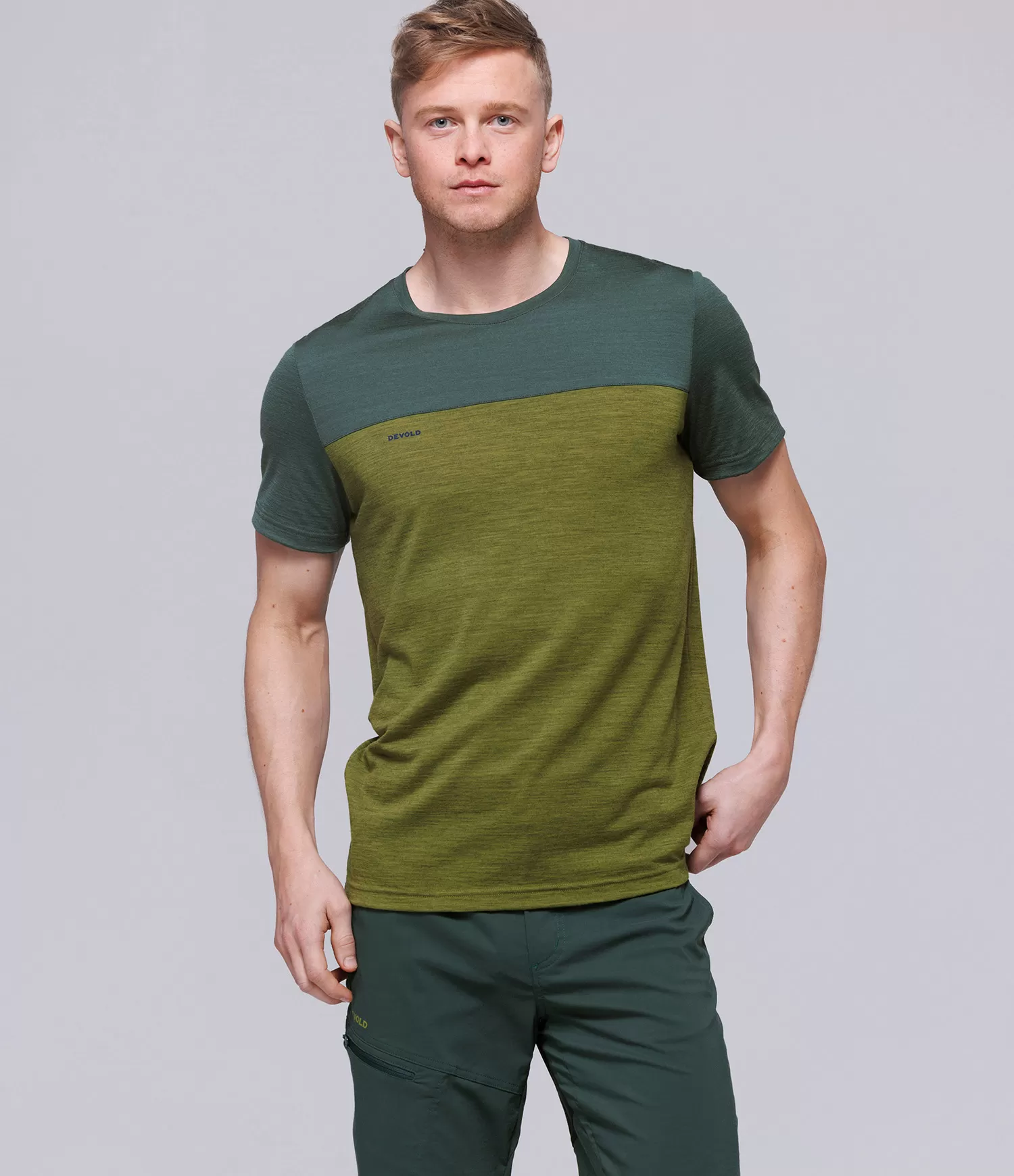 Devold Norang kolekcija radīta, lai apvienotu brīvā laika modi, vieglumu un dabisko merino vilnas funkcionalitāti. Attēlā redzamais Woods/Green melange T-krekls uzreiz izceļas ar modernu divu toņu dizainu – augšējā daļa ir piesātināti zaļa, bet T-krekla korpuss pāriet gaišākā, svaigā zaļā tonī. Šī krāsu kombinācija piešķir stilīgu, sportisku tēlu, kas lieliski piemērots gan ikdienai, gan aktīvai atpūtai.