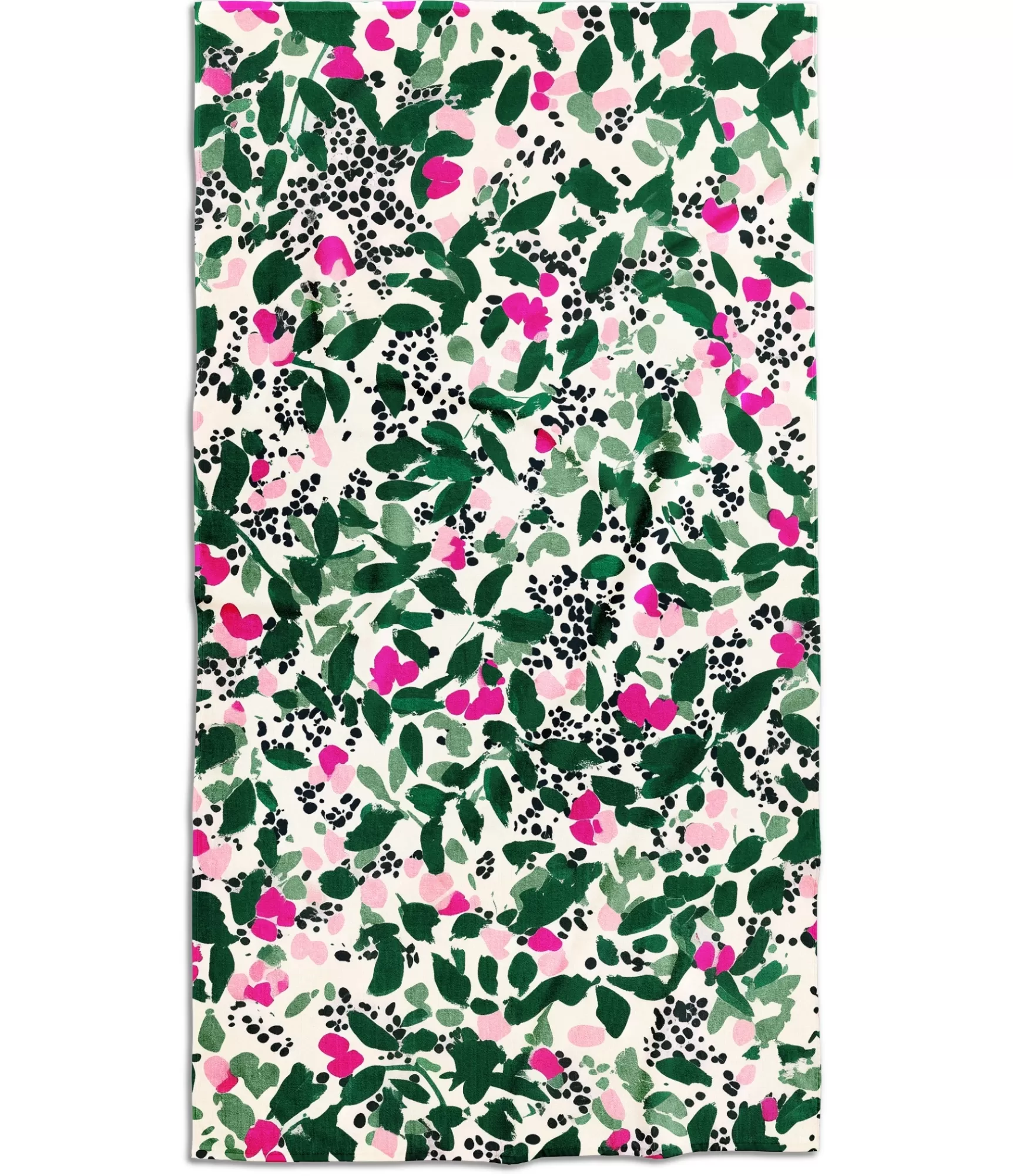 Krāsains vannas istabas dvielis ar zaļām un rozā krāsām.