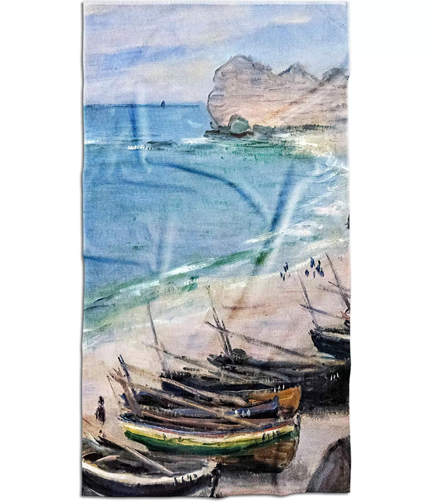 , iedvesmojoties no Monē – tie kļūst ne tikai par praktisku lietu, bet arī par mākslas ikdienas pieskārienu. Šis handšlosti attēlo piejūras ainavu, kas veidota Kloda Monē stilā – š velnišķīgas krāsas, trausli triepieni, mieru izstarojoša jūrmala. Acis piesaista senās koka zvejnieku laivas, kas mierīgi novietotas krastā, ko ieskauj pasteļkrāsas smiltis, kas atspoguļo lejupejošā vēja spēli. Fonā – šgaiši purpursarkanās klinšu kontūras un vienmērīgā jūras zilā krāsa, kas stiepjas līdz pat horizontam. Visa kompozīcija rada klusuma, miera un vienkāršas klātbūtnes atmosfēru.