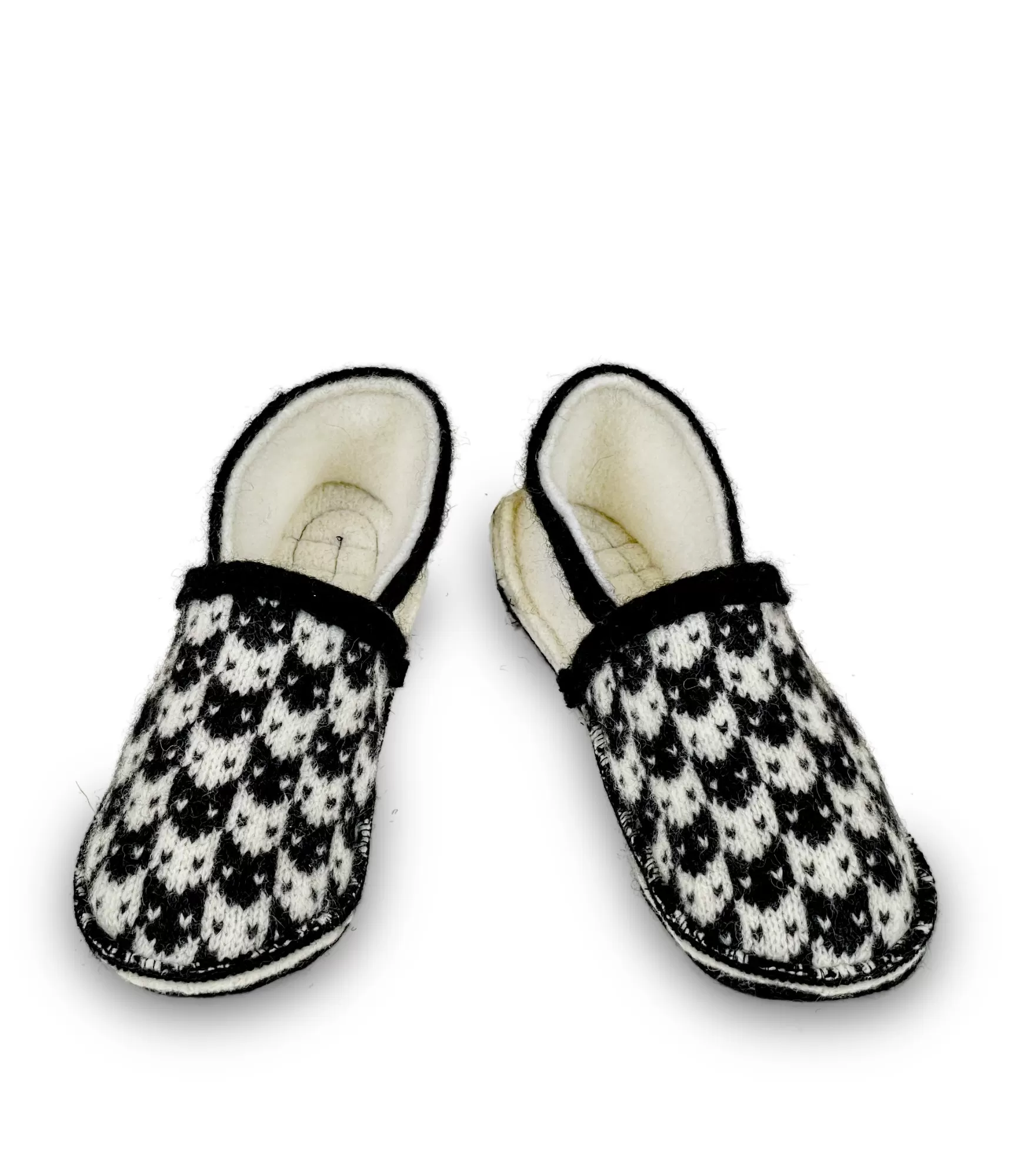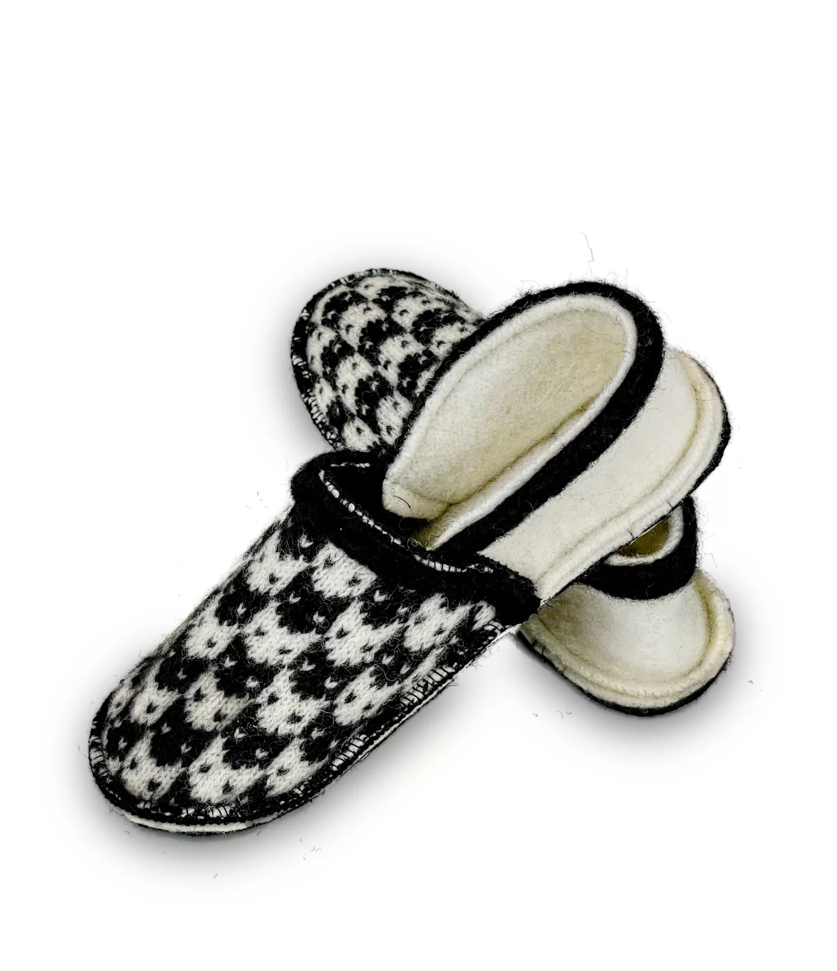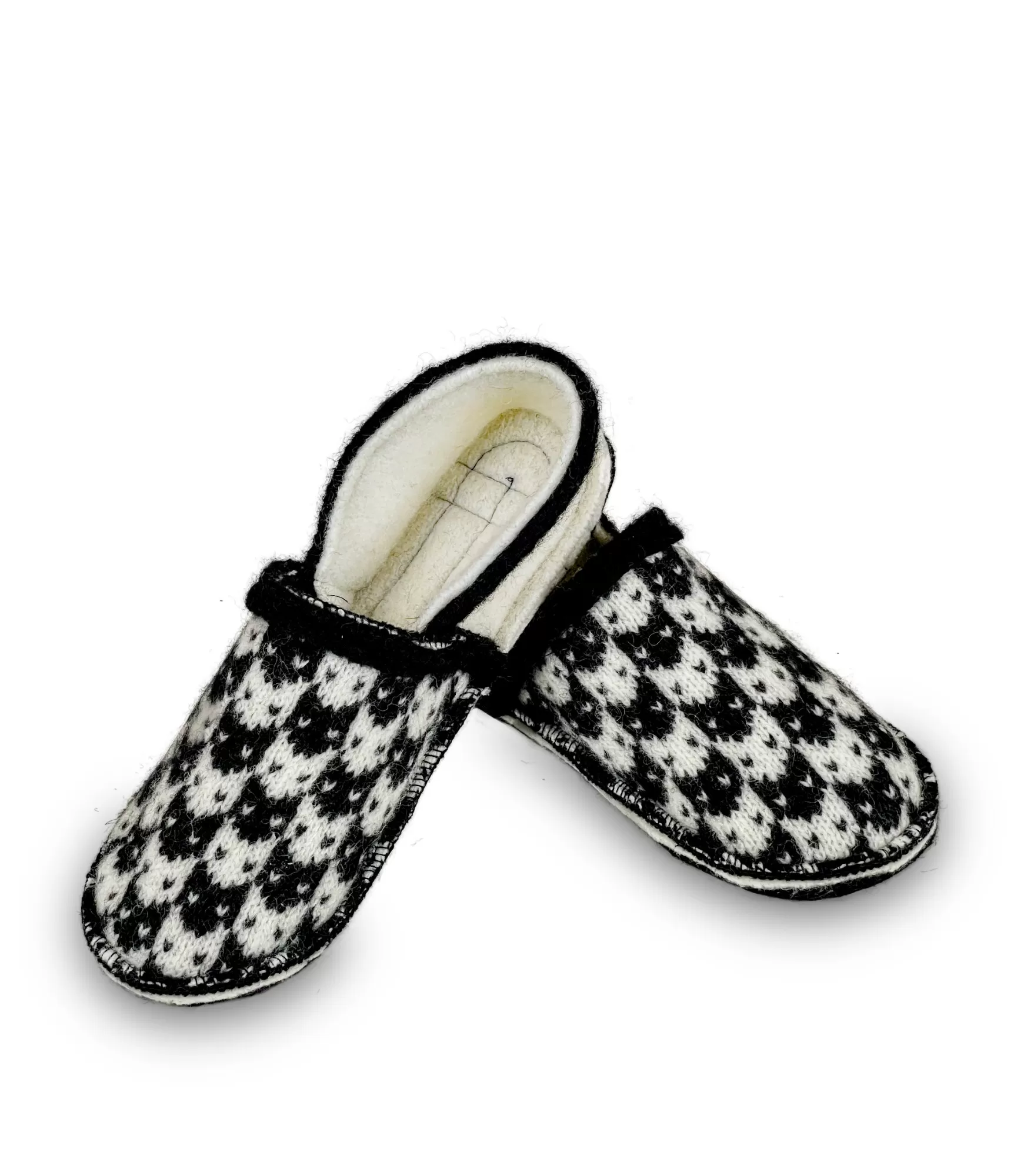 Dizains atgādina tradicionālo melnbalto riteni, kurā ir redzami smalki kaķu motīvi. Tas ir kā lietuviešu adījumu ornamentu turpinājums, kas pārnests uz mūsdienīgu izstrādājumu. Klasiskā krāsu kombinācija piestāv jebkuram interjeram, tāpēc špetets kļūst ne tikai šiluma šalt, bet arī par sakoptu, minimālistisku mājas akcentu. Iekšpuse ir balta, mīksta un velnišķīga, labi pieguļ pēdai, un melnās malas piešķir tai stingrāku formu.