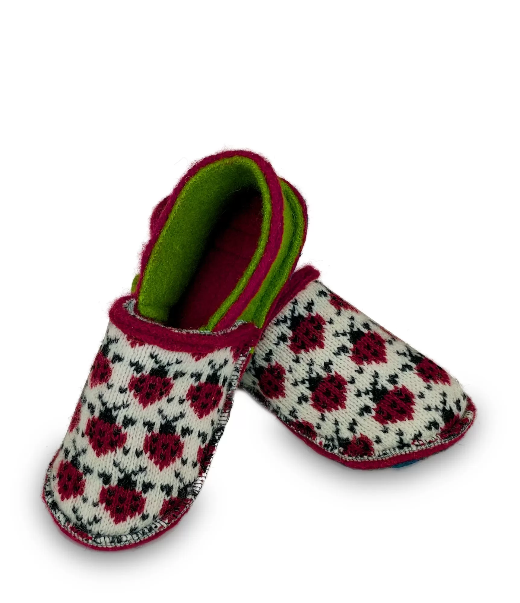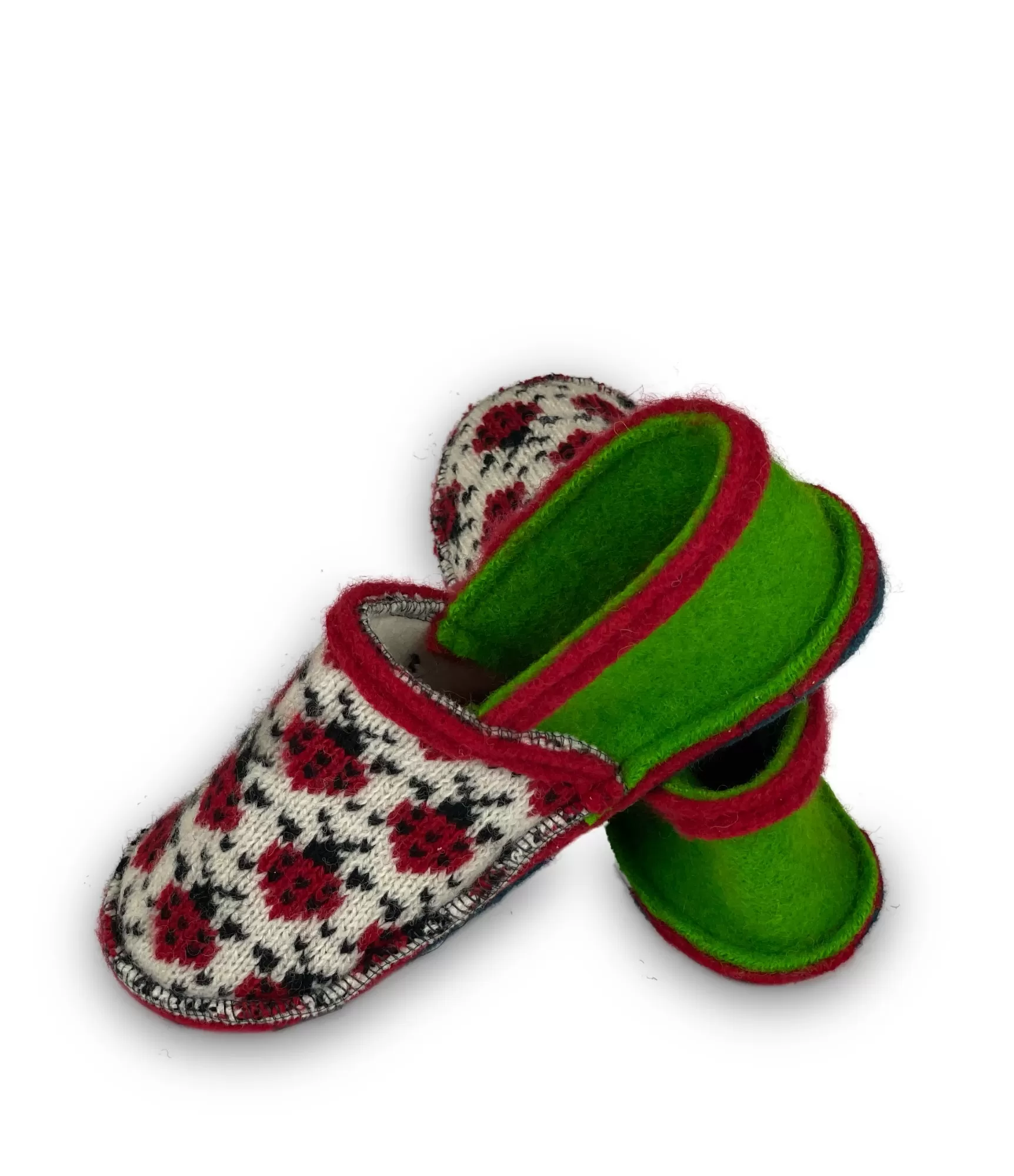 šapavu iekšpuse ir mīksta un mājīga, šideāli pieguļ pēdai, savukārt zaļā iekšējā daļa piešķir kontrastu unšatšķirību. Zole – vilna, kas papildināta ar neslīdošām sloksnēm, tāpēc čības ir drošas valkāšanai uz dažādām grīdas virsmām. Tie kalpo uzticami katru dienu un ir ērti pat pēc ilgstošas valkāšanas.
