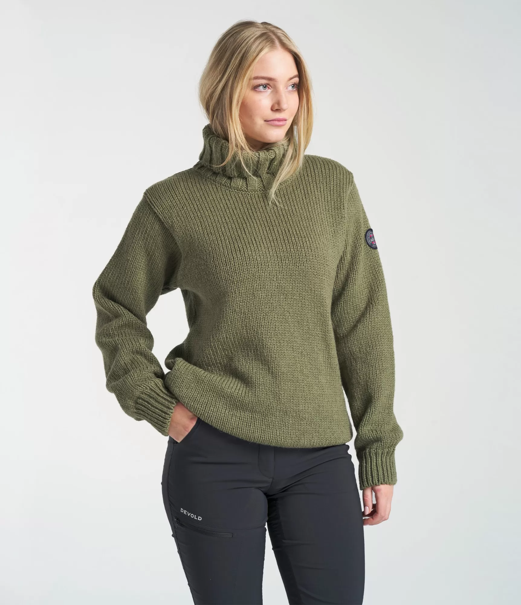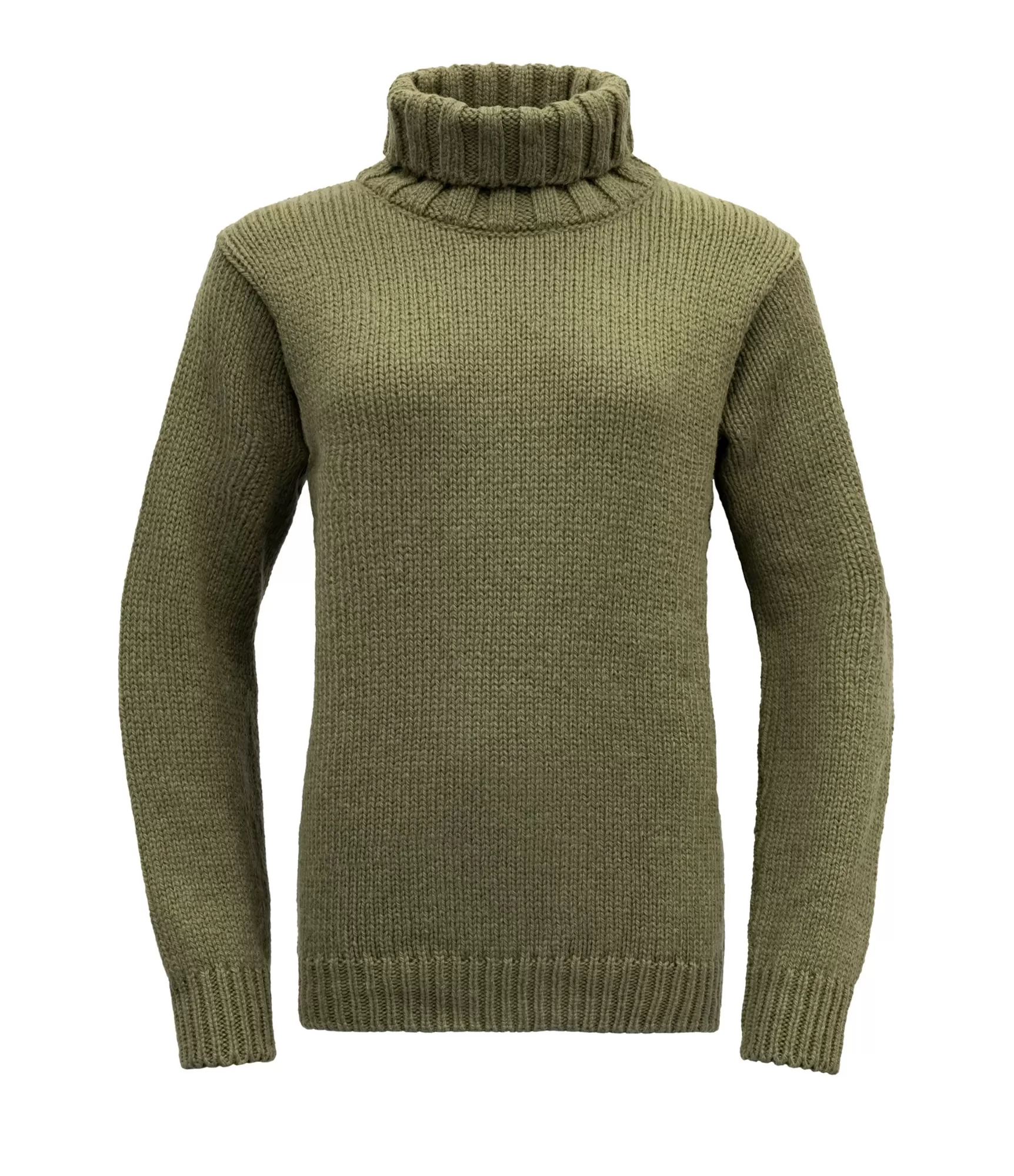 Sieviešu Devold vilnas džemperis ar augstu apkakli olīvu krāsā.